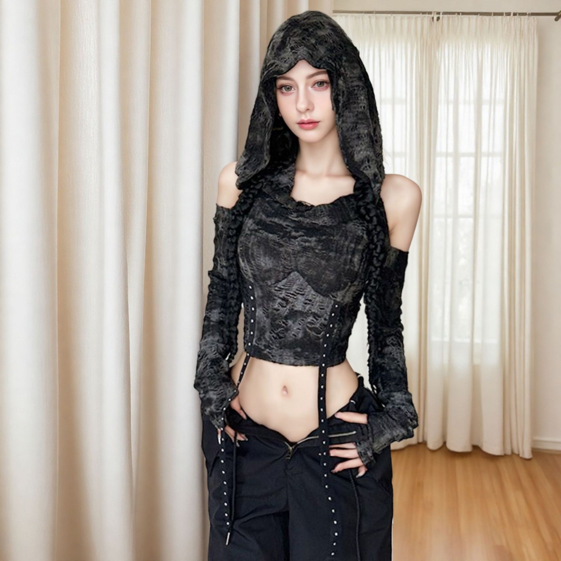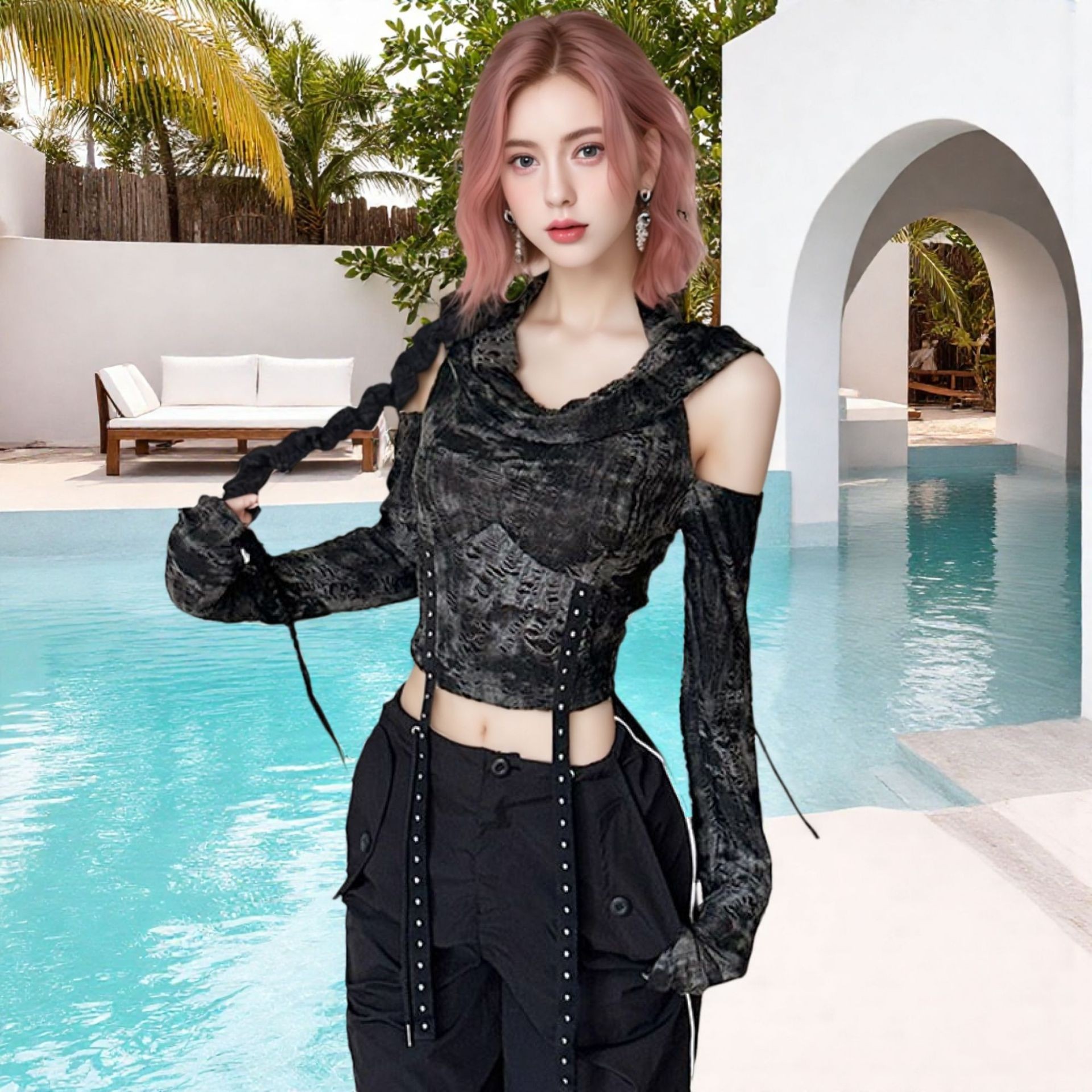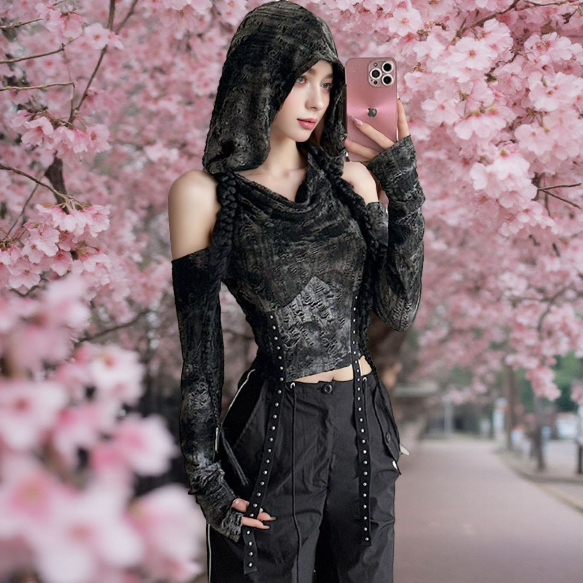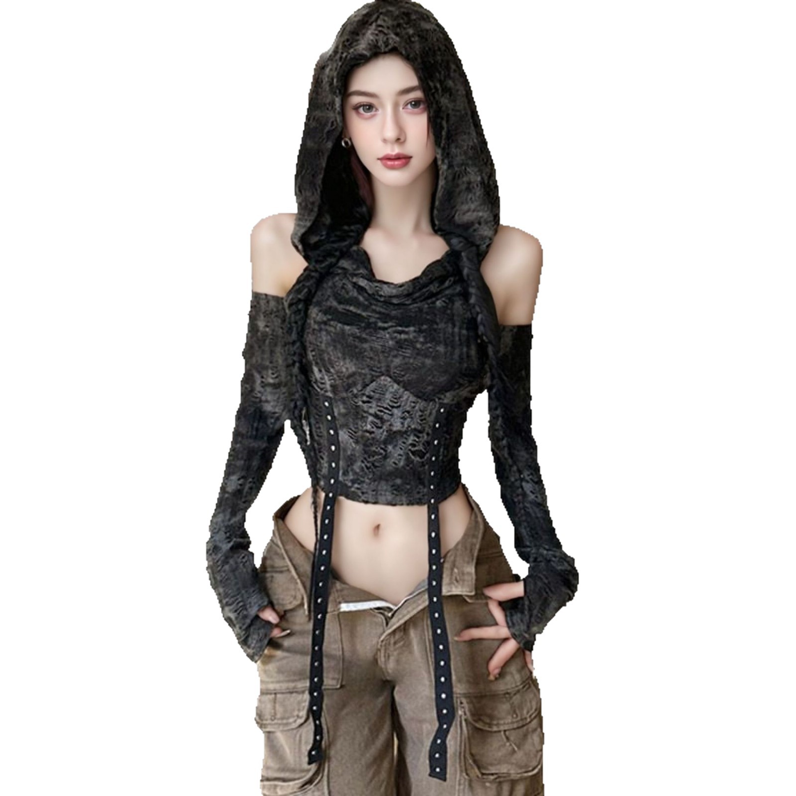 Трансграничный 2024 новый пустошь ветер ручной работы с капюшоном с открытыми плечами футболка с длинными рукавами женская тонкая индивидуальная короткая топ