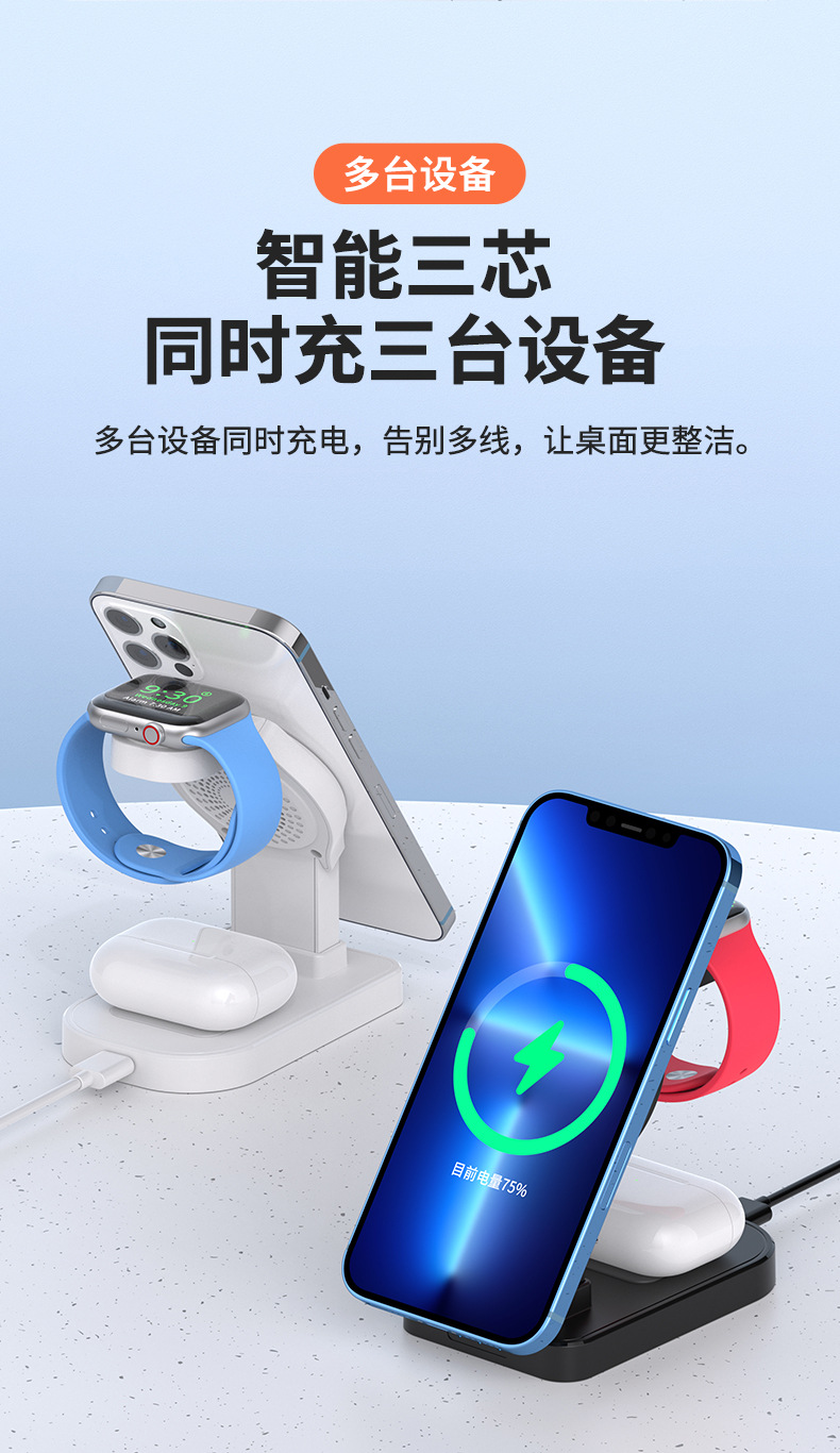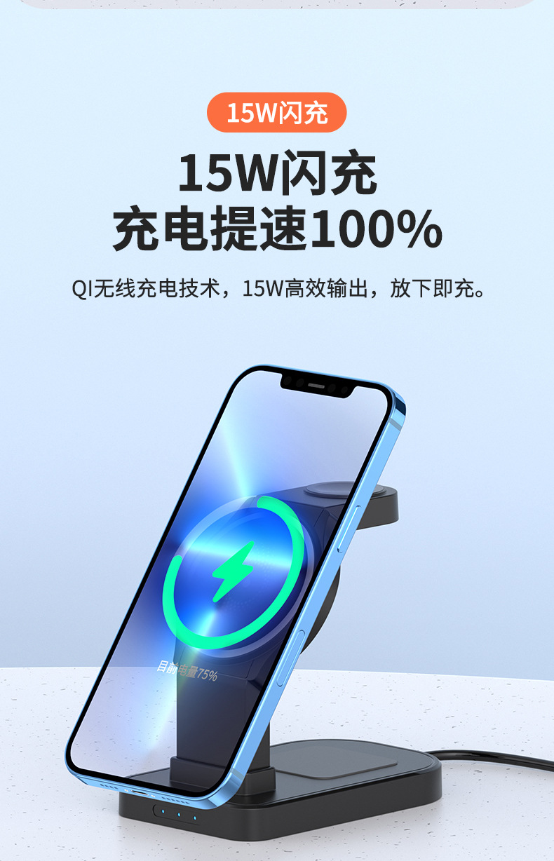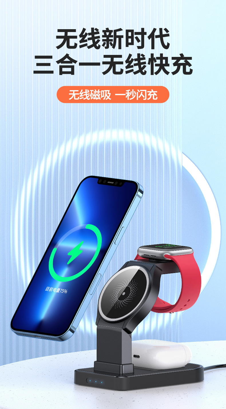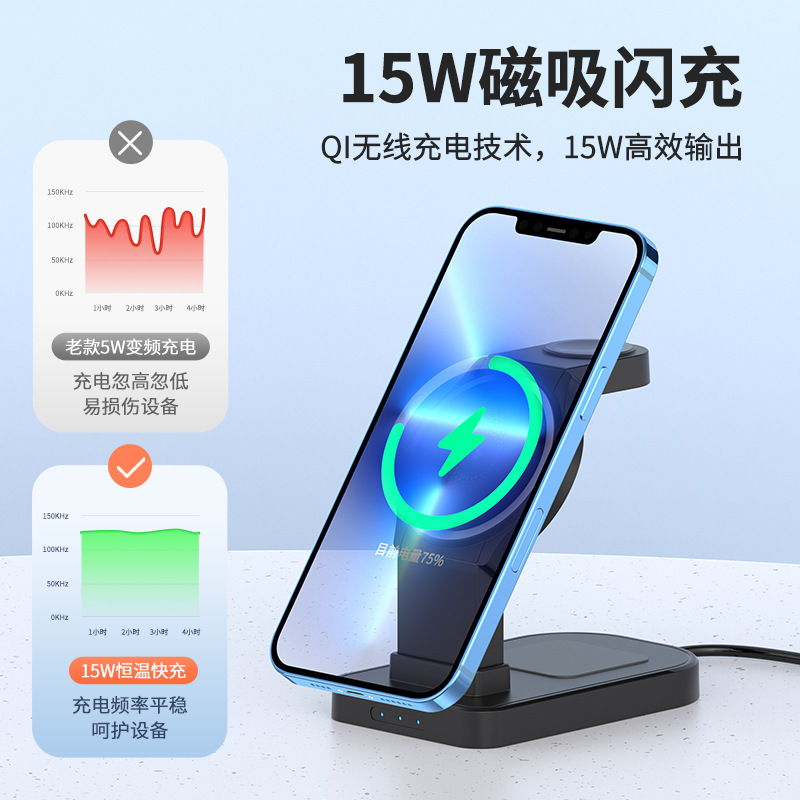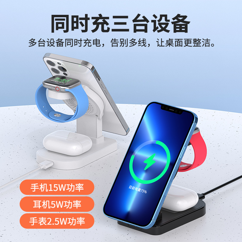 15W Магнитное беспроводное зарядное устройство быстрая зарядка три в одном подходит для Apple 15/14 мобильный телефон наушники часы вертикальный кронштейн