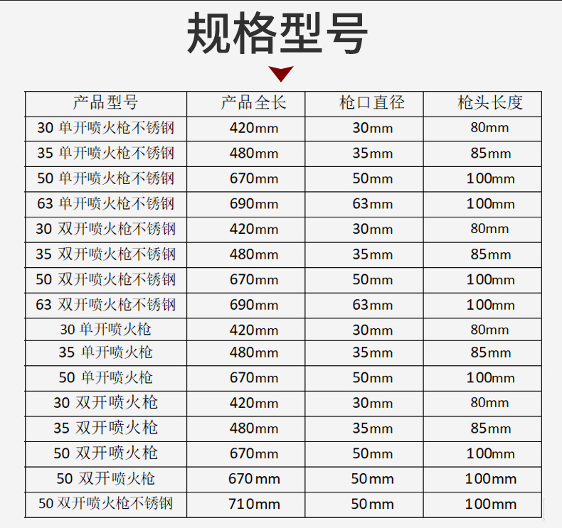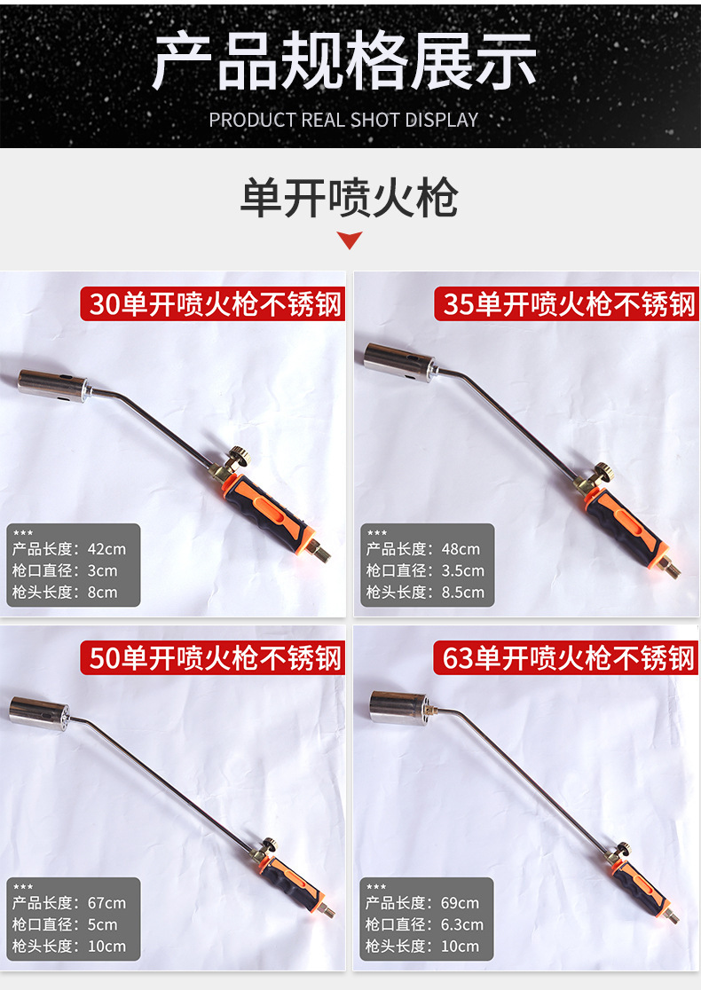Быстросъемный горелка из нержавеющей стали с одним отверстием диаметром 30 мм; Быстросъемный пламенный пистолет с одним отверстием 35 из нержавеющей стали; Быстросъемный пламенный пистолет с одним отверстием диаметром 50 мм — нержавеющая сталь; Быстросъемный горелка с одним отверстием диаметром 63 мм, нержавеющая сталь; Быстросъемный двойной отвод для пламегенератора из нержавеющей стали 30; Быстросъемный двойной отверстный распылитель пламени 35 из нержавеющей стали; Быстросъемный двухсторонний пламенный пистолет из нержавеющей стали 50; Быстросъемный двухсторонний пламенный пистолет 63 из нержавеющей стали; Быстросъемный пламенный пистолет с одним отверстием, 30; Быстросъемный пламенный пистолет с одним отверстием калибра .35; Быстросъемный пламенный пистолет с одним отверстием диаметром 50 мм; Быстросъемный двойной отверстный пиротехнический генератор .30; Быстросъемный двойной отверстный пиротехнический генератор .35; Быстросъемный двухсторонний пиротехнический генератор 50; Двойной огнемет на 50 маленьких голов; 50-секционный двойной открытый пиротехнический фейерверк