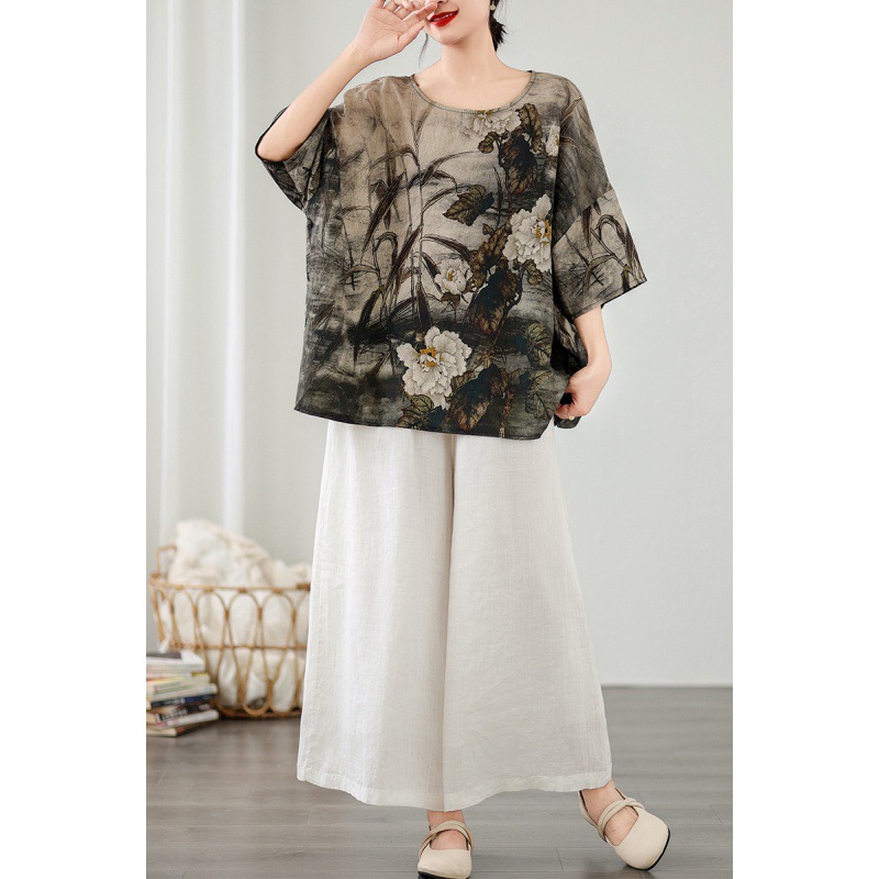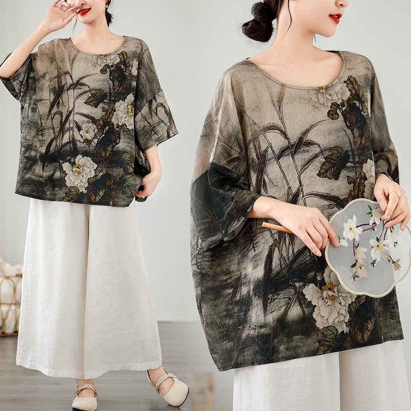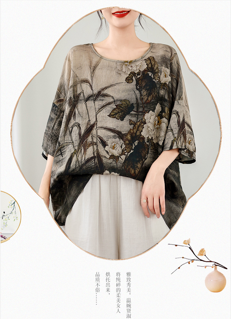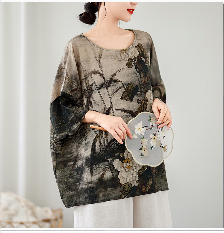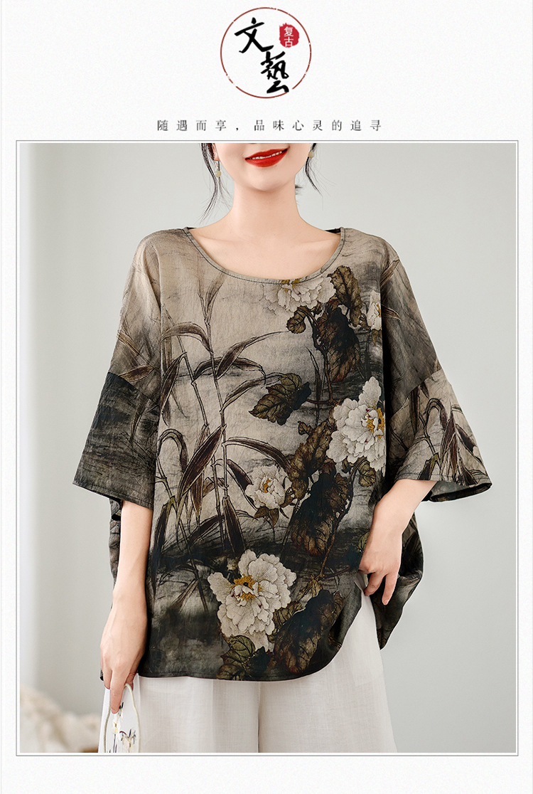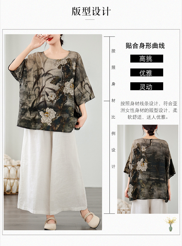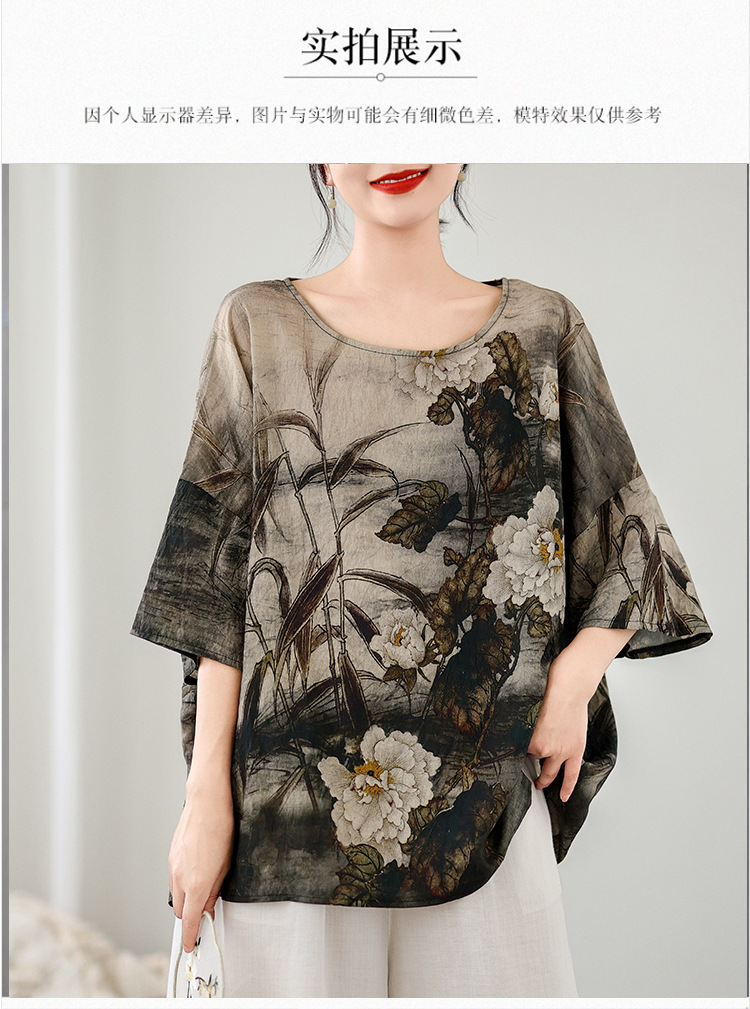 На самом деле 2024 новый летний хлопок конопли национальный ветер летучая мышь рукава 91755 # свободная большая женская футболка с круглым вырезом