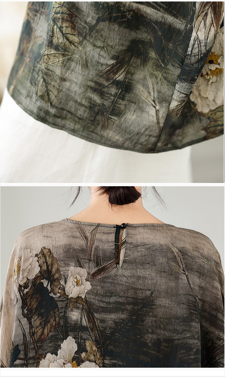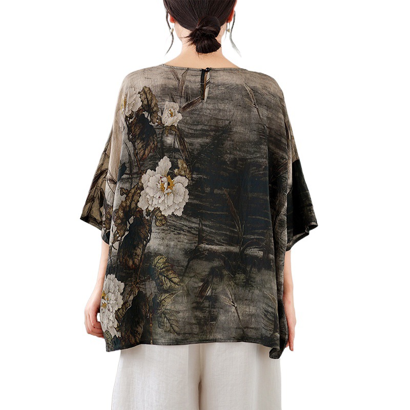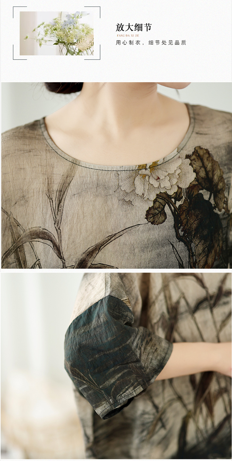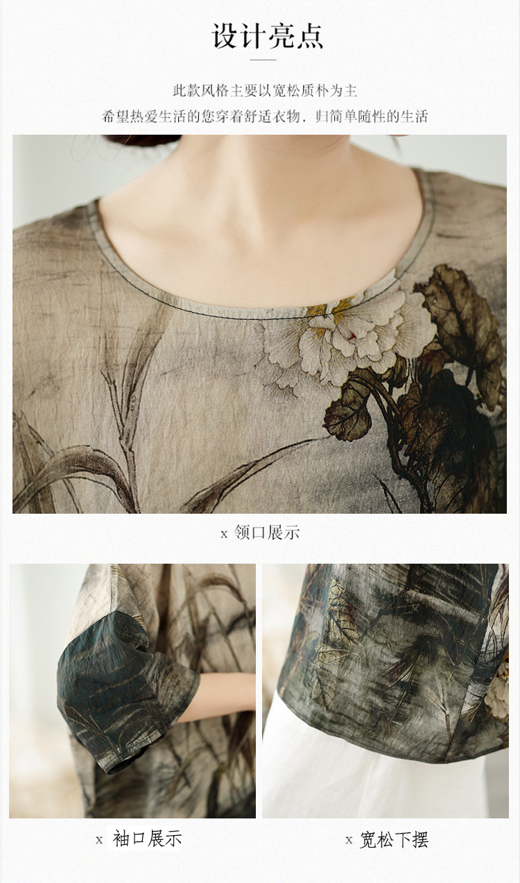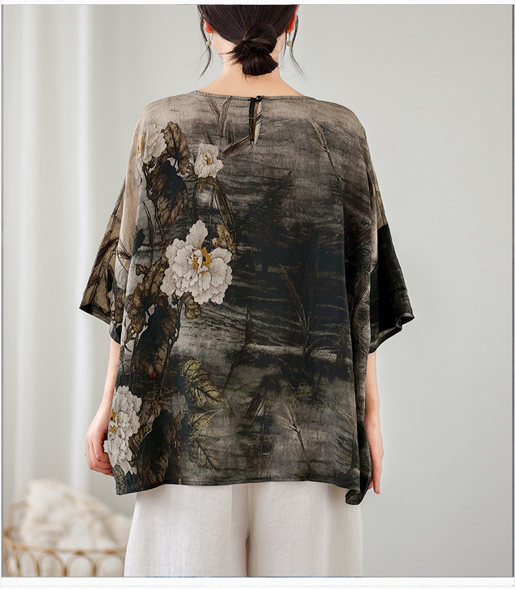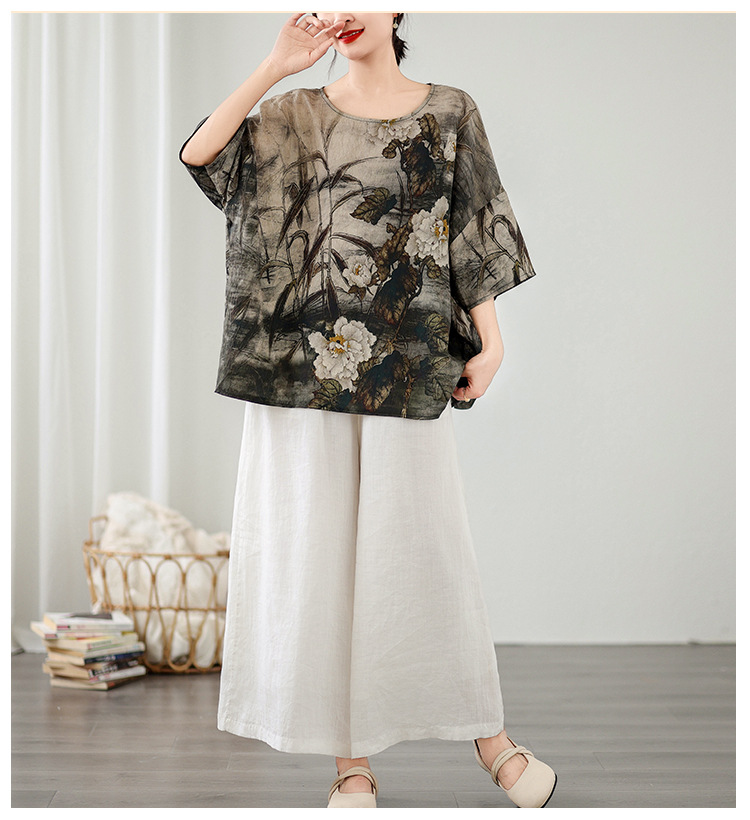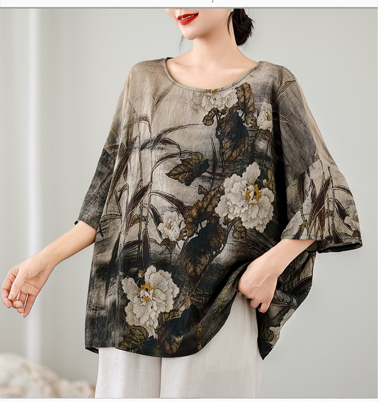 На самом деле 2024 новый летний хлопок конопли национальный ветер летучая мышь рукава 91755 # свободная большая женская футболка с круглым вырезом