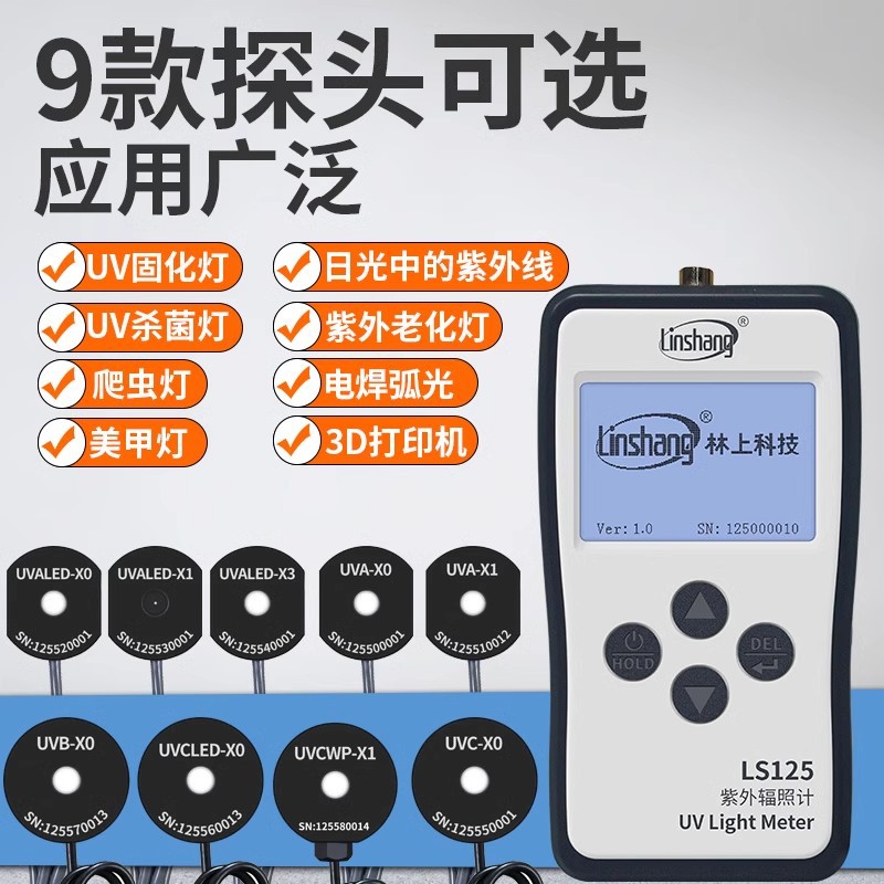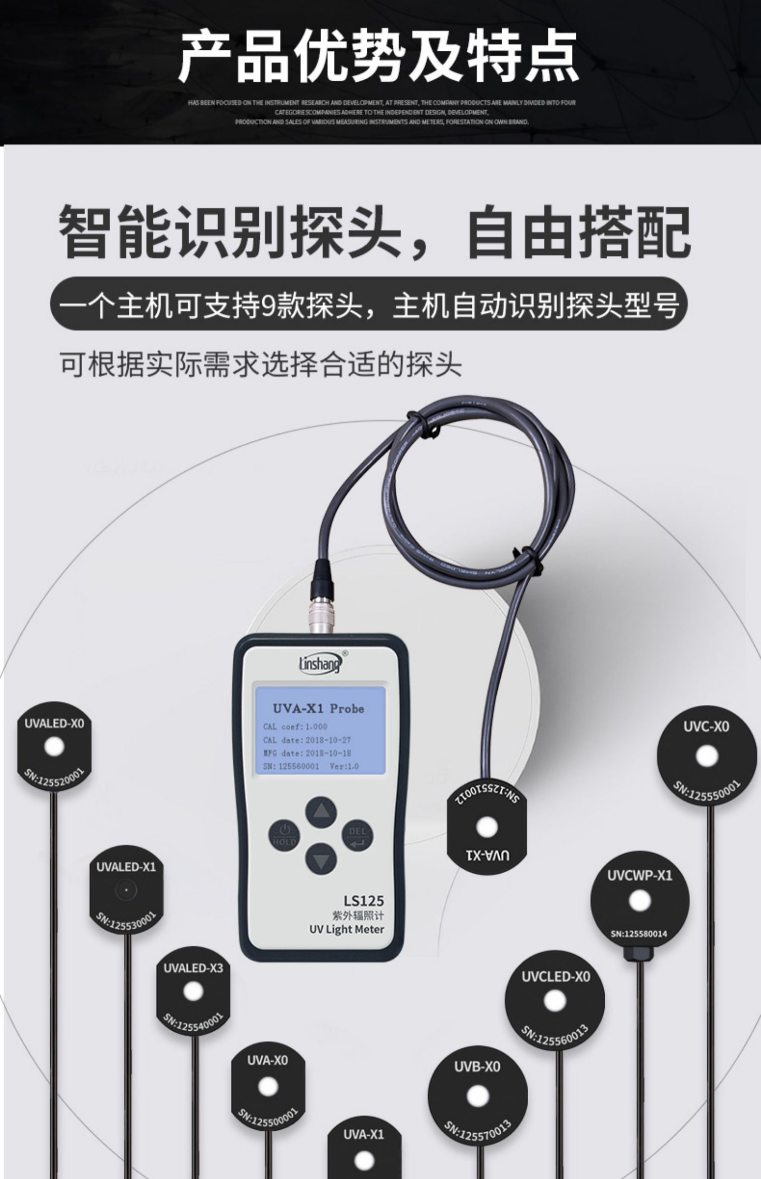 LS125 UVC-X0 (Весь) 230-280nm; LS125 UVCWP-X1 (Весь) 230-280nm; LS125 UVCLED-X0 (весь) 260-285nmLED стерилизация; LS125 UVB-X0 (полный) 280-315nm; LS125 UVA-X0 (весь) 315-400nm Высокая мощность; LS125 UVA-X1 (весь) 315-400nm Малая мощность; LS125 UVALED-X0 (весь) 340-420nm Высокая мощность; LS125 UVALED-X1 (весь) 340-420nm точечный источник света; LS125 UVALED-X3 (весь) 340-420nm Малый; LS126A (сверхмаленький зонд) 340-420nm; UVCLED-X0 (одиночный зонд); UVC-X0 (одиночный зонд); UVCWP-X1 (одиночный зонд); UVB-X0 (одиночный зонд); UVA-X0 (одиночный зонд); UVA-X1 (одиночный зонд); UVALED-X0 (одиночный зонд); UVALED-X1 (одиночный зонд); UVALED-X3 (одиночный зонд); LS125 хост (один хост)