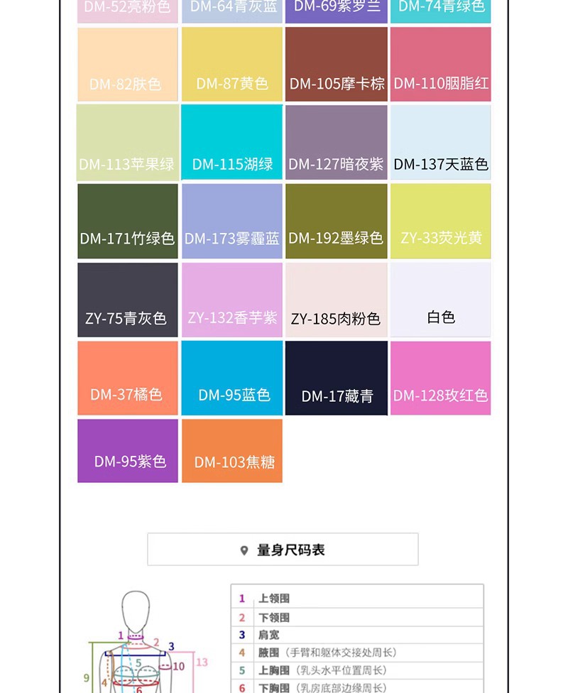 Бамбуковый зеленый длинный рукав; Кармин с длинными рукавами; Мясо розовый с длинными рукавами; Фиолетовый длинный рукав; Карамельный цвет с длинными рукавами; Бирюзовый длинный рукав; Тибетский синий длинный рукав; Синий длинный рукав; Лазурный длинный рукав; Розовый длинный рукав; Таро фиолетовый с длинными рукавами; Дымка синий длинный рукав; Озеро зеленый длинный рукав; Королевский синий длинный рукав; Королевский синий средний рукав; Таро фиолетовый средний рукав; Небесно-голубой средний рукав; Ярко-розовый средний рукав; Озеро зеленый средний рукав; Дымка синий средний рукав