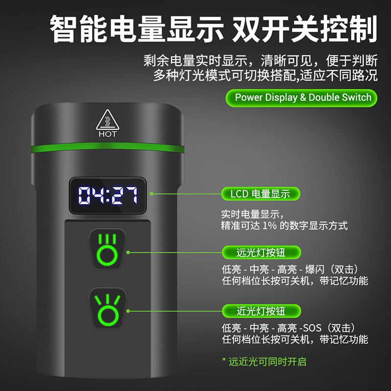 发光档位:远光:低亮(10.5H-中亮(6H)-高亮(3.5H),双击爆闪。近光;低亮(10H)-中亮(6H)-高亮(3.5H),双击SOS 在任意档位长按2秒关机,带记忆功能