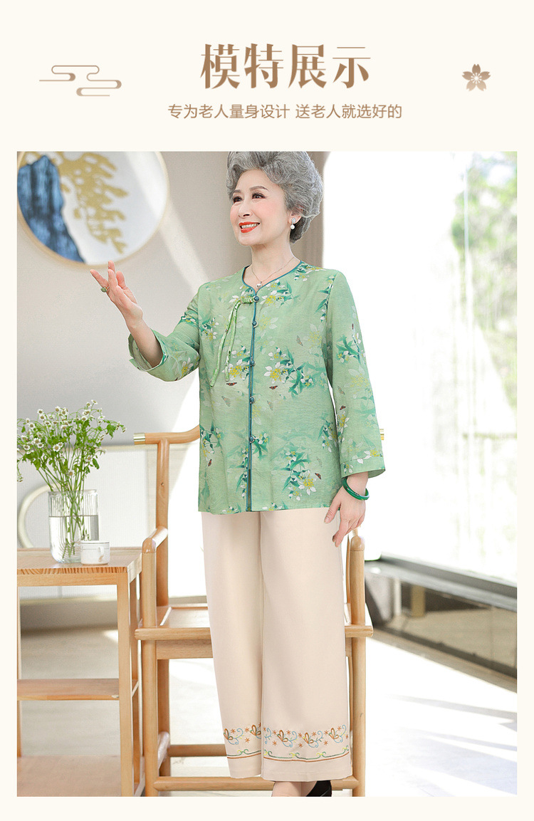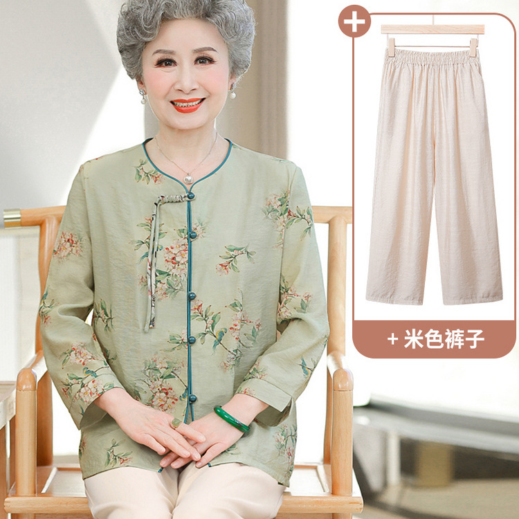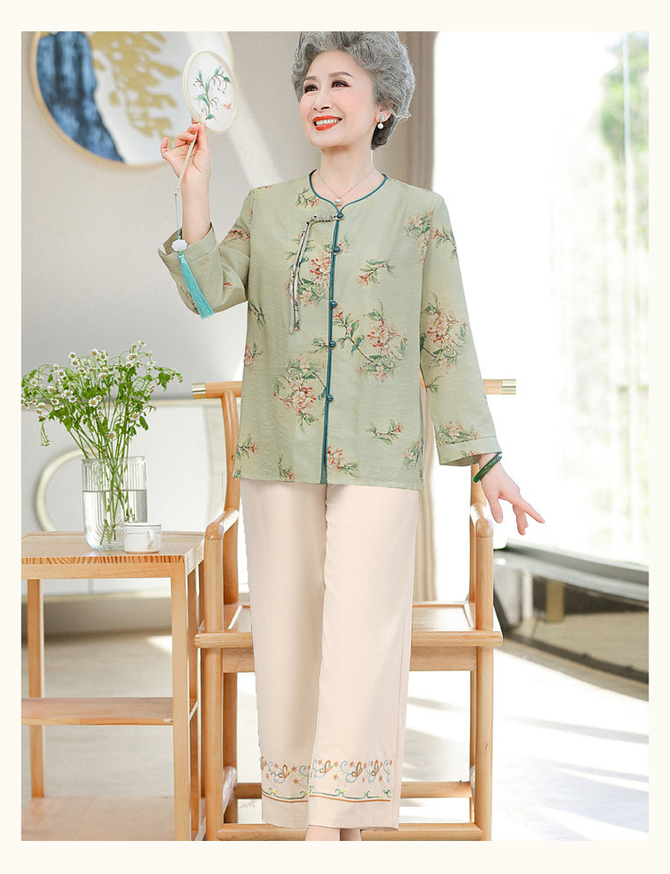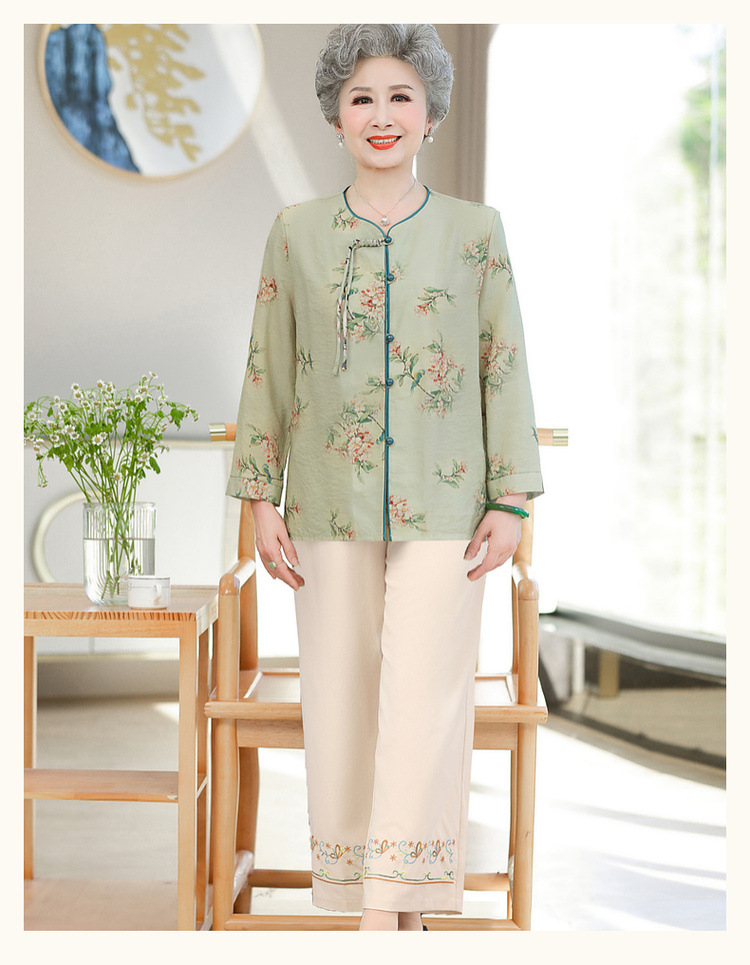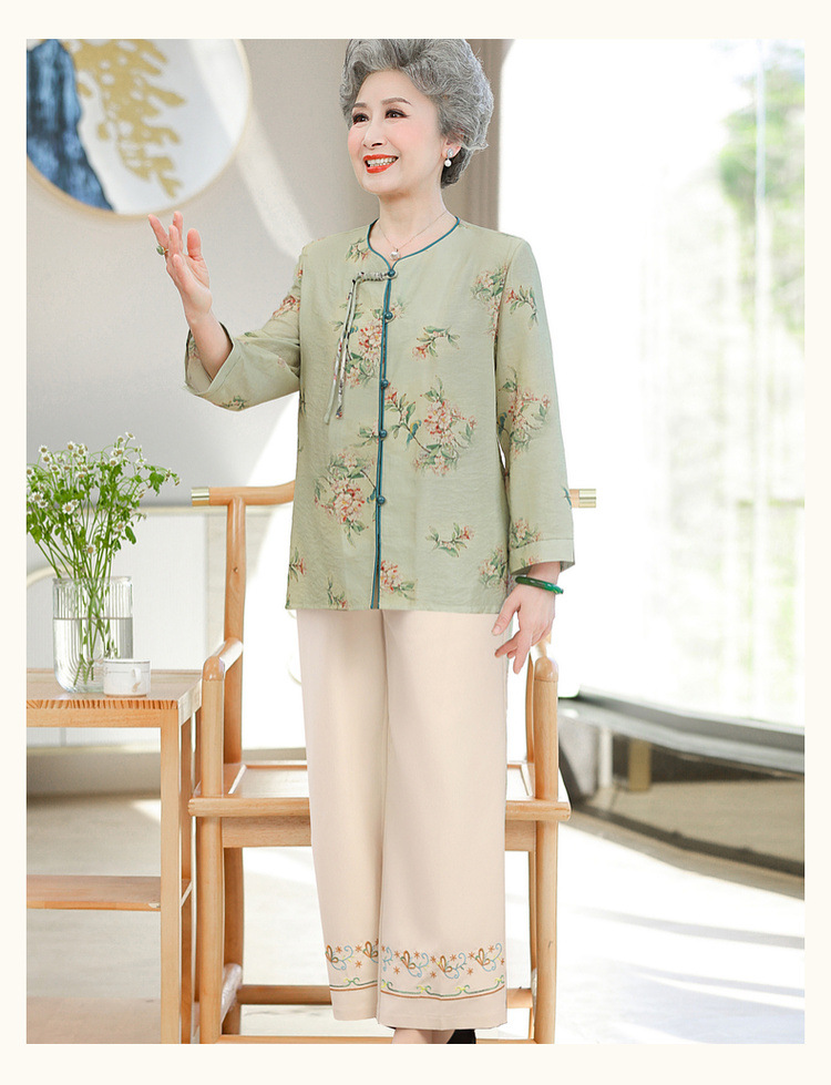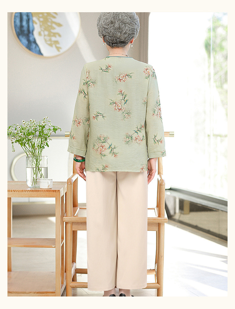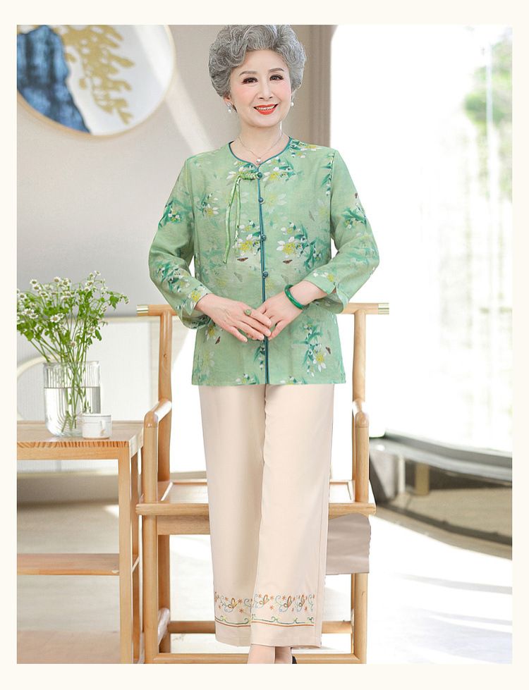 Мама одеваются весной и летом набор 2024 новые вышитые пуговицы топ брюки свободные удобные круглые воротники с длинными рукавами