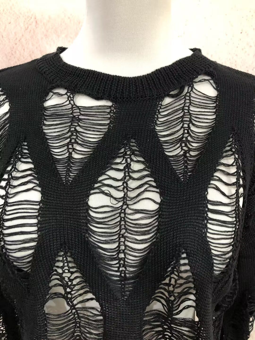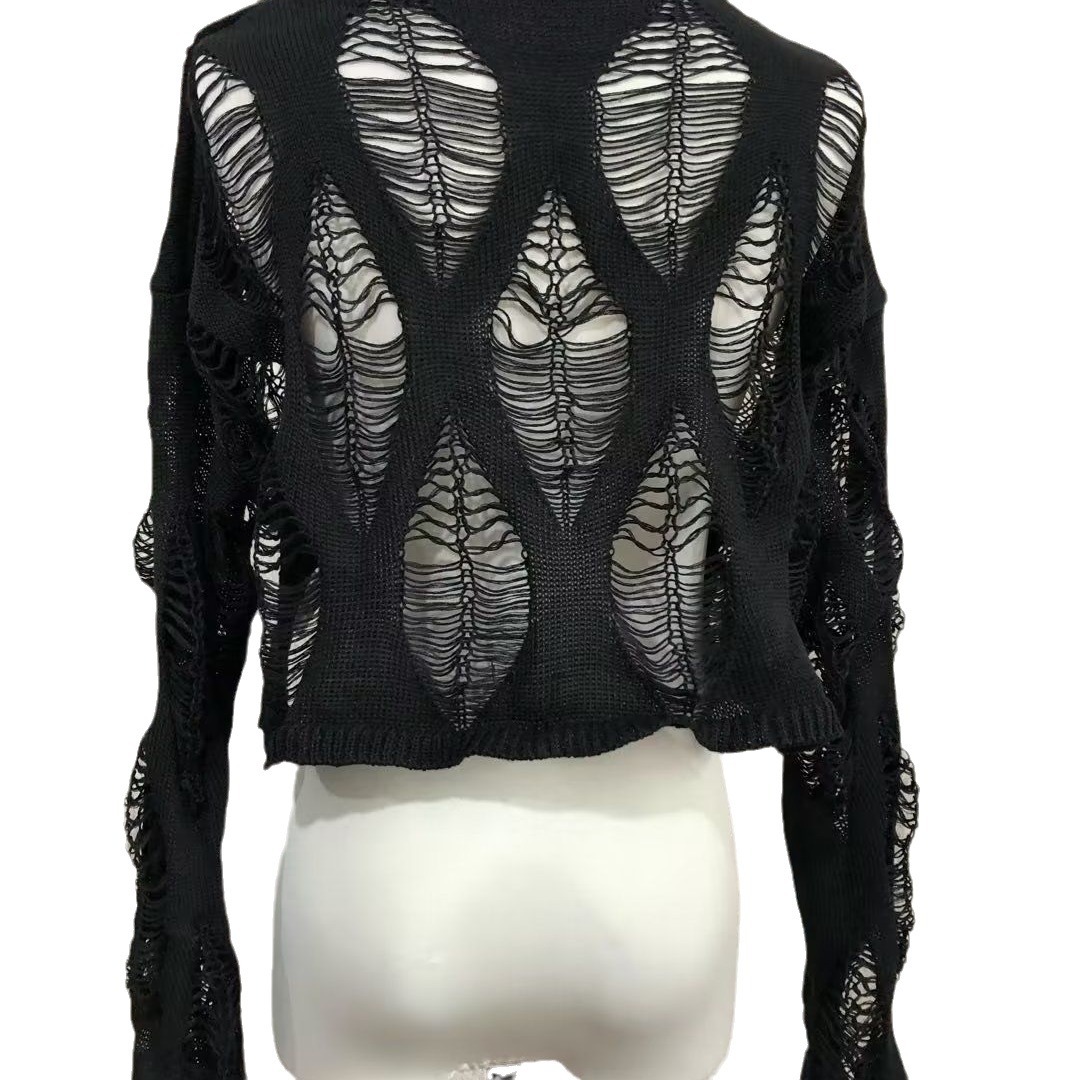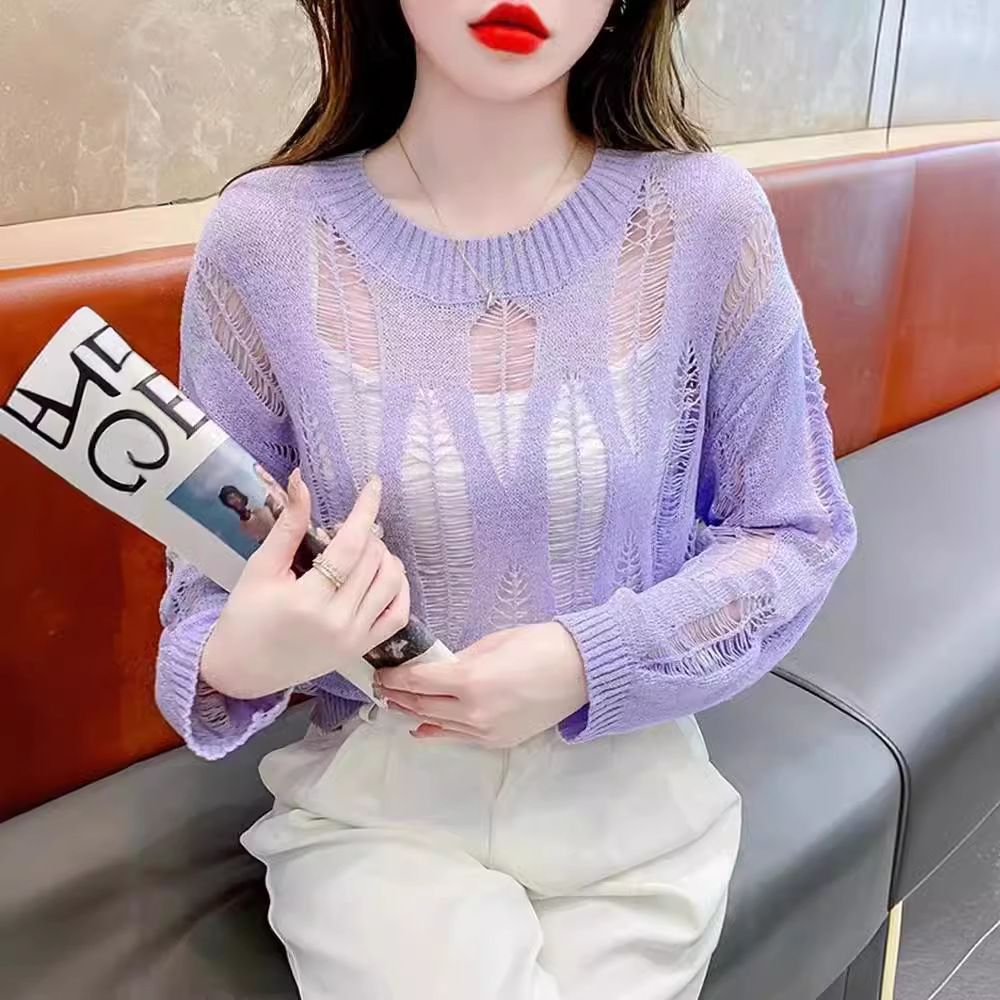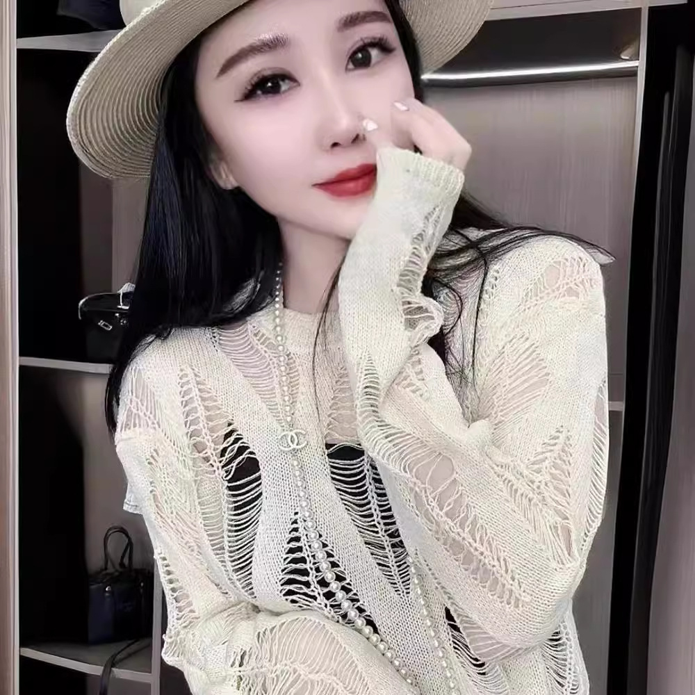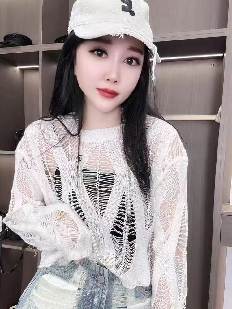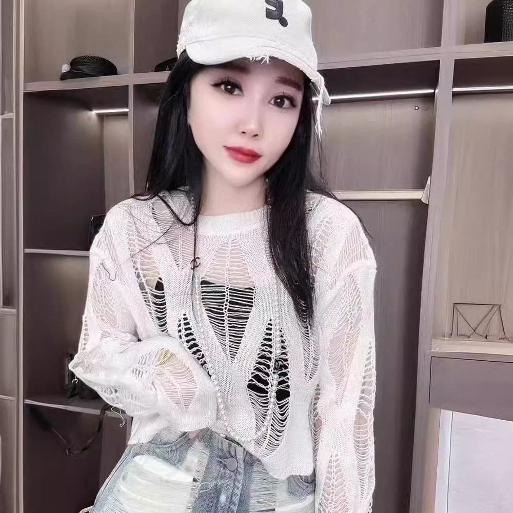 Весна-осень 2025. Новая европейская и американская женская мода. Сексуальный свободный укороченный вязаный свитер с ажурной отделкой.