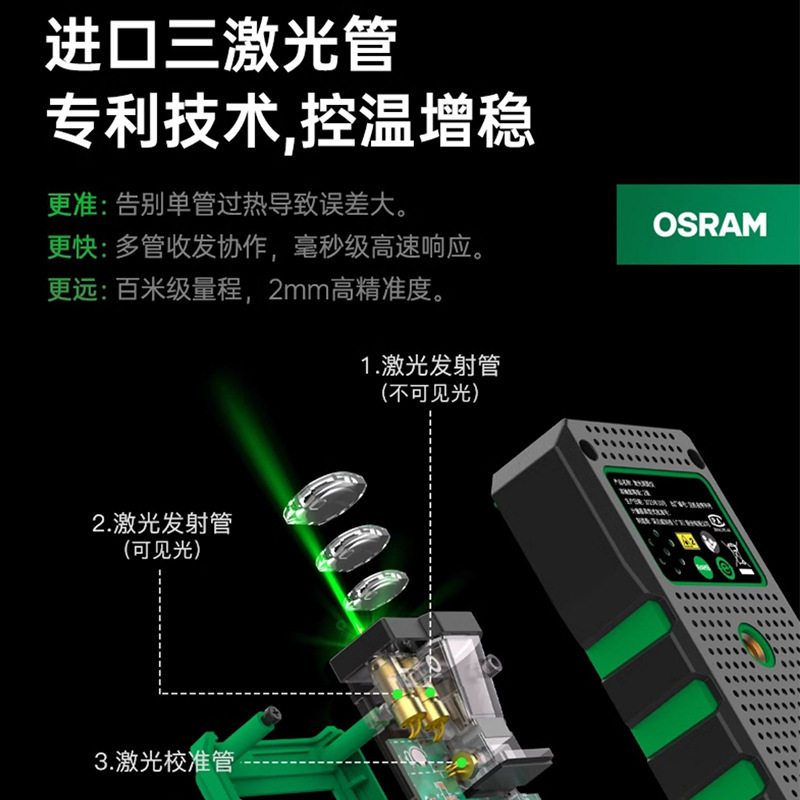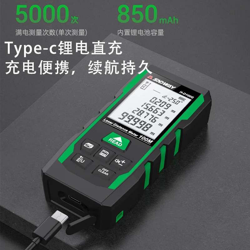 850mAH内置锂电池,语音播报,电子角度,测角测高,面积,体积,勾股定理测量,2.2高清大屏,99笔存储