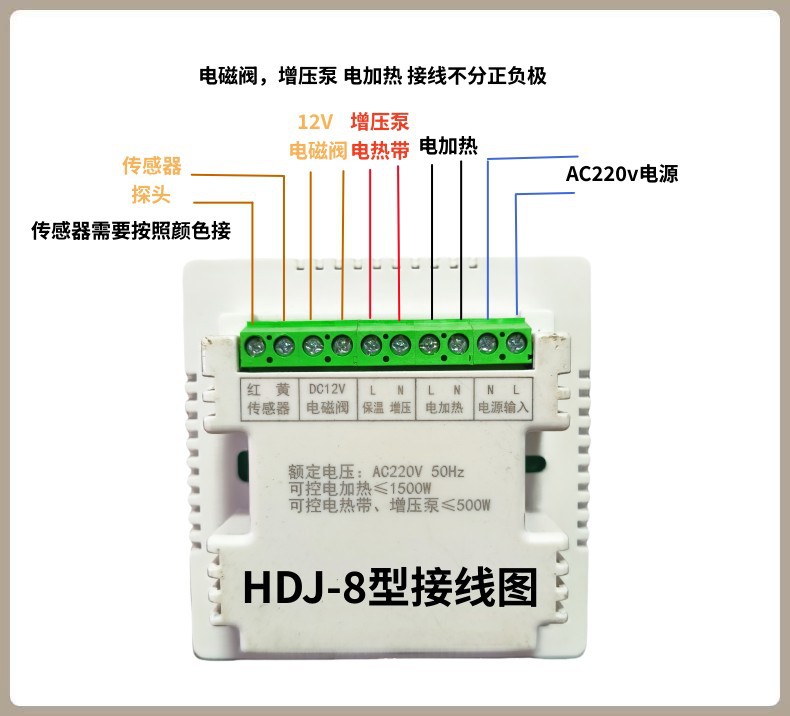 自动上水,接2芯传感器,12v电磁阀,1500W电加热,增压泵或电热带