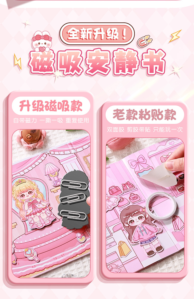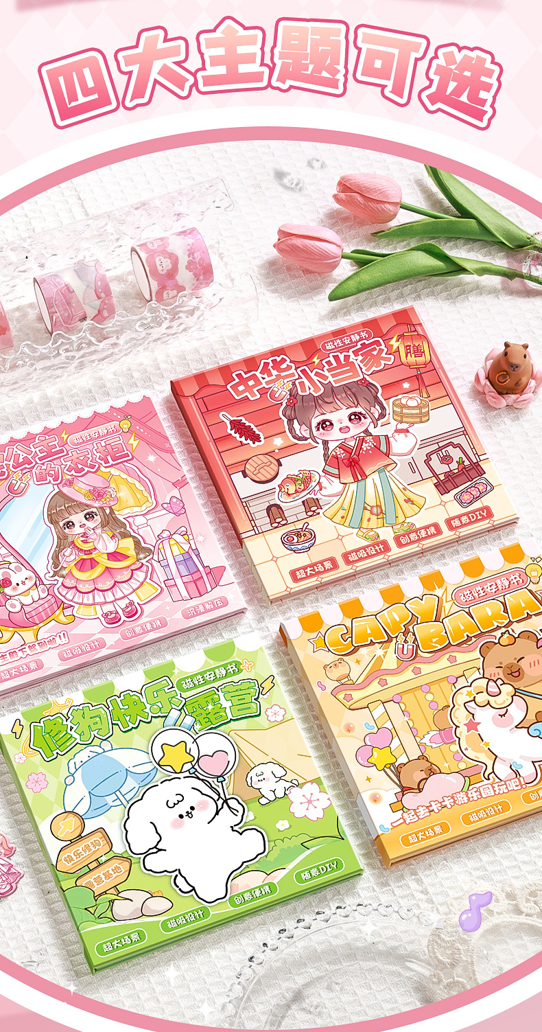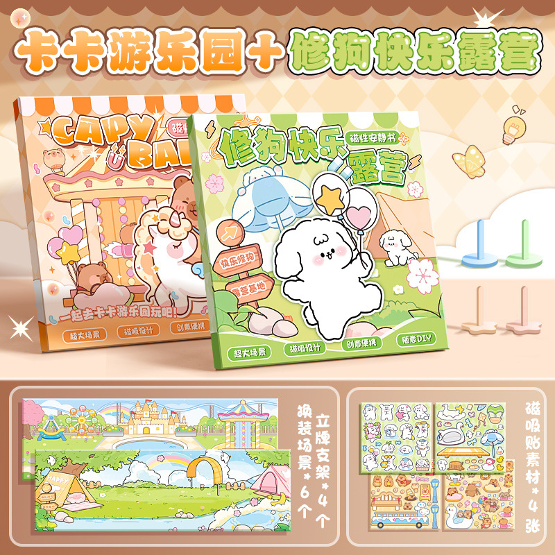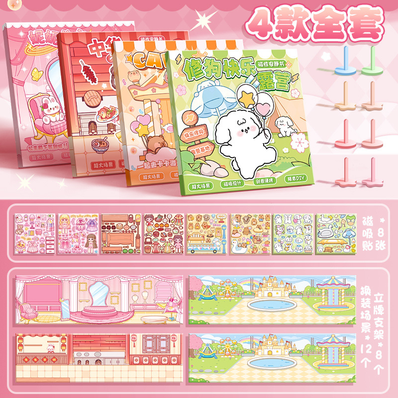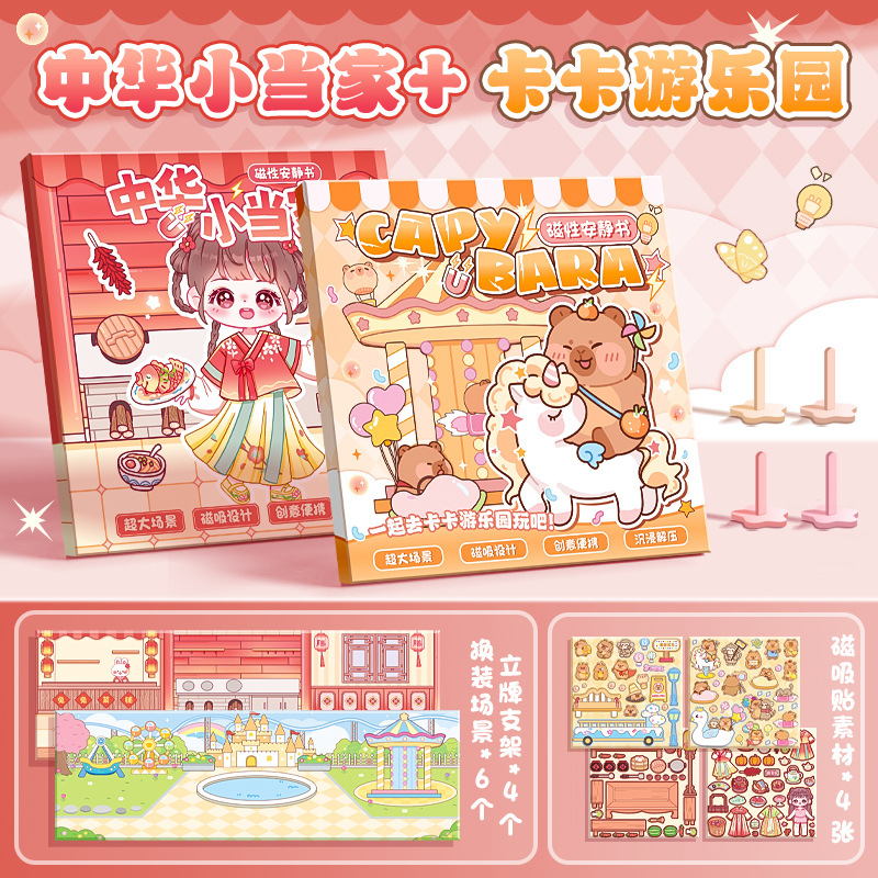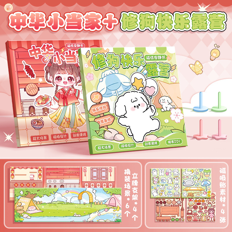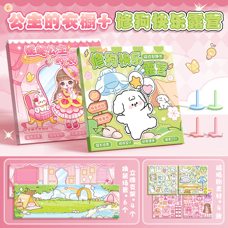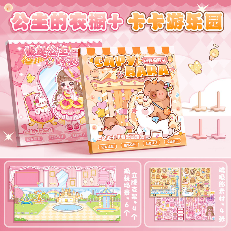 Магнитная тихая книжка-гардероб принцессы; Магнитная тихая книга-парк развлечений Кака; Магнитная тихая собака для ремонта книг Happy Camping; Магнитная тихая книга-китайский маленький дом; Магнитная тихая книга - Капи Ната; Маленький мастер Китая + Счастливый кемпинг с собаками; Магнитная тихая книга — четыре полных набора; Шкаф принцессы + Парк развлечений Кака; Шкаф принцессы + Кемпинг счастливой собаки; Шкаф принцессы + Молодой шеф-повар; Парк развлечений Кака + Кемпинг «Счастливая собака»; Маленький мастер-шеф + Парк развлечений Кака