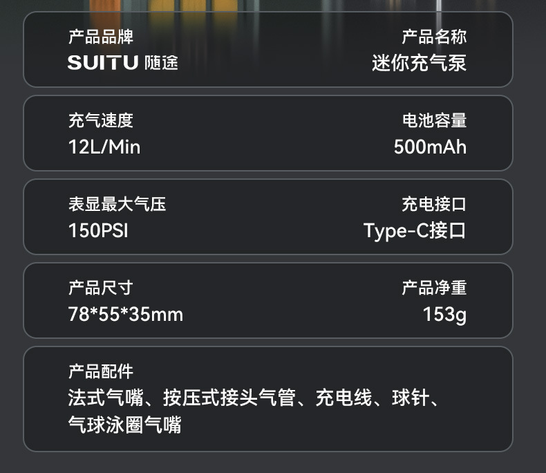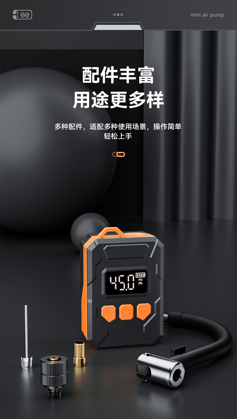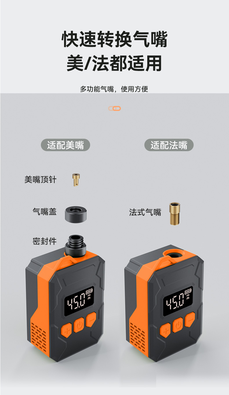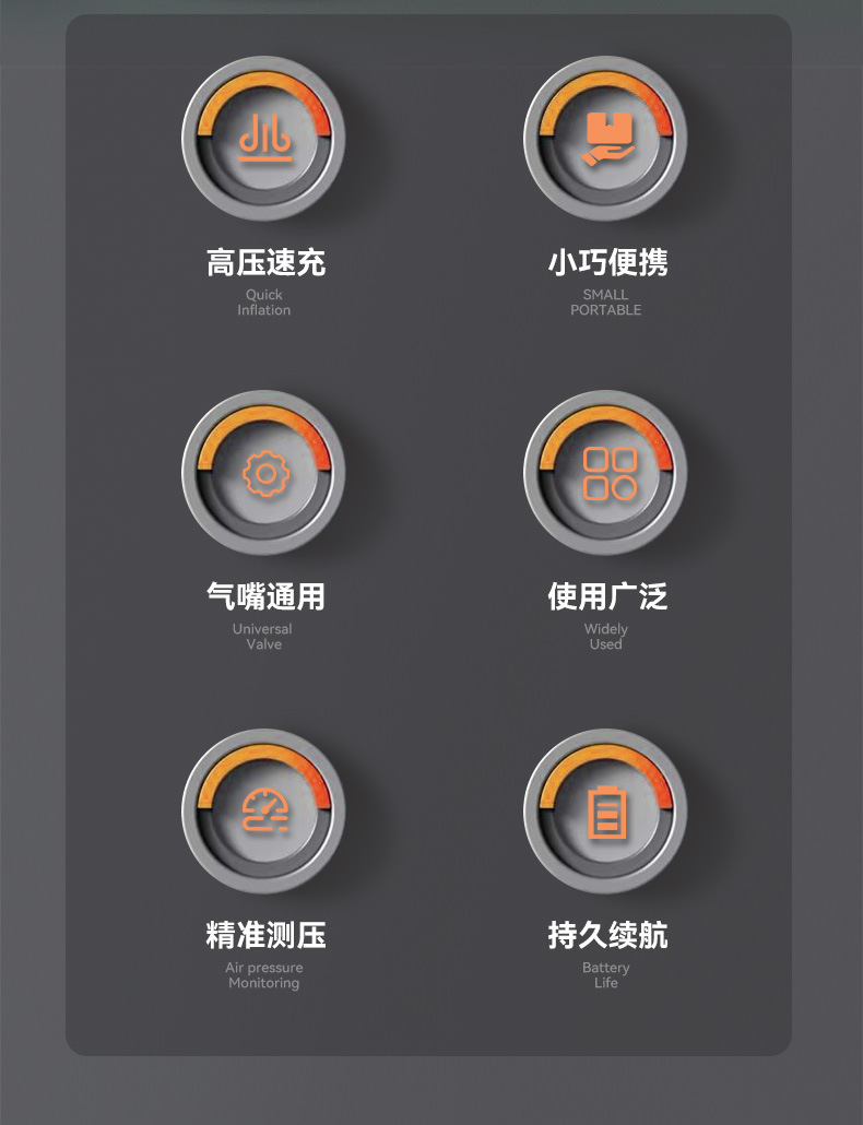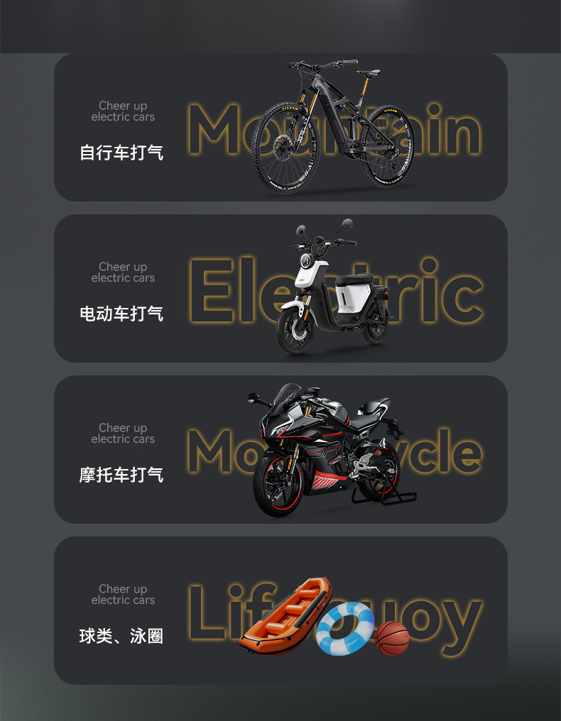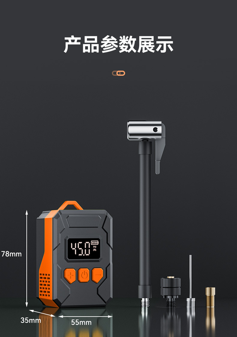 【包装清单】:主机*1,法式气嘴接头1PC、按压式接头气管1PC、充电线1PC、球针1PC、气球泳圈气嘴1PC