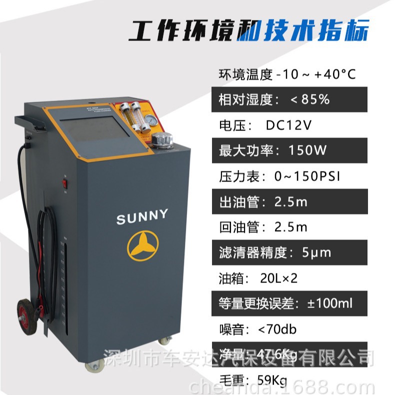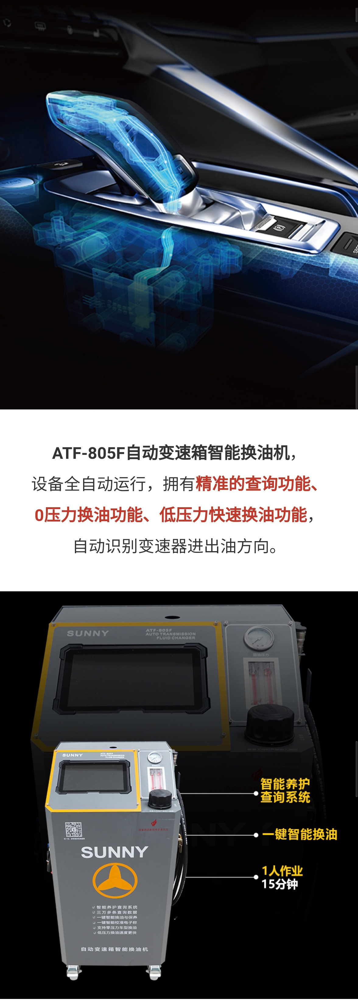 按照自动变速箱养护规定,汽车自动变速器在5~6万公里里程后,需进行油液更换,自动变速箱经过长时间使用,内部变速箱油将会变质,若不能及时更换自动变速箱油,将会引起变速箱工作异常。现市场上的自动变速箱油更换机普遍能实现全自动等量换油,而在实际更换过程中由于变速箱类型异常复杂,操作技师对于选择油品种类、接头拆装位置、接头型号和如何正确查看变速箱油量等技术上参差不齐,导致一些不专业操作会对变速箱损害带来隐患。现我公司最新研发的ATF-805F自动变速箱换油机,拥有精准的查询功能、0压力换油功能、低压力快速换油功能,换油率可接近100%,设备的更换等量精度控制来保障汽车自动变速器新旧油的更换质量,设备全自动运行, 自动识别装置自动识别变速器进出油方向,操作人性化。选择ATF-805F是您明智的选择,ATF-805F是您深化养护的得力助手。