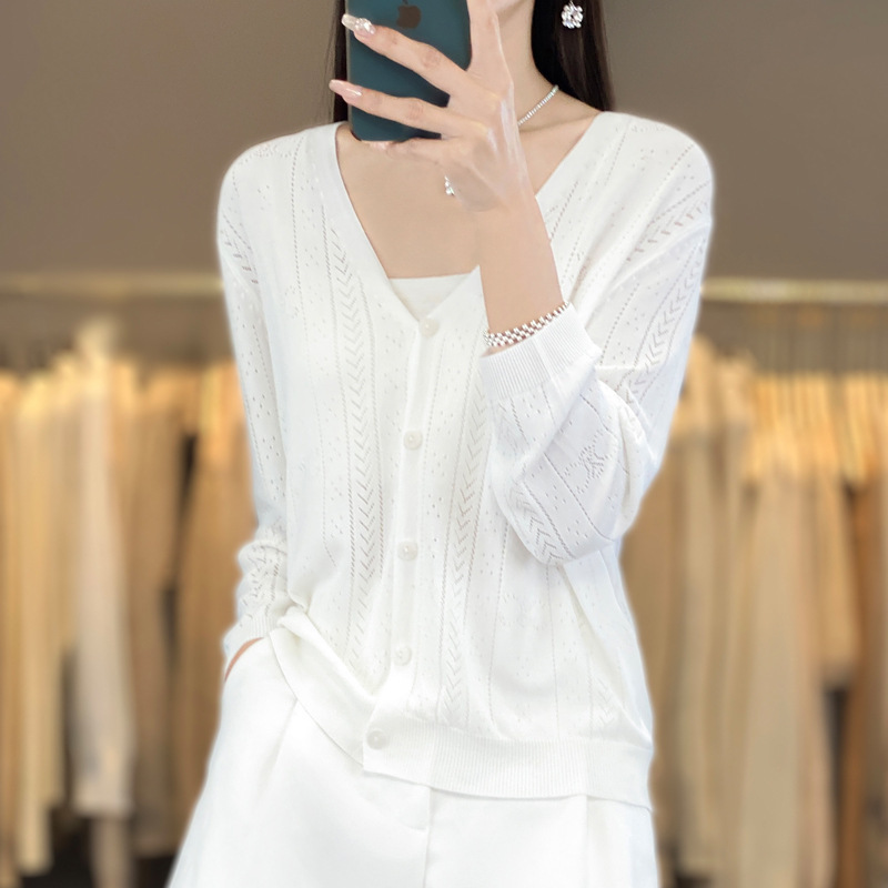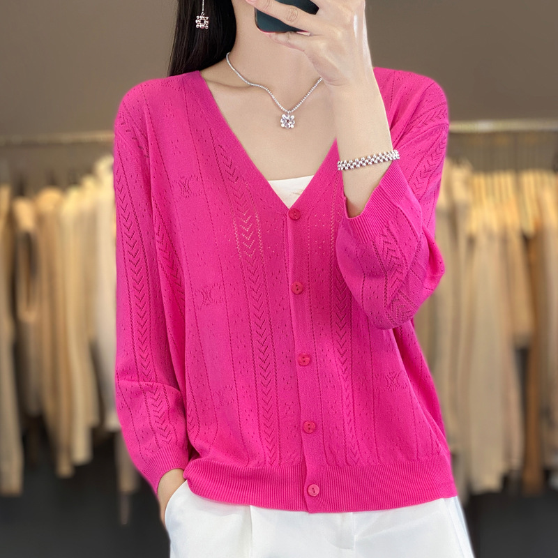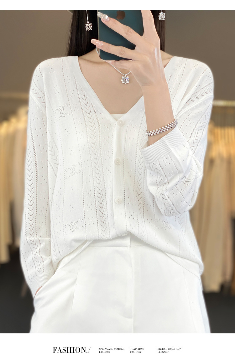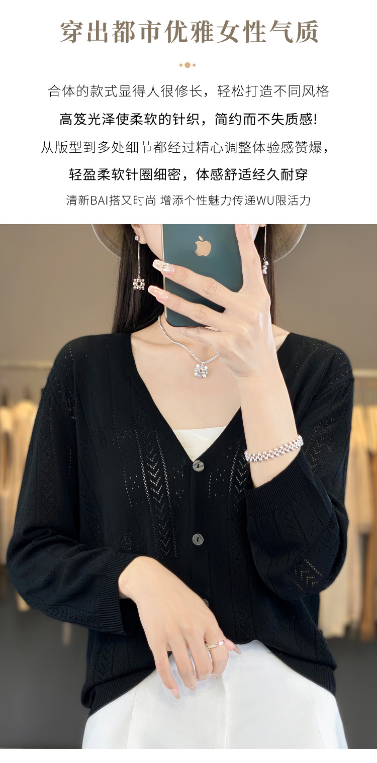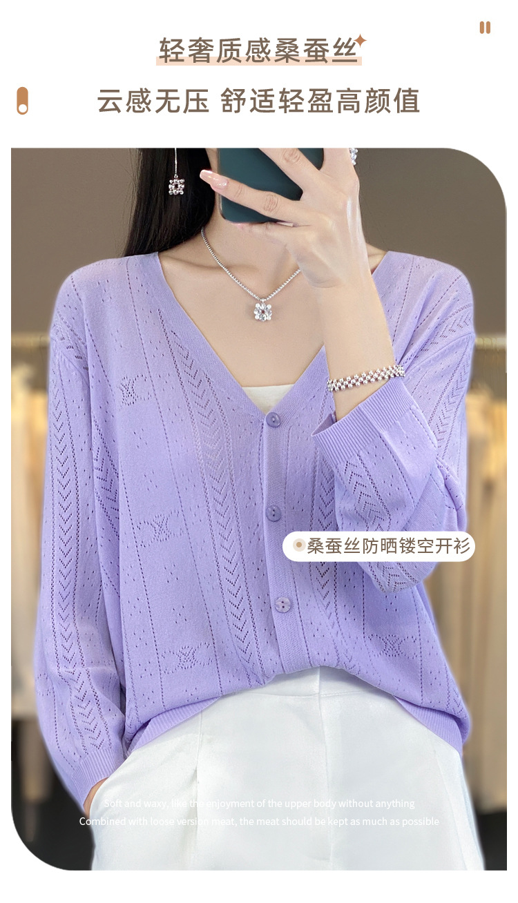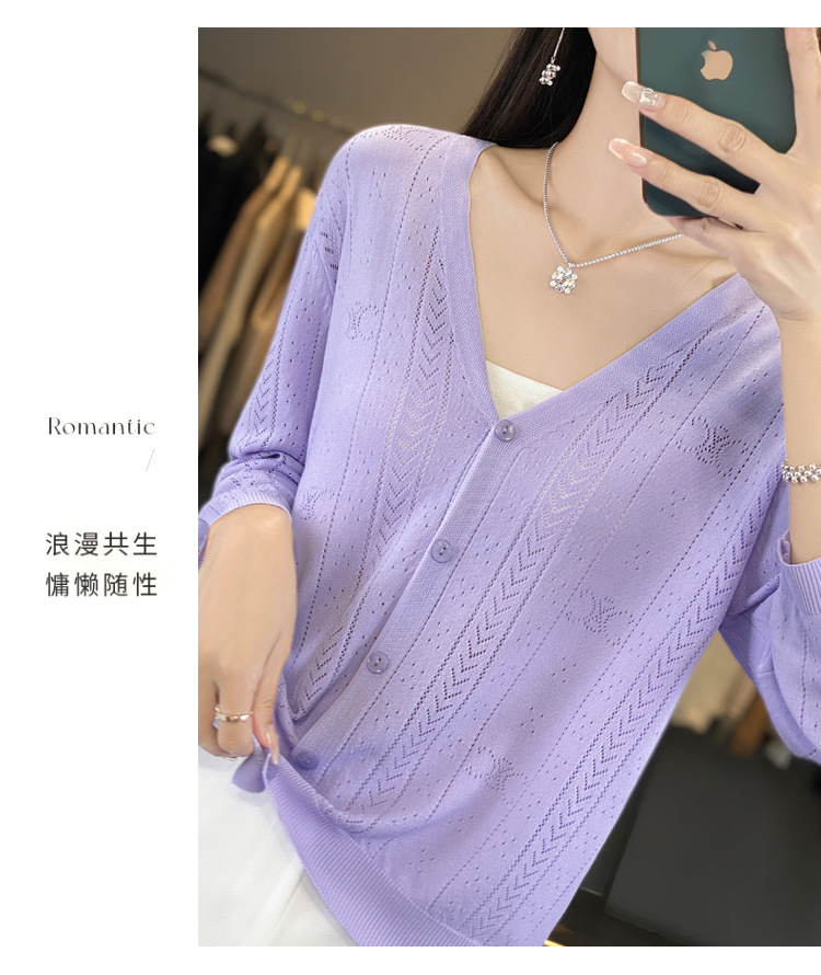 2024 Новый шелкопряд шелкопряда V-образный трикотажный кардиган женский полый свободный дикий сплошной топ и нижний рубашка