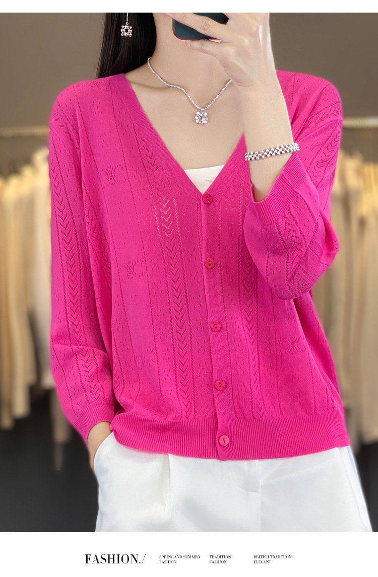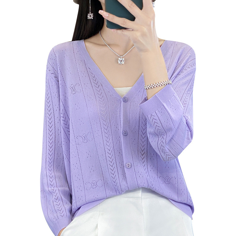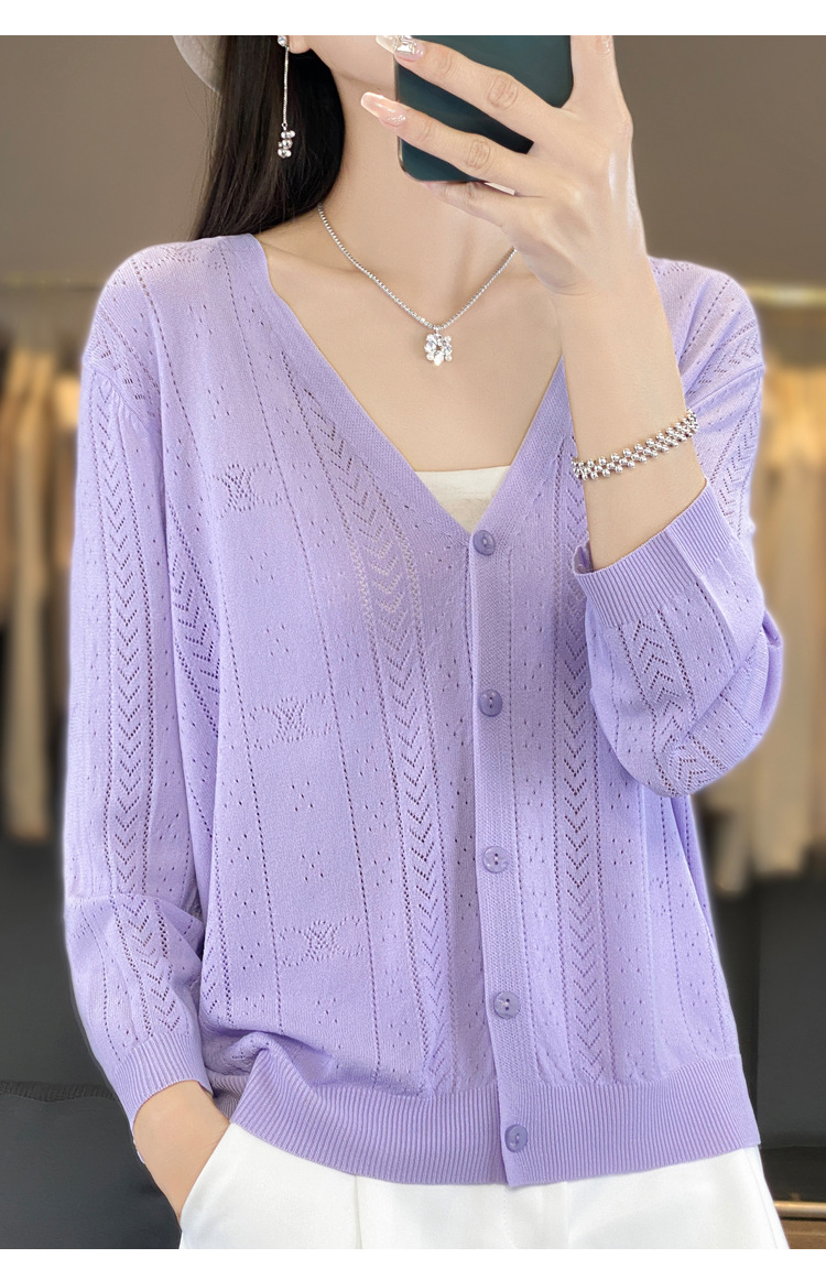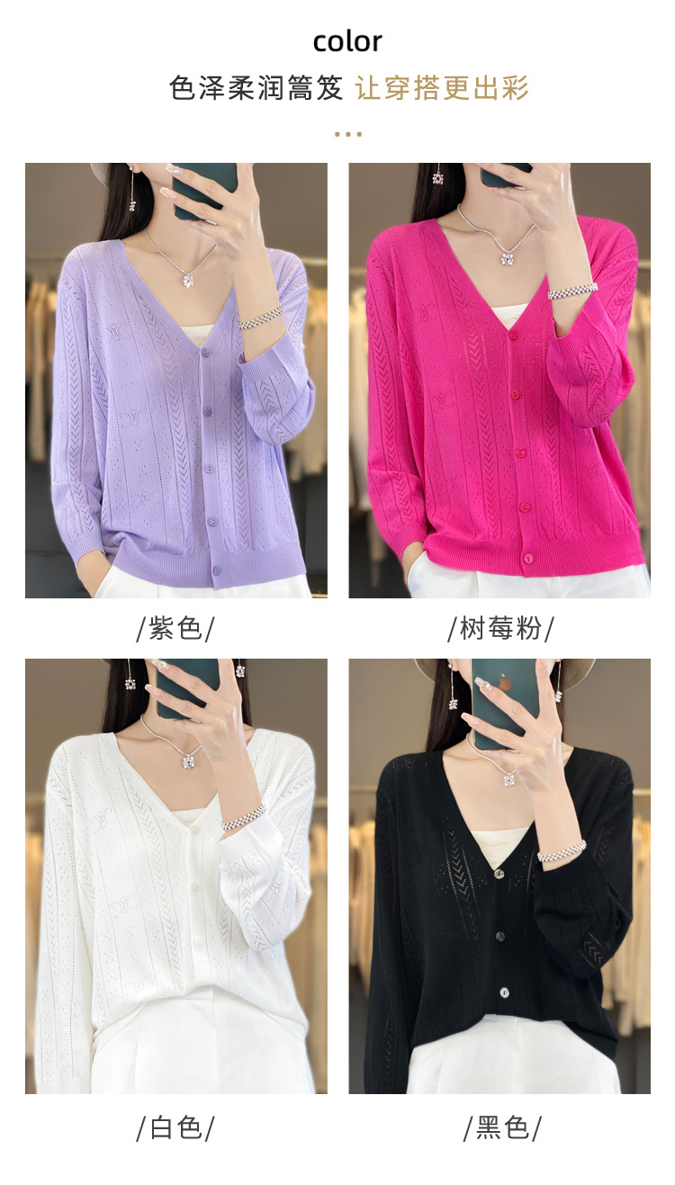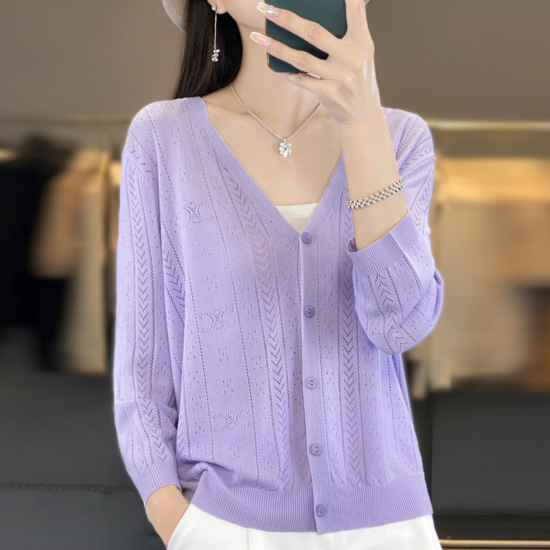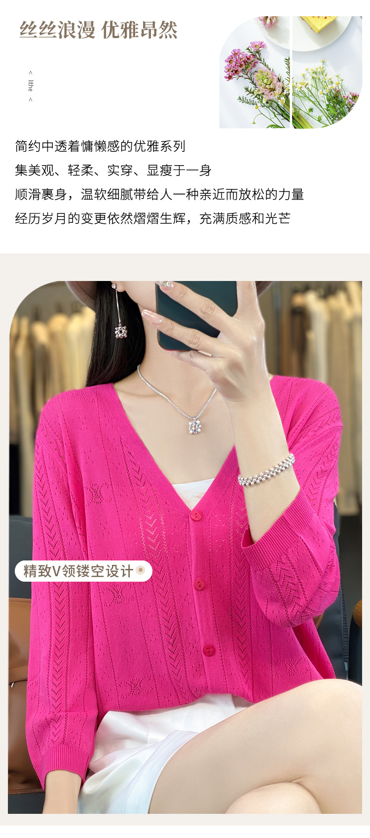 2024 Новый шелкопряд шелкопряда V-образный трикотажный кардиган женский полый свободный дикий сплошной топ и нижний рубашка