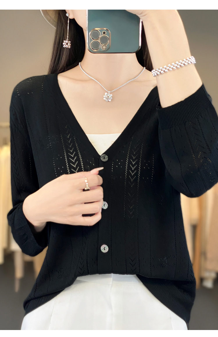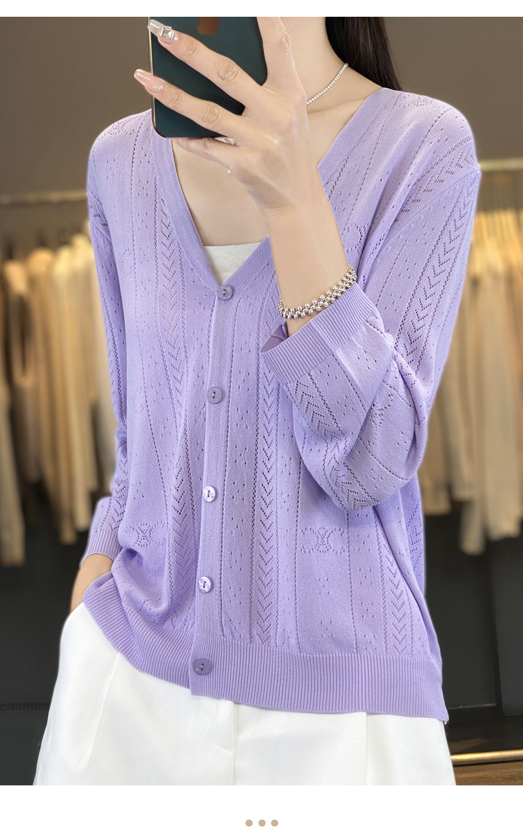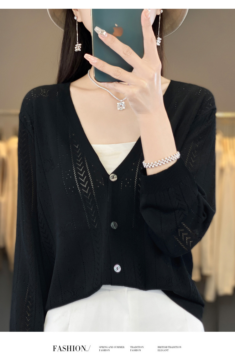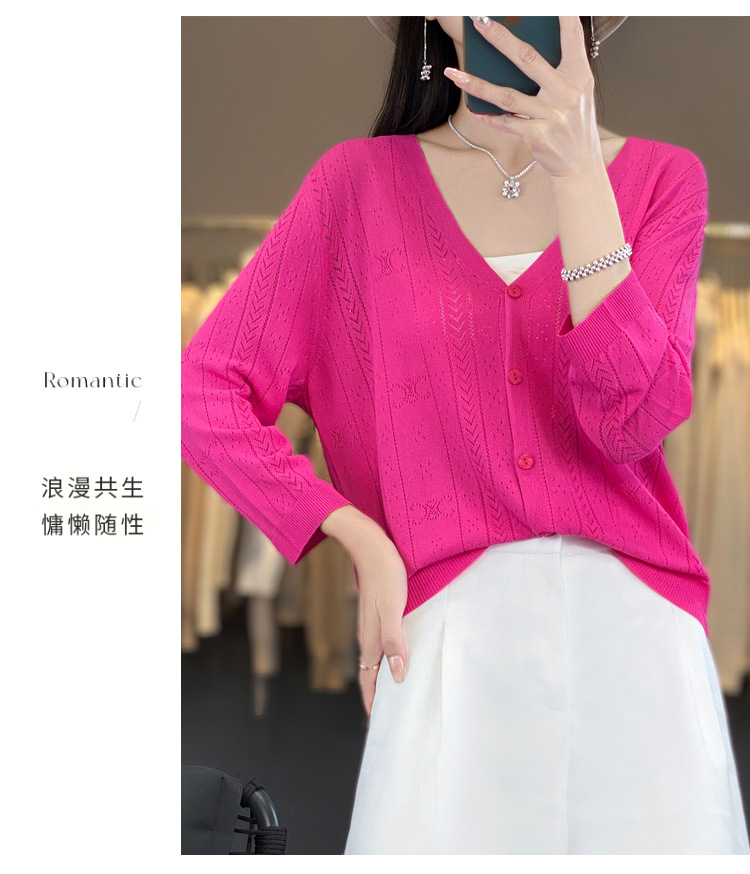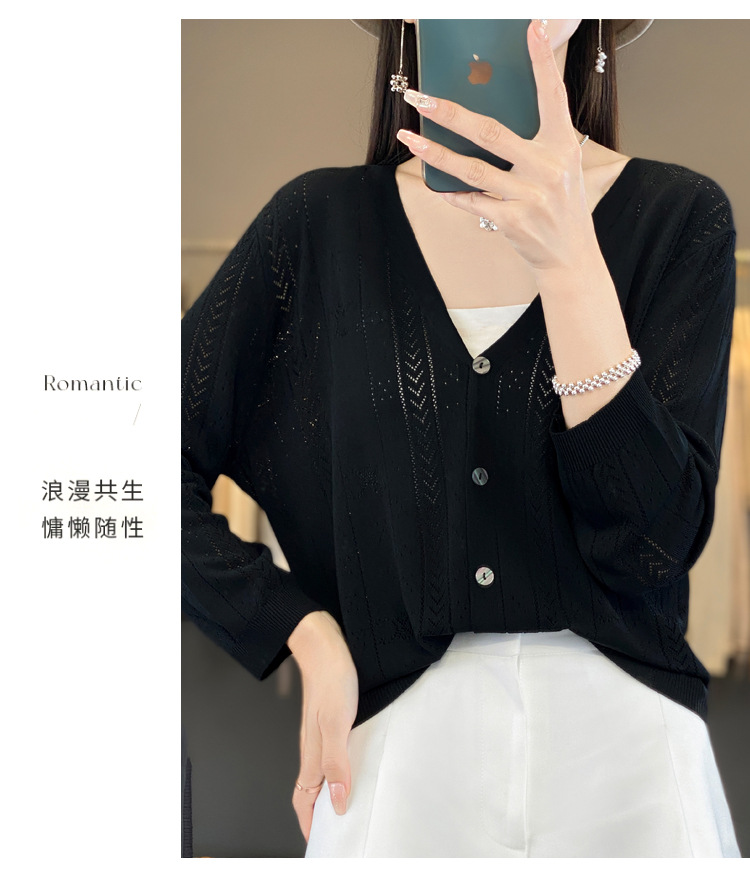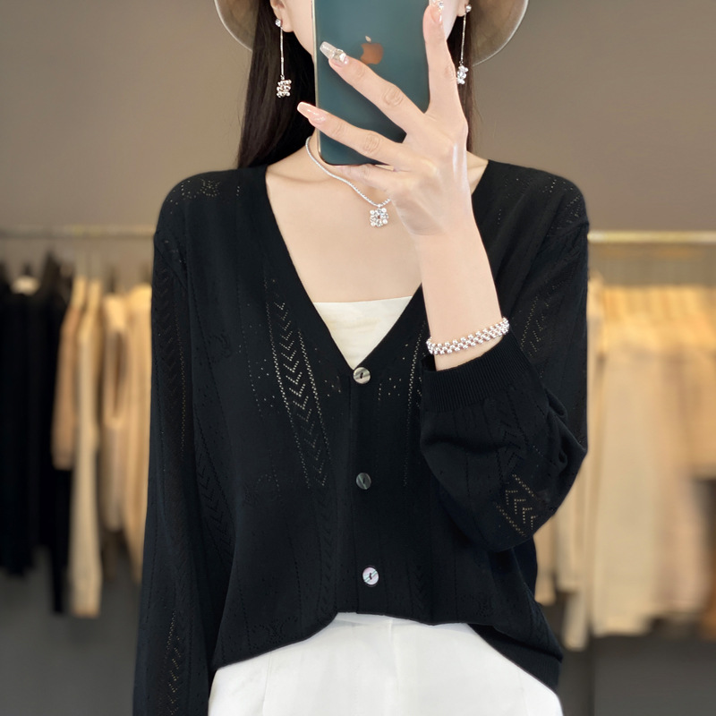 2024 Новый шелкопряд шелкопряда V-образный трикотажный кардиган женский полый свободный дикий сплошной топ и нижний рубашка