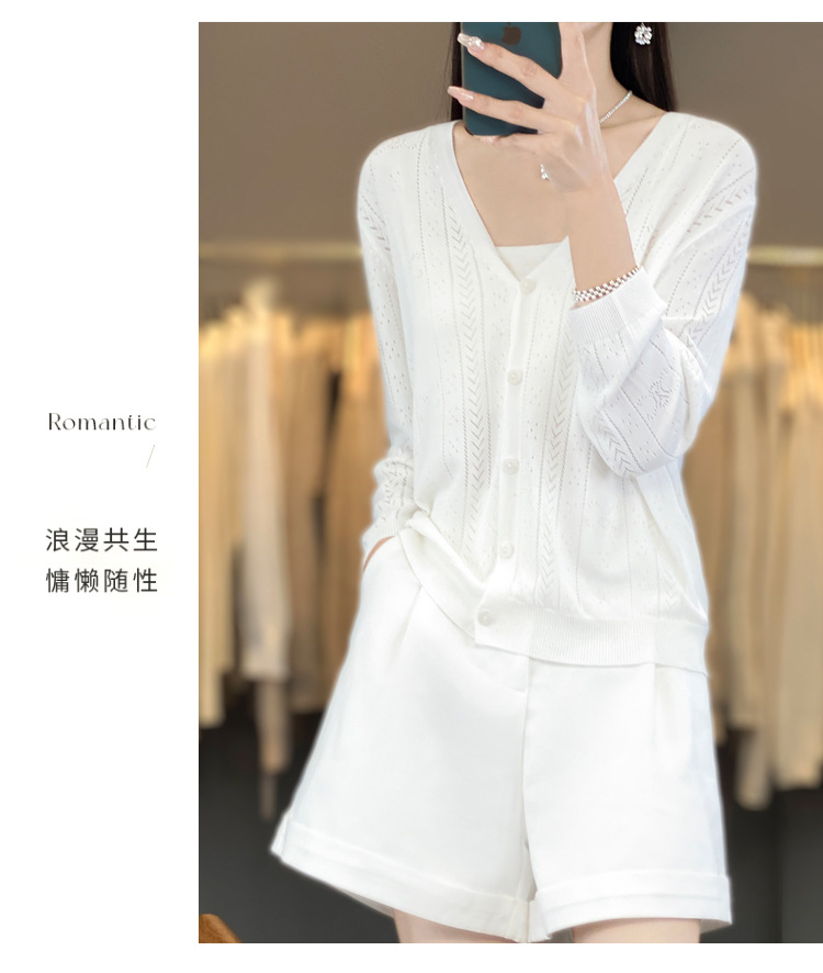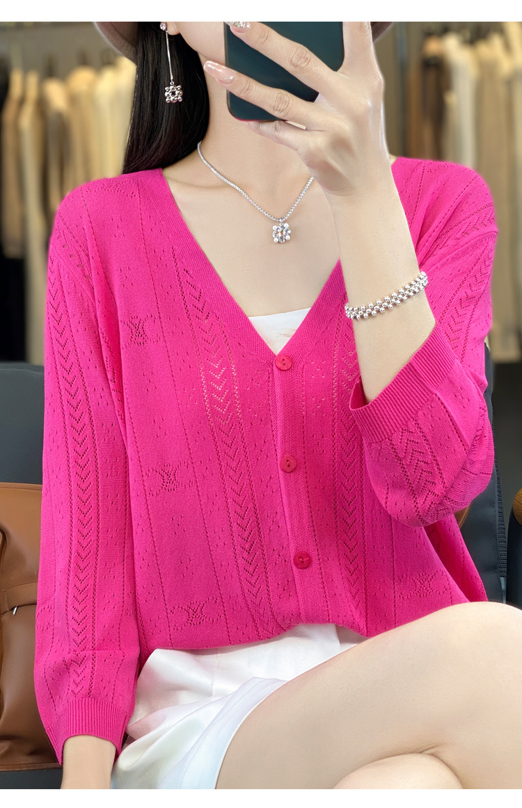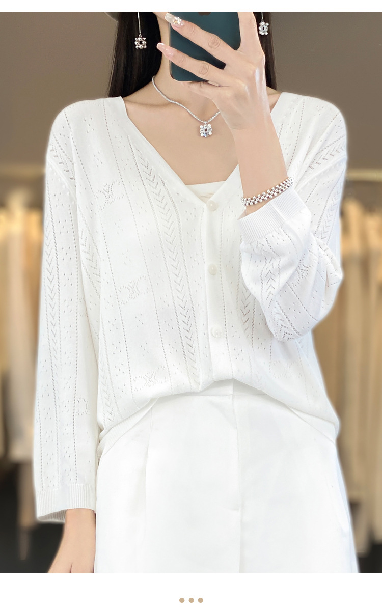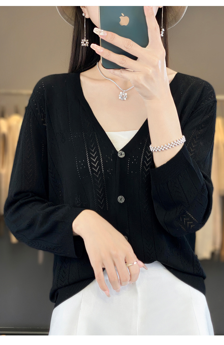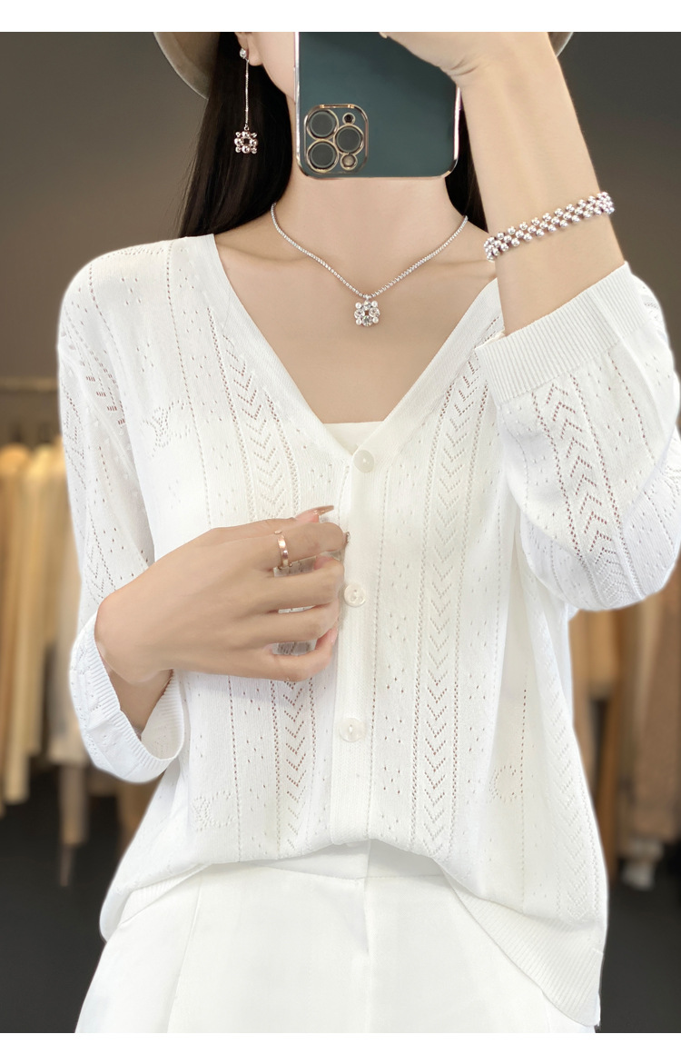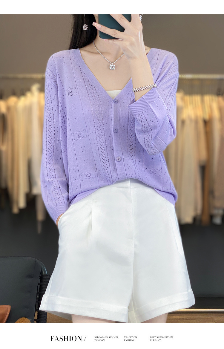 2024 Новый шелкопряд шелкопряда V-образный трикотажный кардиган женский полый свободный дикий сплошной топ и нижний рубашка