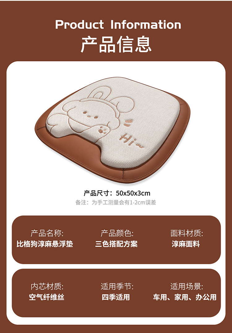 2024 новый воздушный волокнистый шелк Chunma стерео мультфильм Bige Dog Автомобильная подушка сиденья Универсальная квадратная прокладка