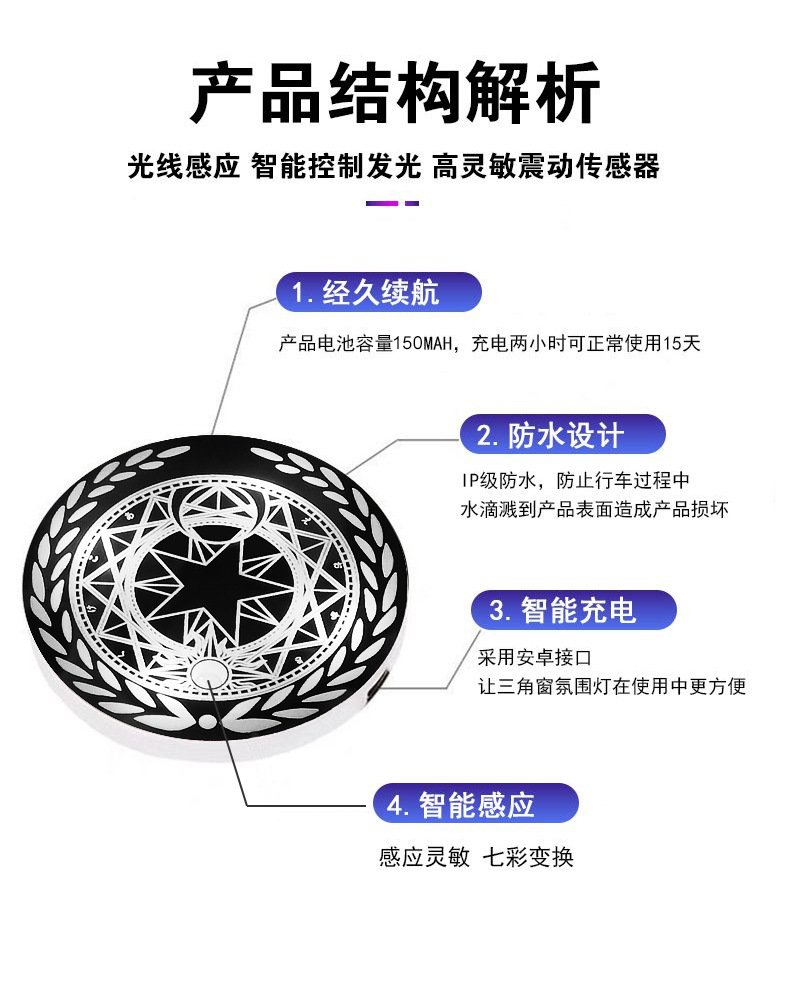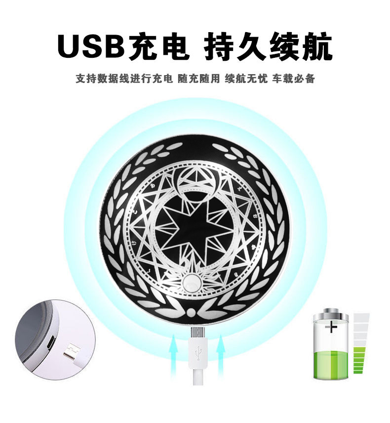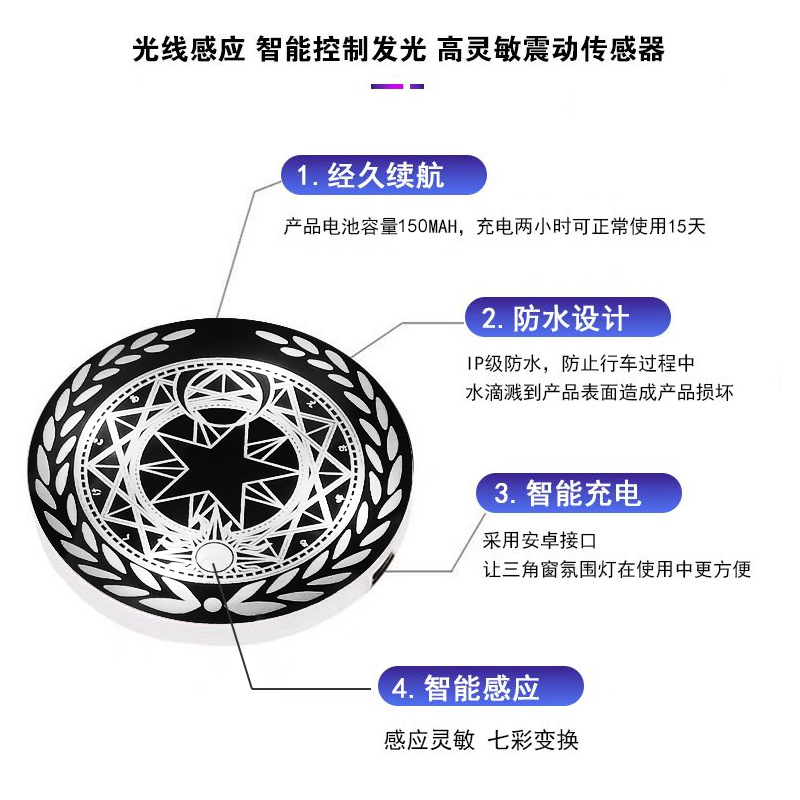 - 智能感:内置光传感器和振动传感器,汽车杯垫会在黑暗或振动时自动开启,静态下约15秒后自动关闭,不会产生任何刺激或摇晃。