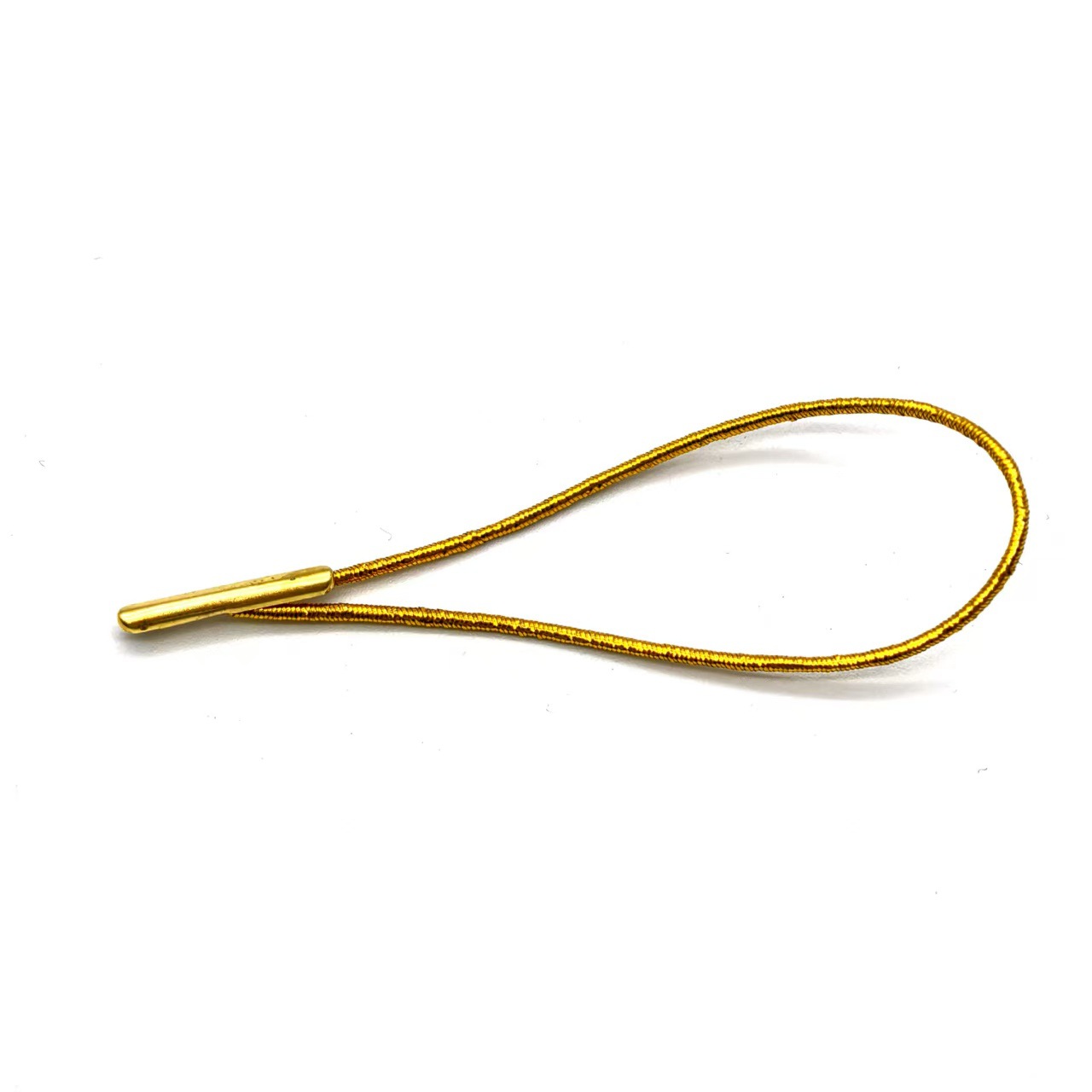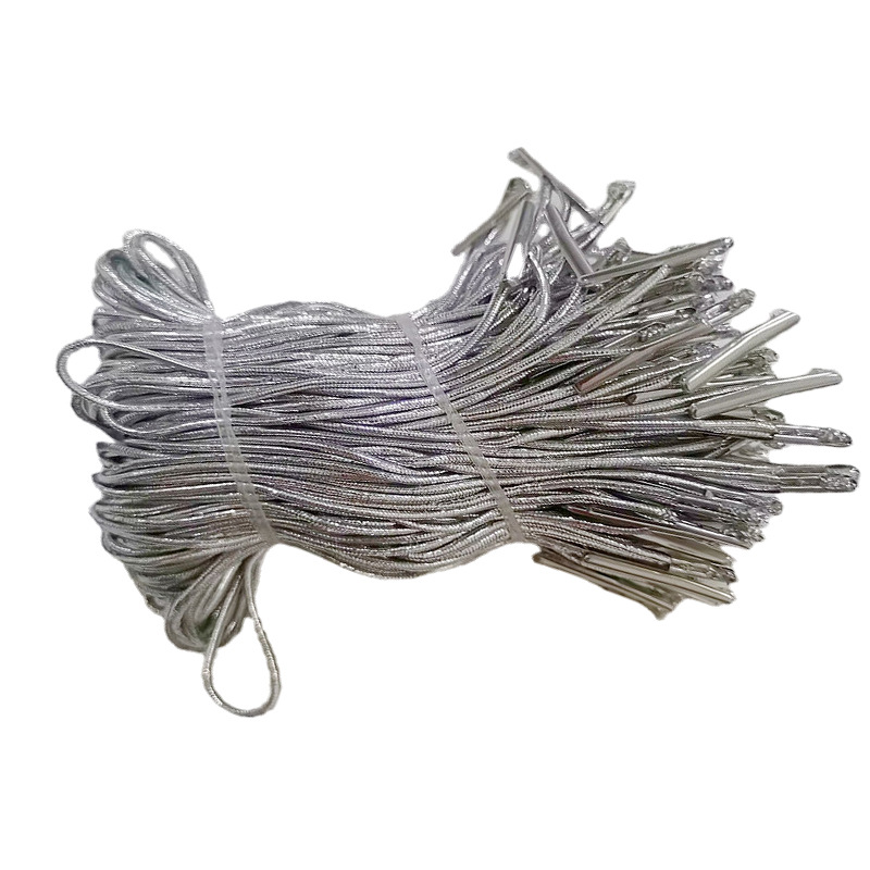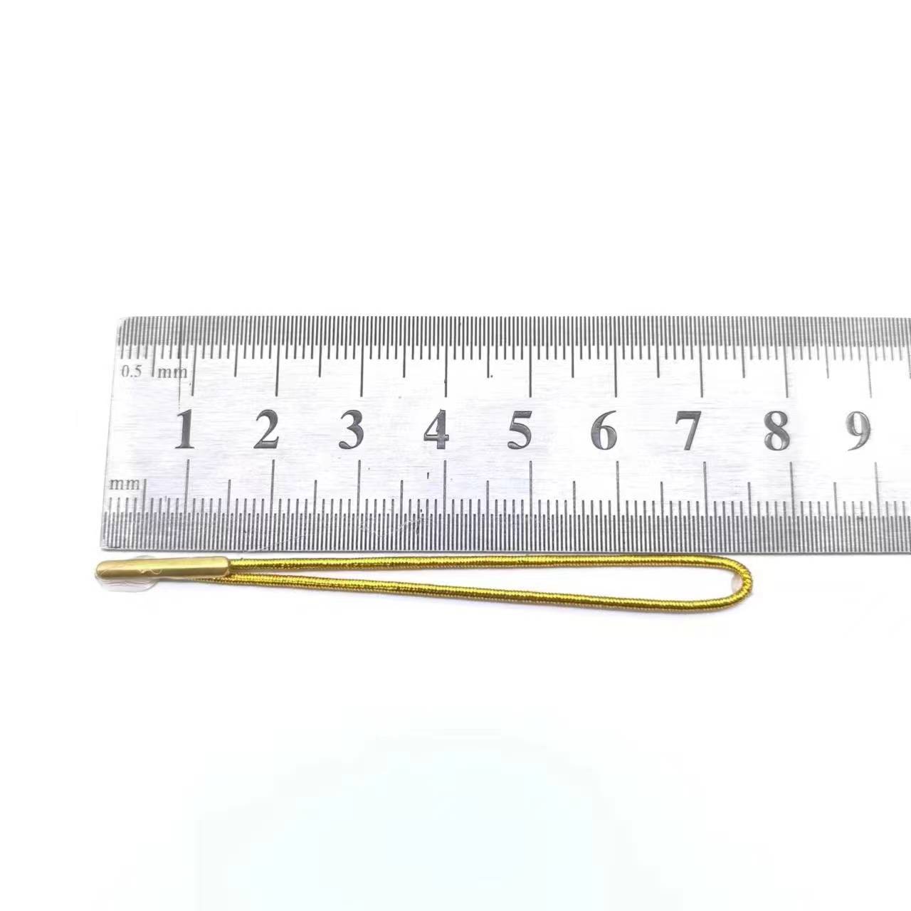 此产品为1mm粗金银丝松紧绳对折打铁扣吊牌绳,具有弹性,长度为对折7cm左右(其它颜色/长度,都可定做)拿样免费,运费自理,此产品按包购买,每包约1000个。