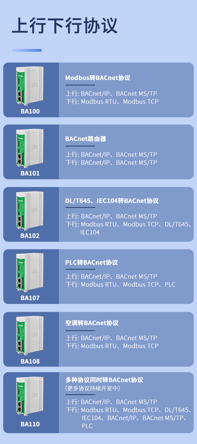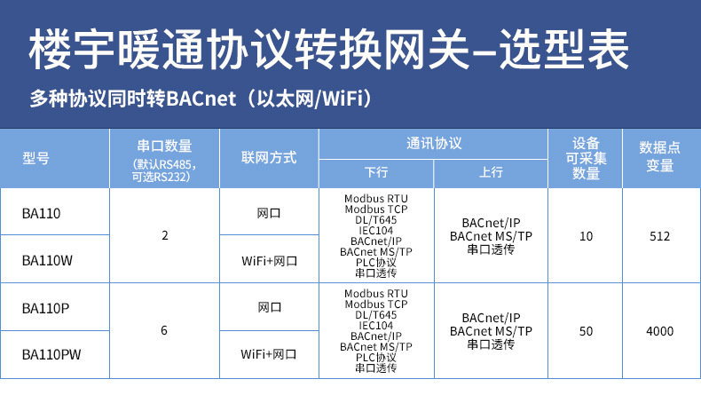 BA110 (несколько протоколов одновременно переводит протокол BACnet); BA110W (несколько протоколов одновременно переводит протокол BACnet); BA110P (несколько протоколов одновременно переводит протокол BACnet); BA110PW (несколько протоколов одновременно переходит в протокол BACnet)