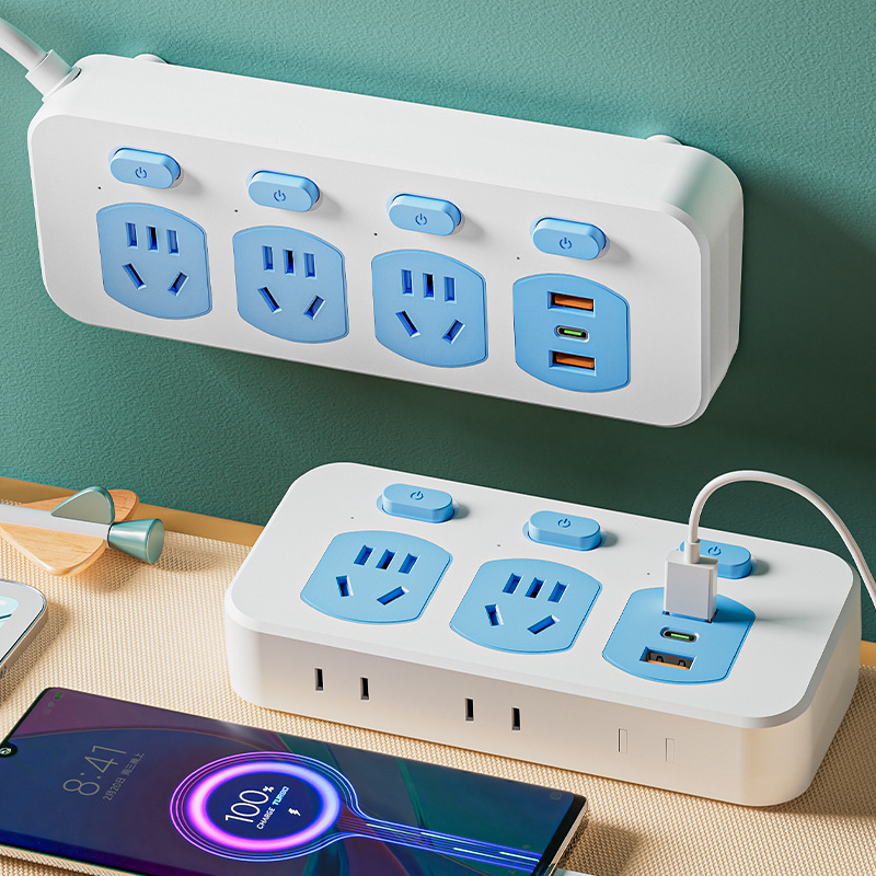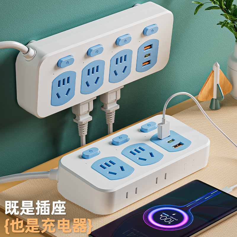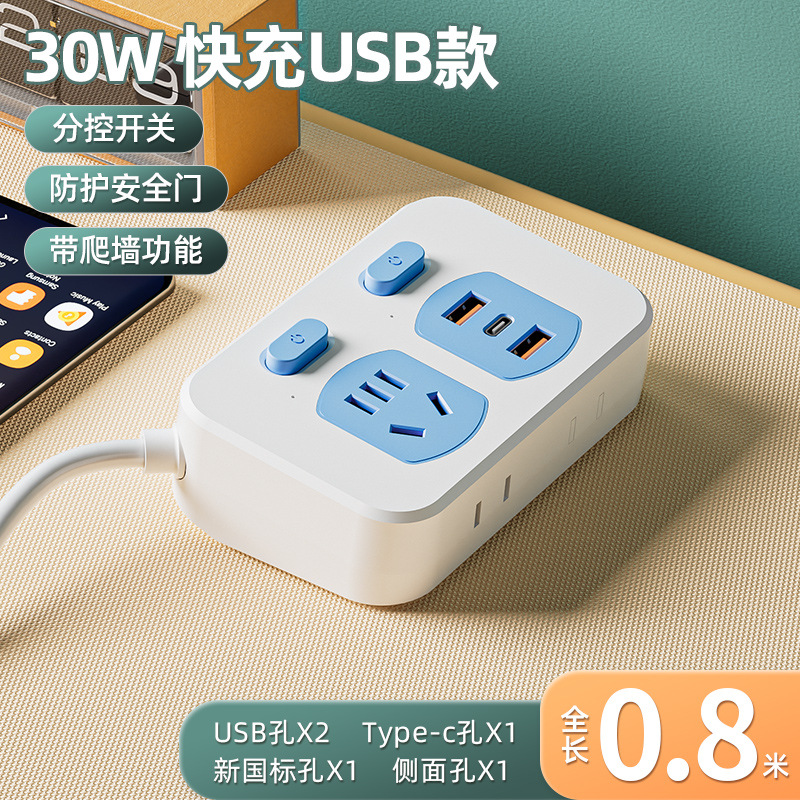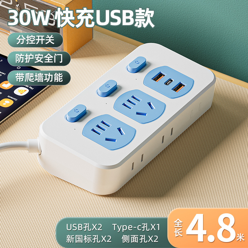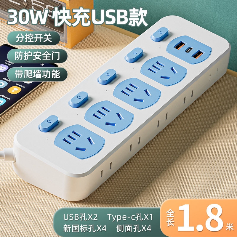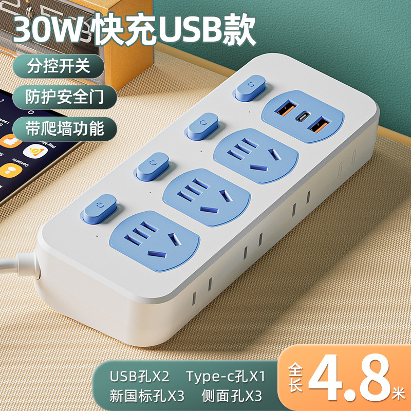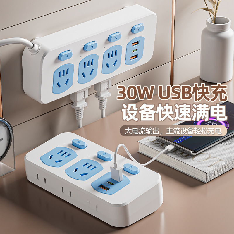Многопортовое зарядное устройство-удлинитель 30 Вт с быстрой зарядкой, кабелем USB, независимыми выключателями и высокой мощностью для общежитий