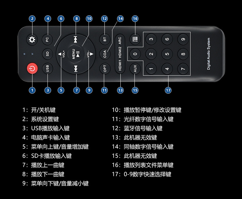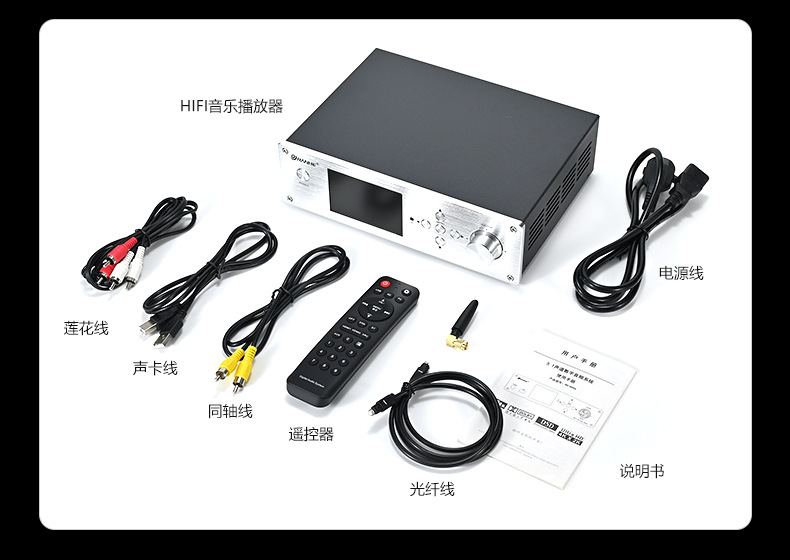 Хост, пульт дистанционного управления, шнур питания, оптоволоконный провод, коаксиальная линия, USB-кабель, Bluetooth-антенна, инструкция