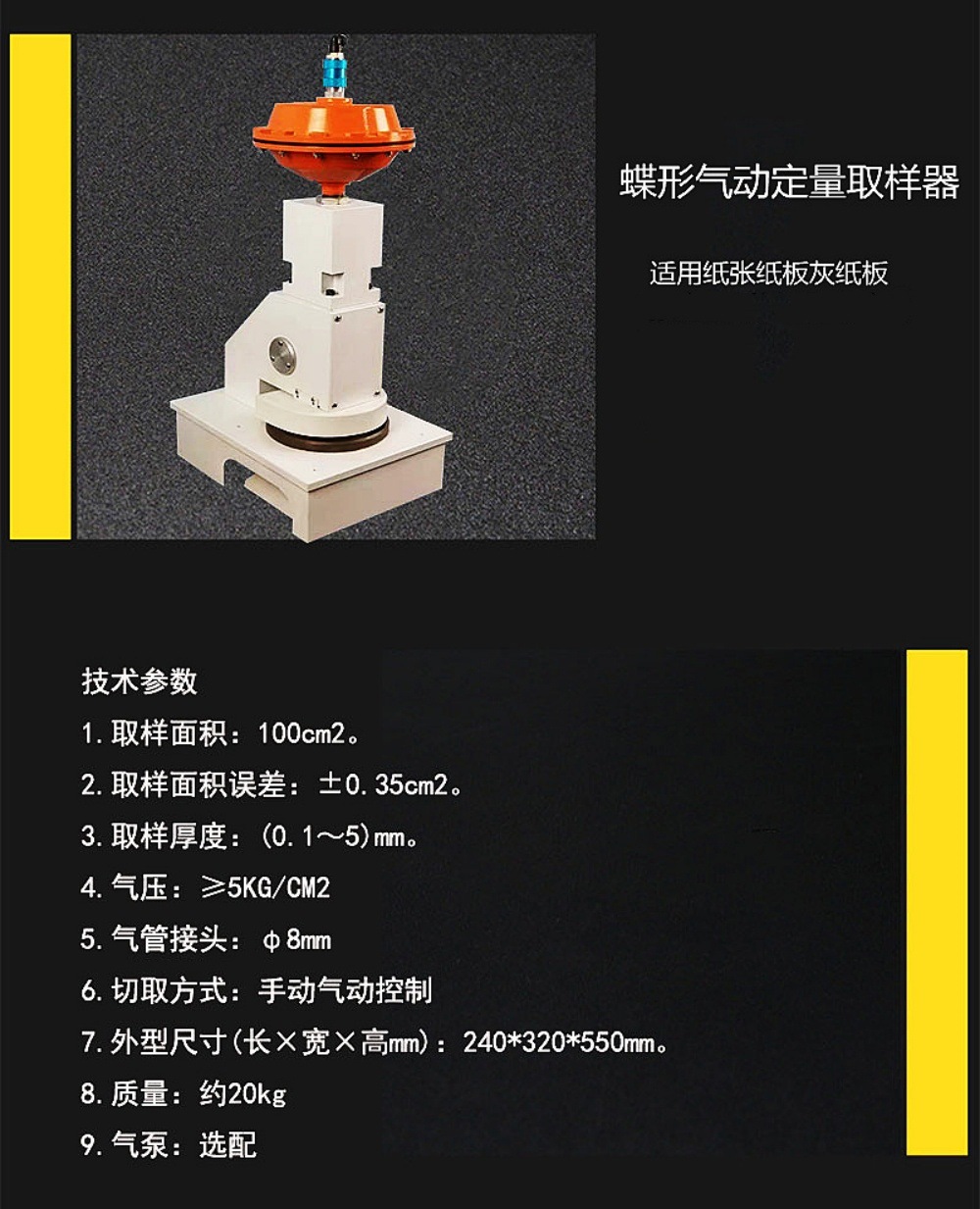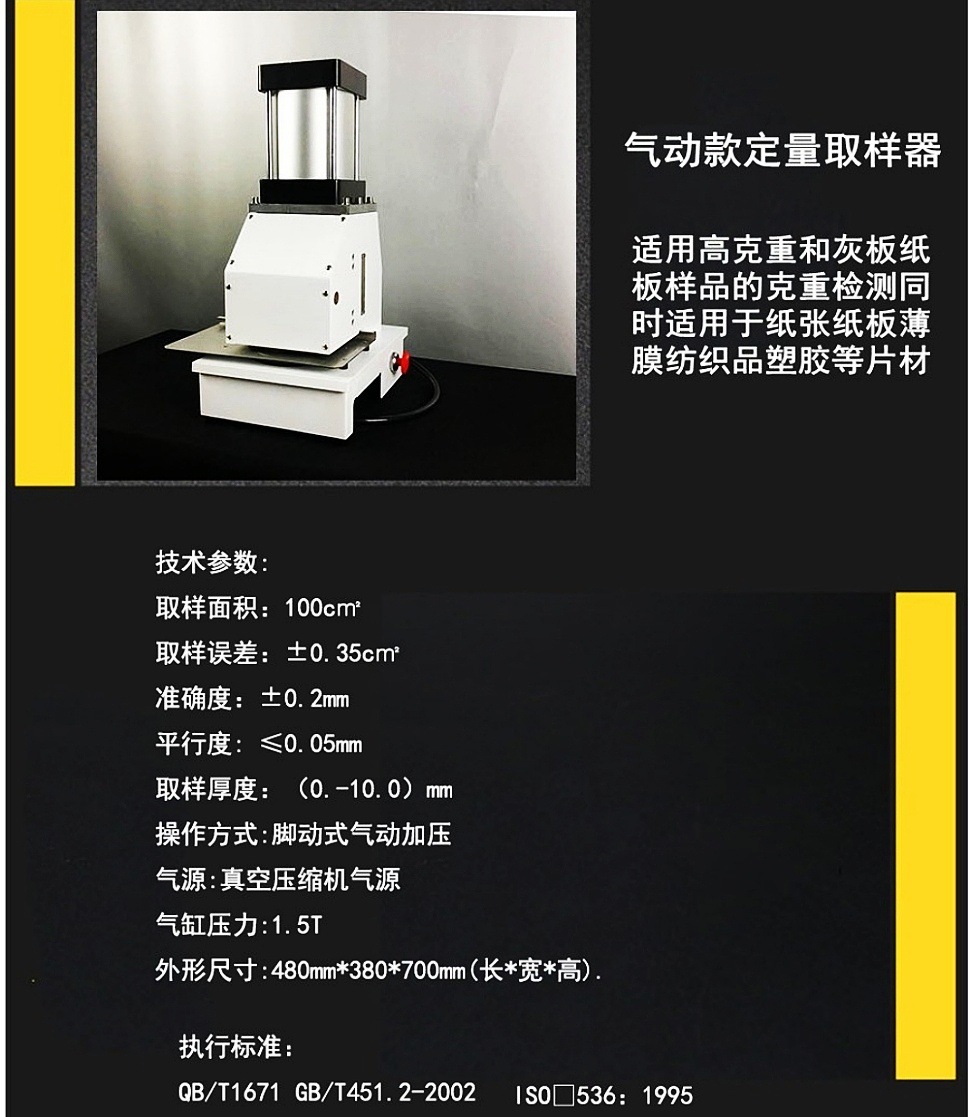 气动定量取样器是一种专门研发生产用于高克重和灰板纸样品的克重检测取样的刀具。该取样刀可用于很多不同的领域,包括:纸板的定量取样、纺织品的定量取样卫生纸卫生巾等卫生用品的片材取样、橡胶塑料等片材的取样、薄膜的定量取样、软包装等复合片状原材料的定量取样.该取样器具能快速、准确地切取标准面积的试样,配合专用的定量测定仪(精密电子天平)可准确快速确定样品克重定量,是造纸、包装等生产企业和质量监督检验等行业和部门理想的辅助试验工具。