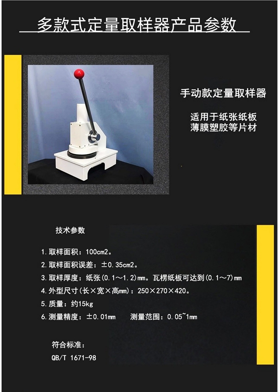 定量取样器(以下简称取样器) 是纸张、纸板克重测定标准试样的专用取样器具,能快速、准确地切取标准尺寸的试样,是造纸、包装和质量监督检验等行业和部门理想的辅助试验器具。和精密电子天平配合可以精确计算纸张纸板的克重