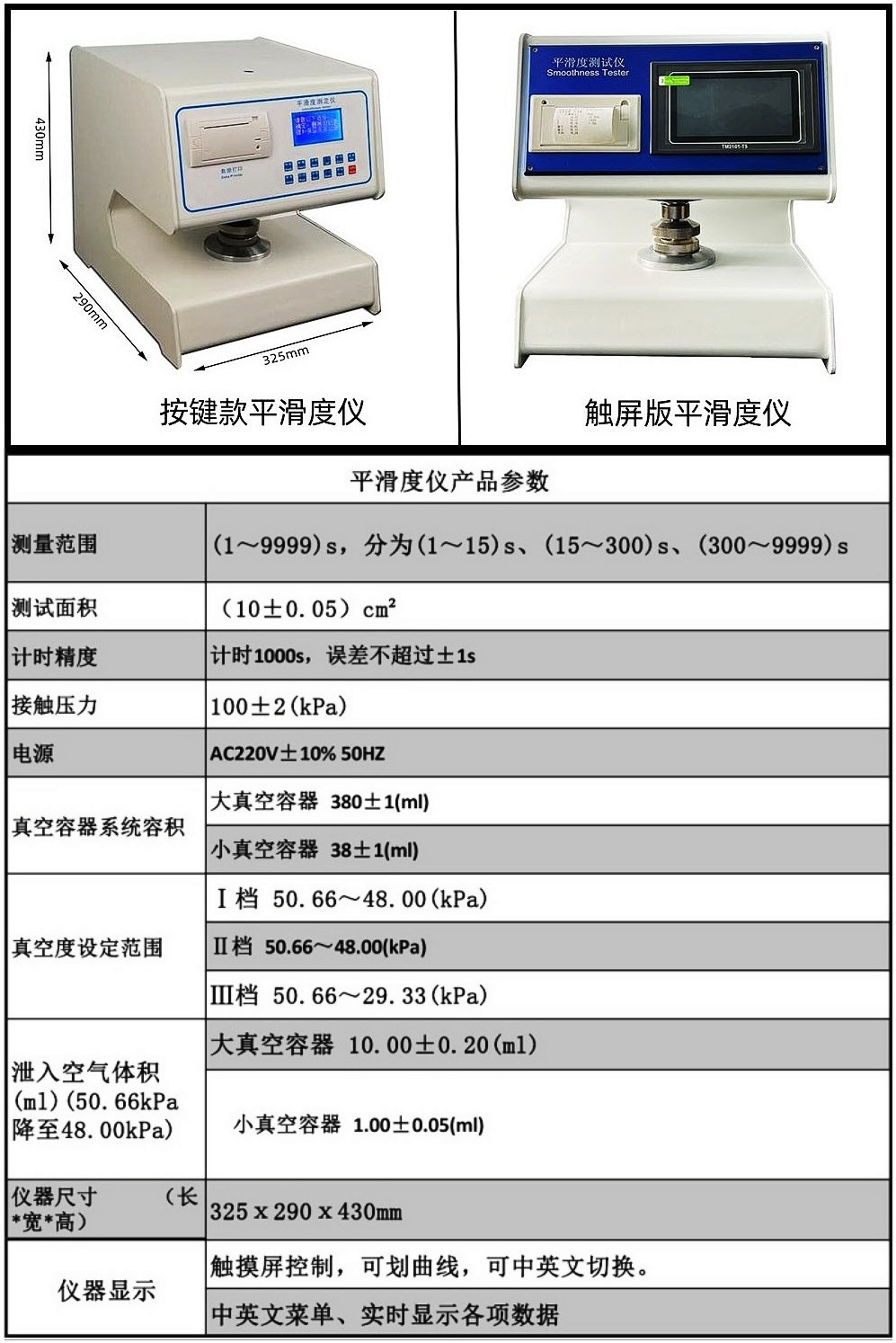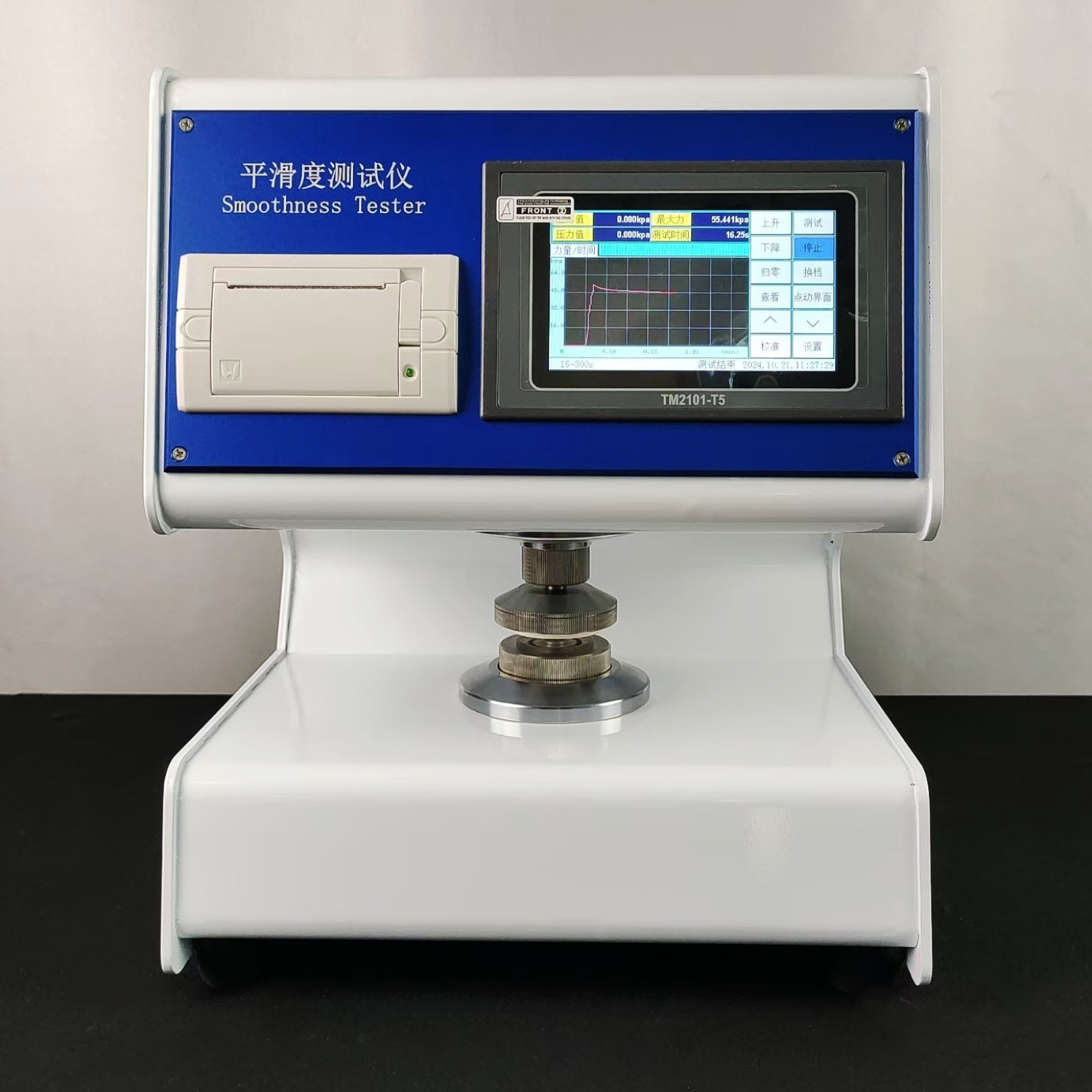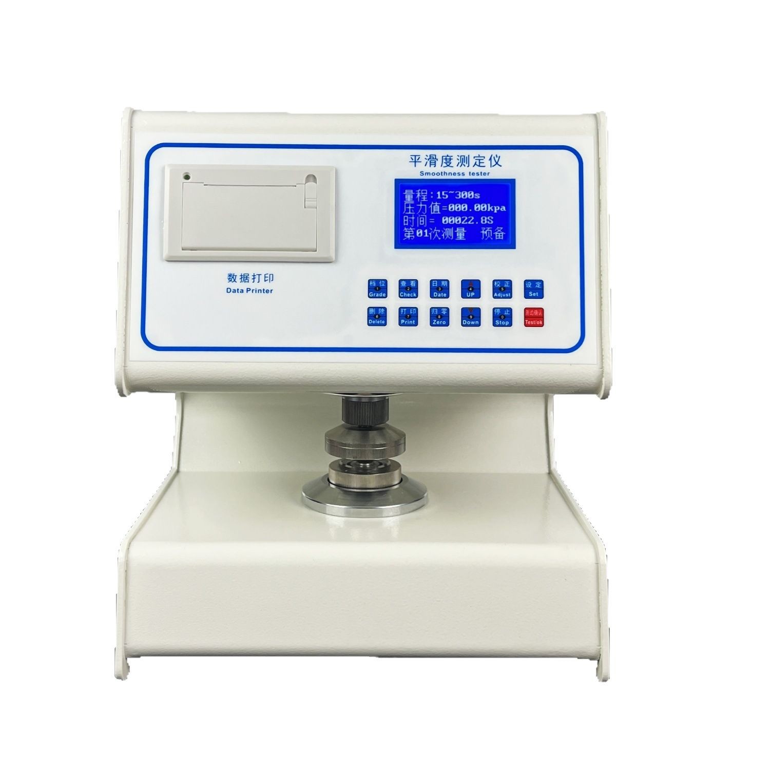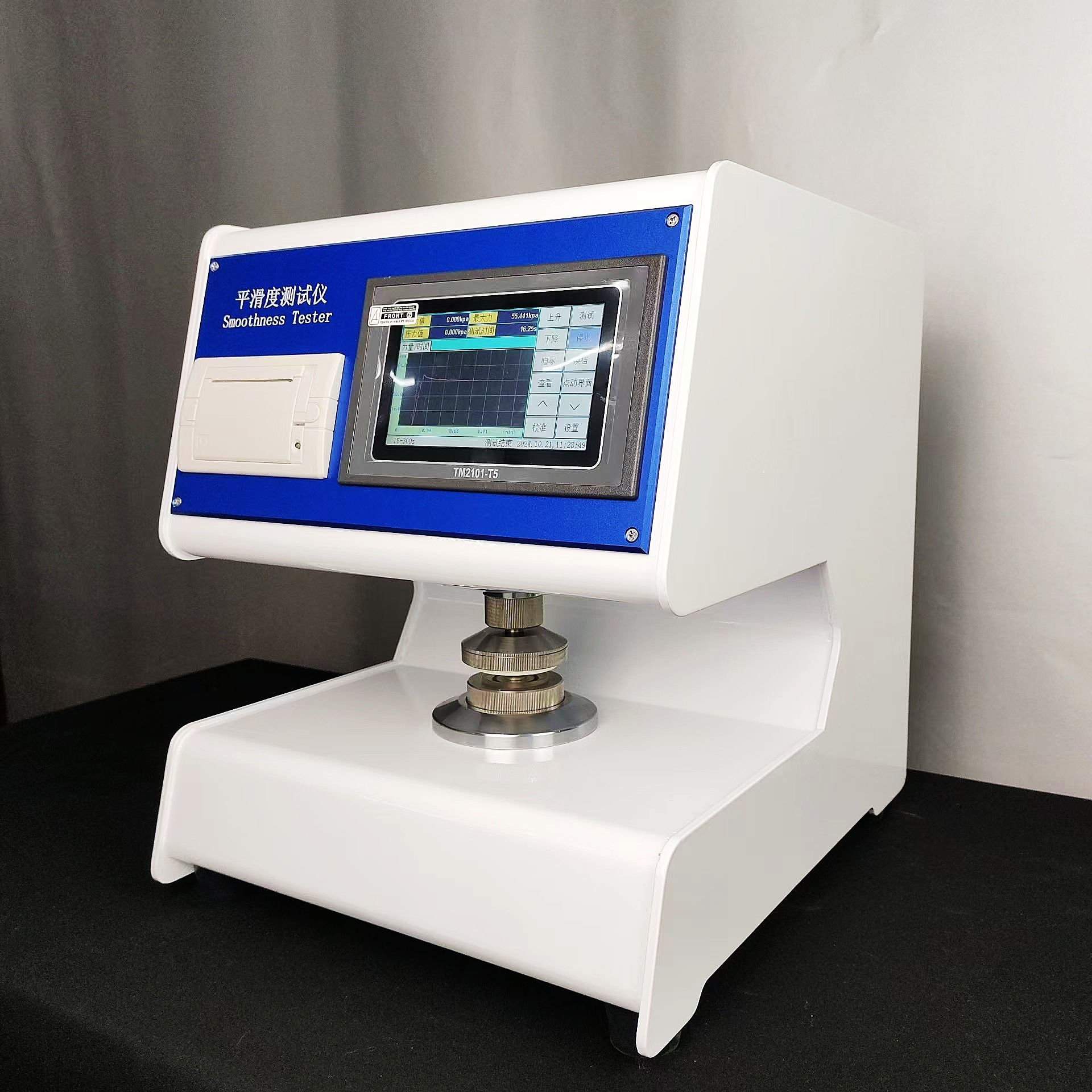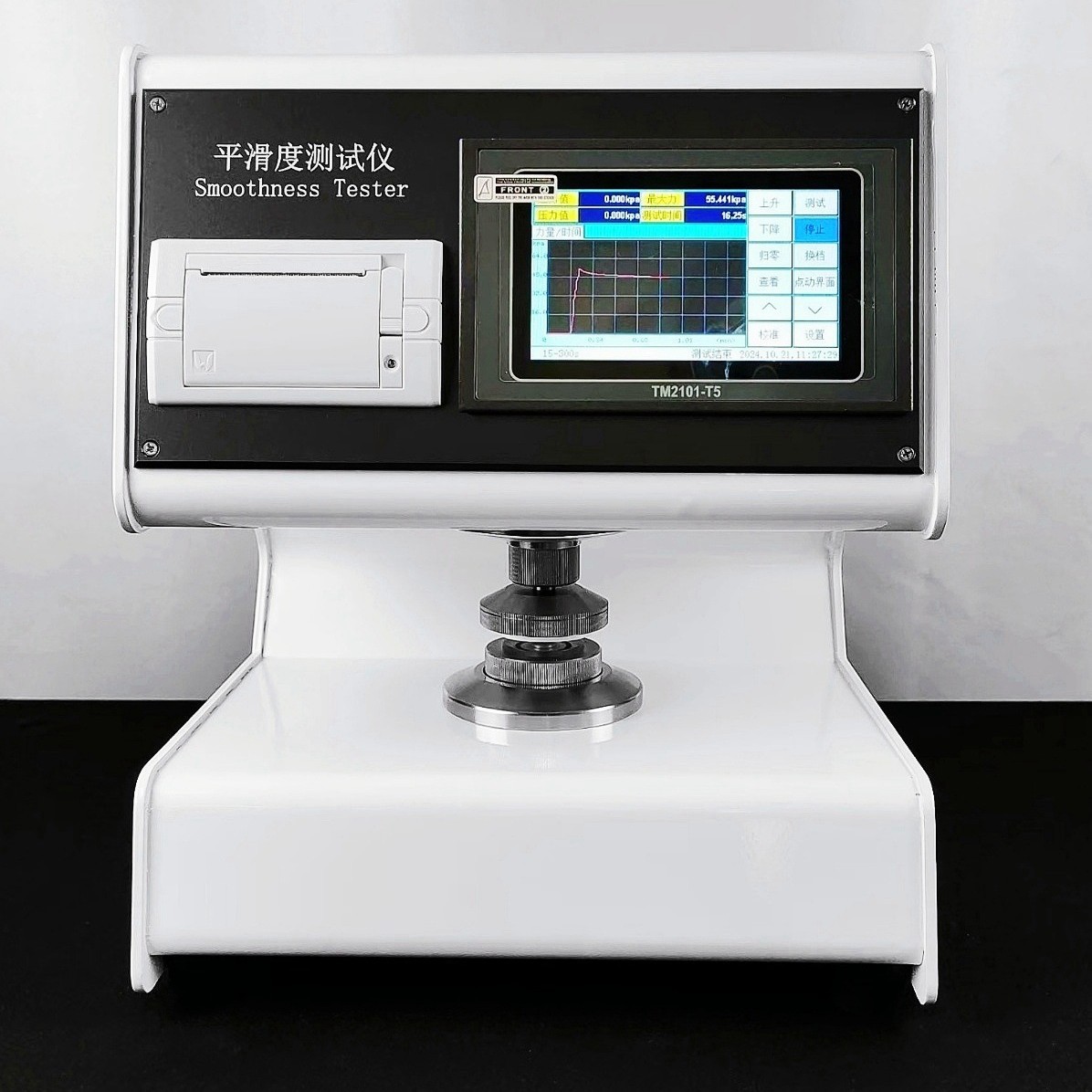 全自动平滑度测定仪是测定纸张平滑度的专用仪器。根据国际通用的别克(Bekk)式平滑仪工作原理设计。 仪器在机械设计上取消了传统的杠杆加重锤的手动施加压力结构,创新式地采用凸轮加弹簧,利用同步电机自动旋转加载标准压力。大大减少仪器的体积与重量。仪器采用5英寸触摸屏显示,具有中、英文菜单。界面美观亲和,操作简便,测试时一键操作。仪器同时具备测试、计算两面差的功能。仪器采用高精度传感器和原装进口无油真空泵等一系类先进的元器件。仪器具有标准中包含的各项参数测试、转换、调节、显示、记忆、打印功能,仪器具有强大数据处理能力,可直接得出各项数据的统计结果。这些数据存储在主芯片内,可以通过触屏操作查看。仪器具有技术先进、功能齐全、性能可靠、操作方便等优点,是造纸、包装、科研及产品质量监督检验等行业和部门理想的试验设备。