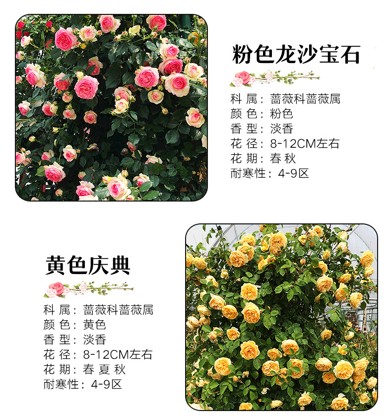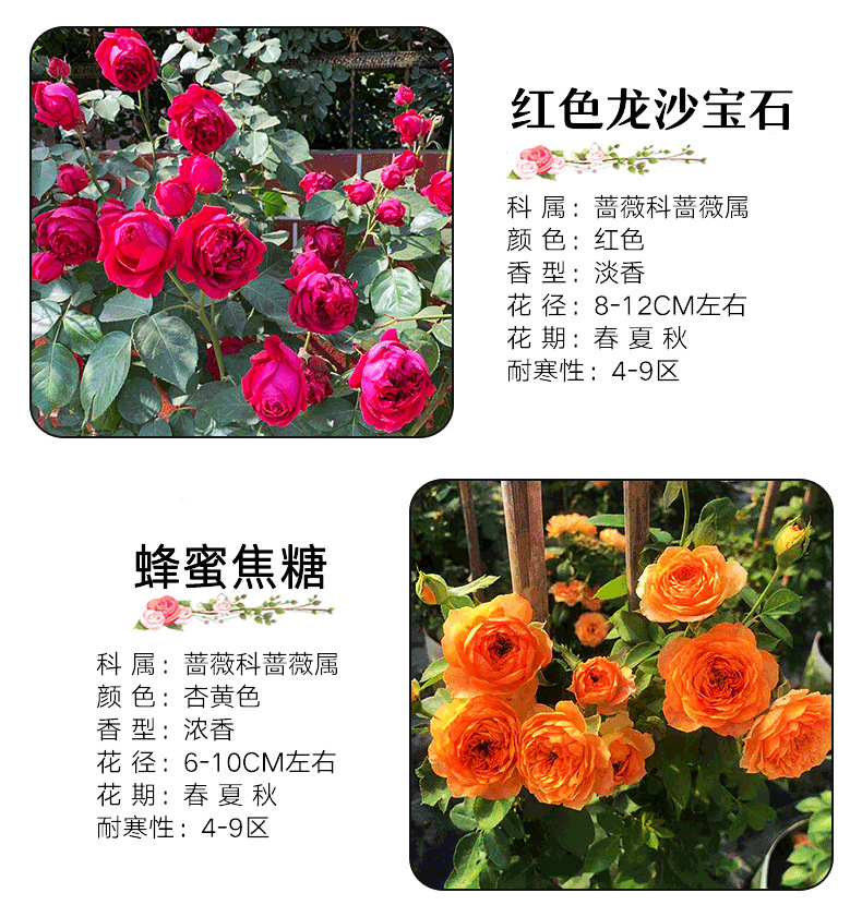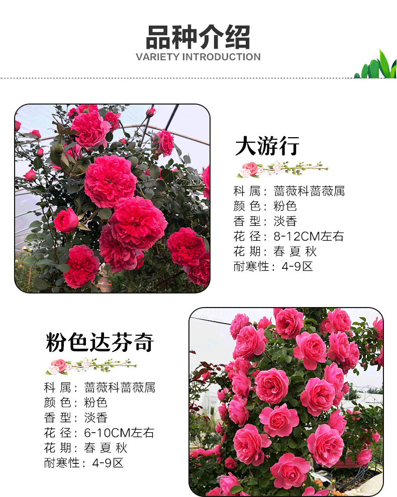 лавандовый венок; парад; лоза радуга; розовый да Винчи; драгоценный камень песка красного дракона; золотое торжество; Анжела; виноградная лоза, малыш; миссис Шарлотта; свободный дух; смеяться; Тэн Сяо И; принцесса; сладких снов; мое сердце; розовый драгоценный камень лонза; синий дождливый; медовая карамель; Айла помпон; Элисастер; Шекспир 2000; аромат палисандра; Флорентина; импрессионизм; розовое дерево; Кнопка Rouge; Рой; маленькая девочка