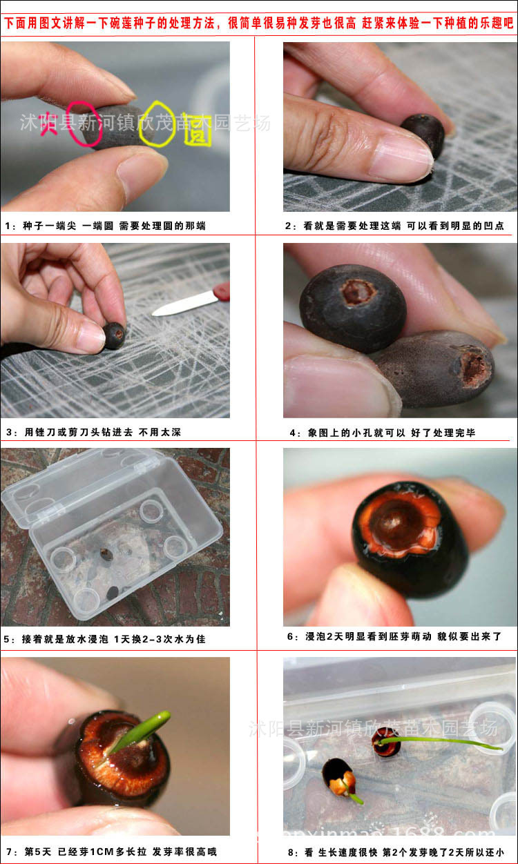 1、处理种子:把种子凹陷的一端弄破,可用刀切下1-2mm的种皮,也可在地面上摩擦。 2、浸泡催芽:把种子泡到水里,温度在20-30℃之间,每天换水,3-5天可萌芽。 3、移栽水培:长出小叶子后,可移栽到花盆中,用陶粒固定即可,水位加在叶子下面。”