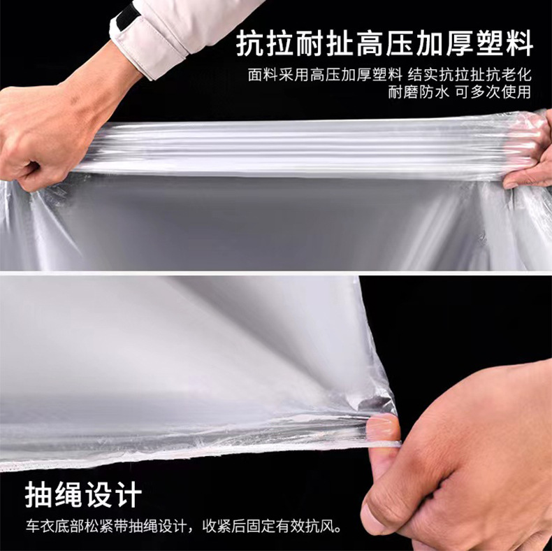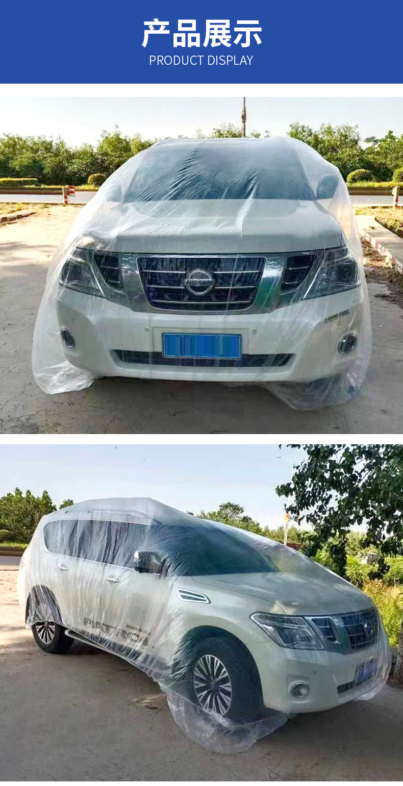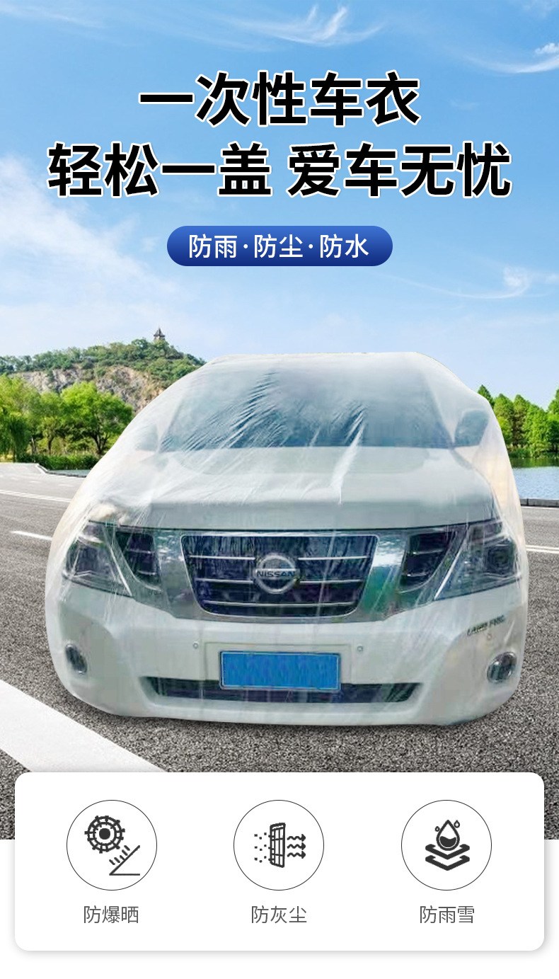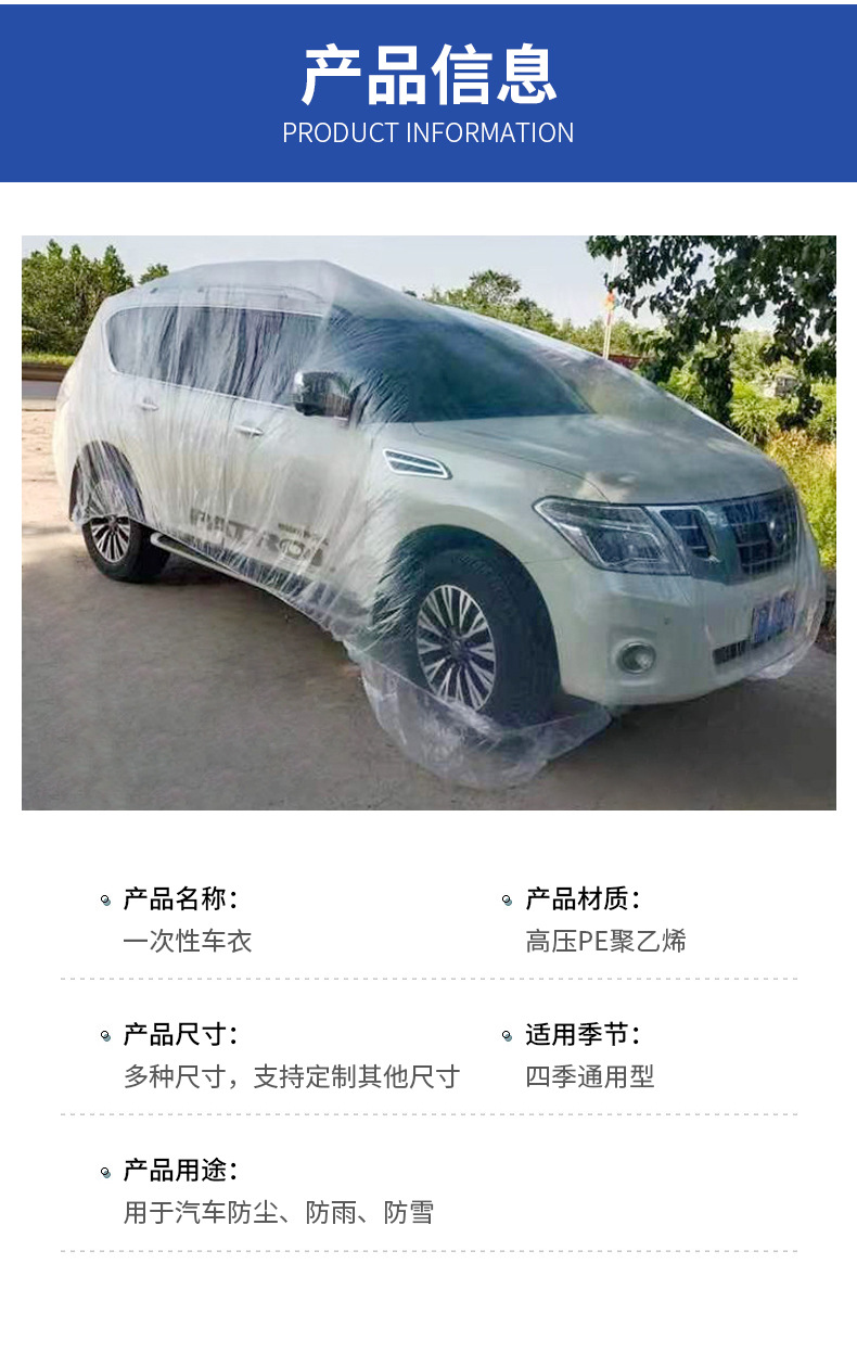 一次性车衣是由聚乙烯塑料材料(LLDPE)制作而成。主要用来防尘,防污染,防雨雪霜降。携带方便,多用于车辆的仓储存放,露天存放,以及高污染环境中的车辆存放等