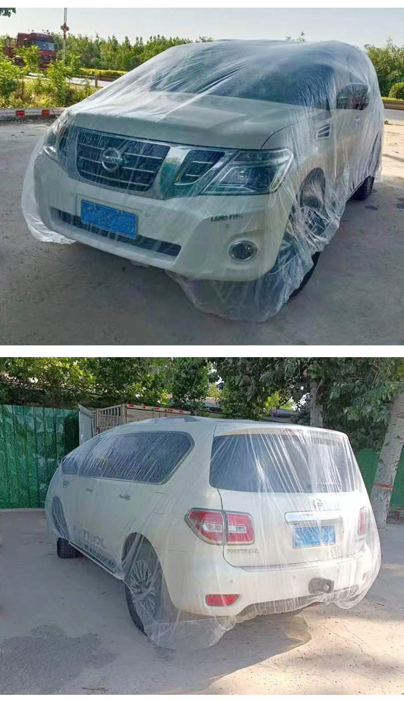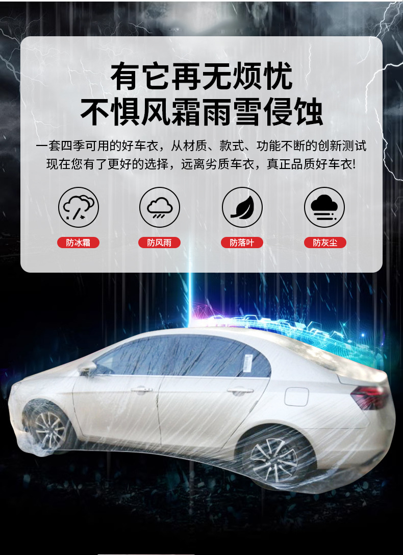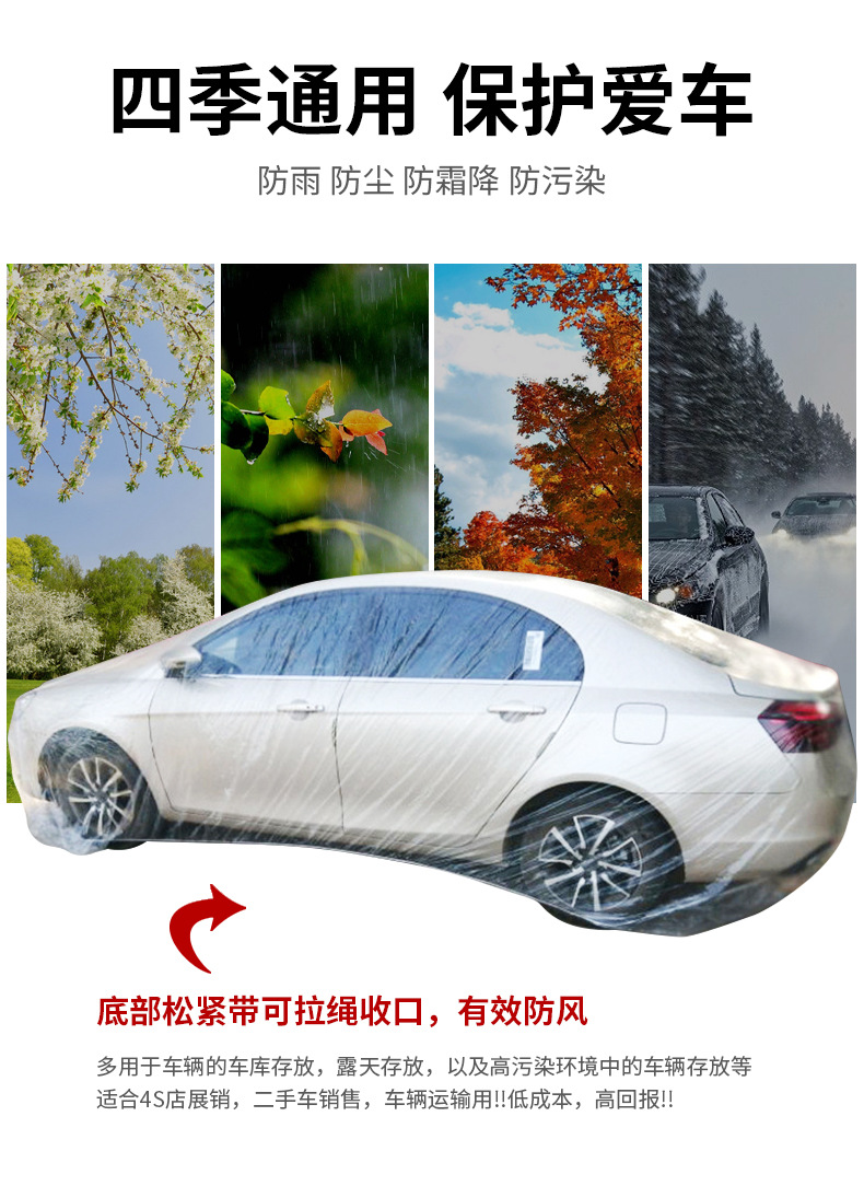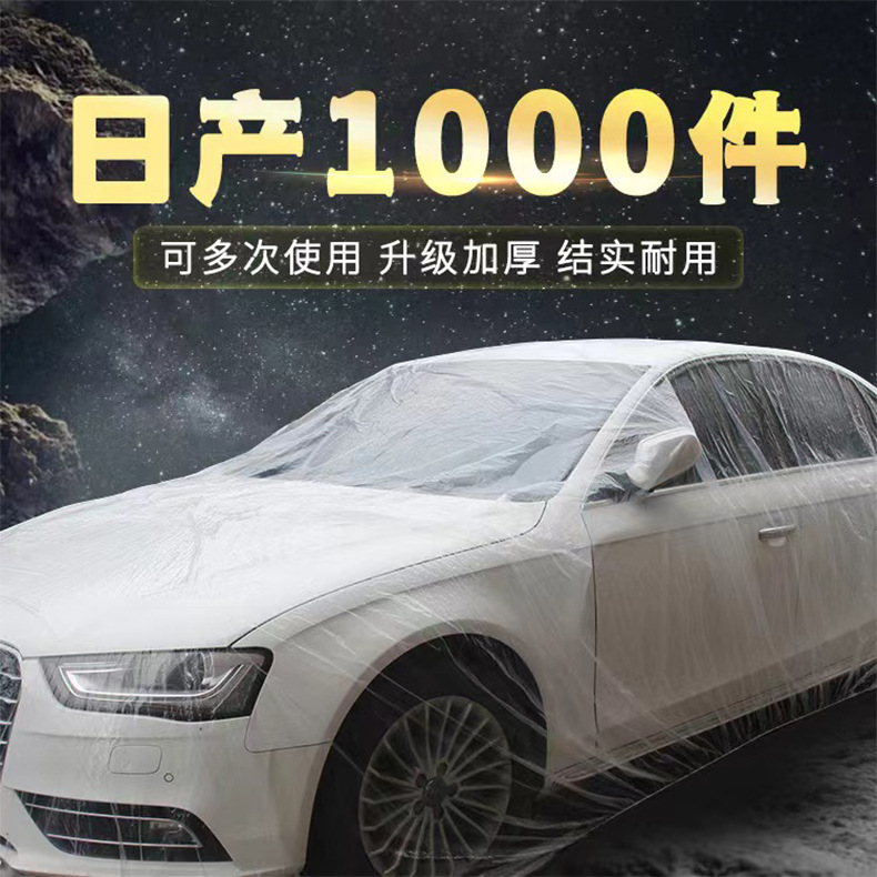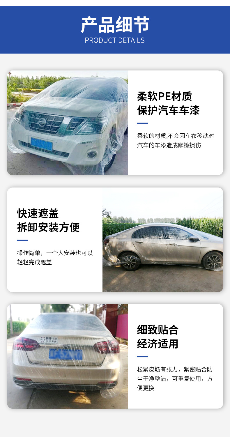一次性车衣是由聚乙烯塑料材料(LLDPE)制作而成。主要用来防尘,防污染,防雨雪霜降。携带方便,多用于车辆的仓储存放,露天存放,以及高污染环境中的车辆存放等