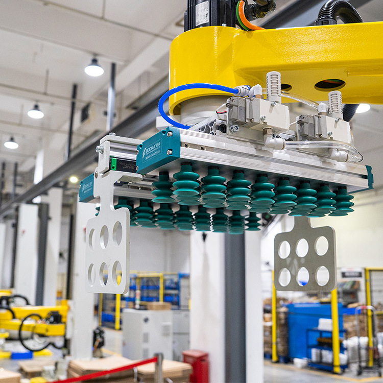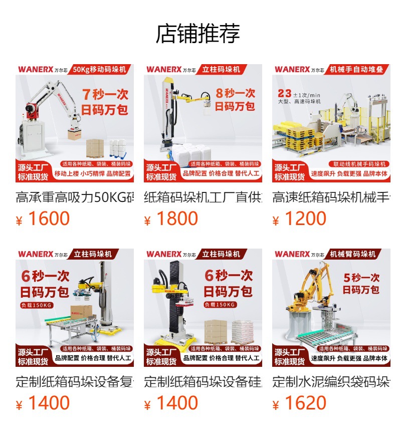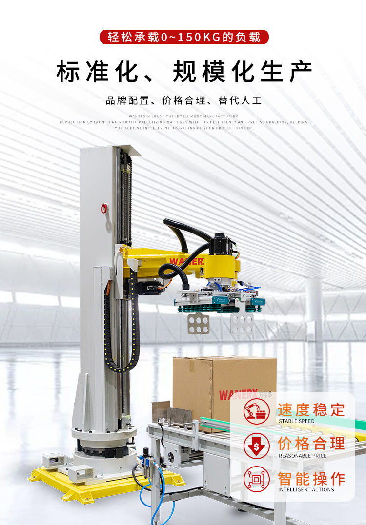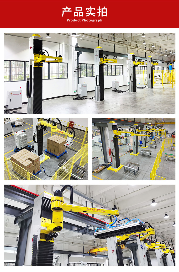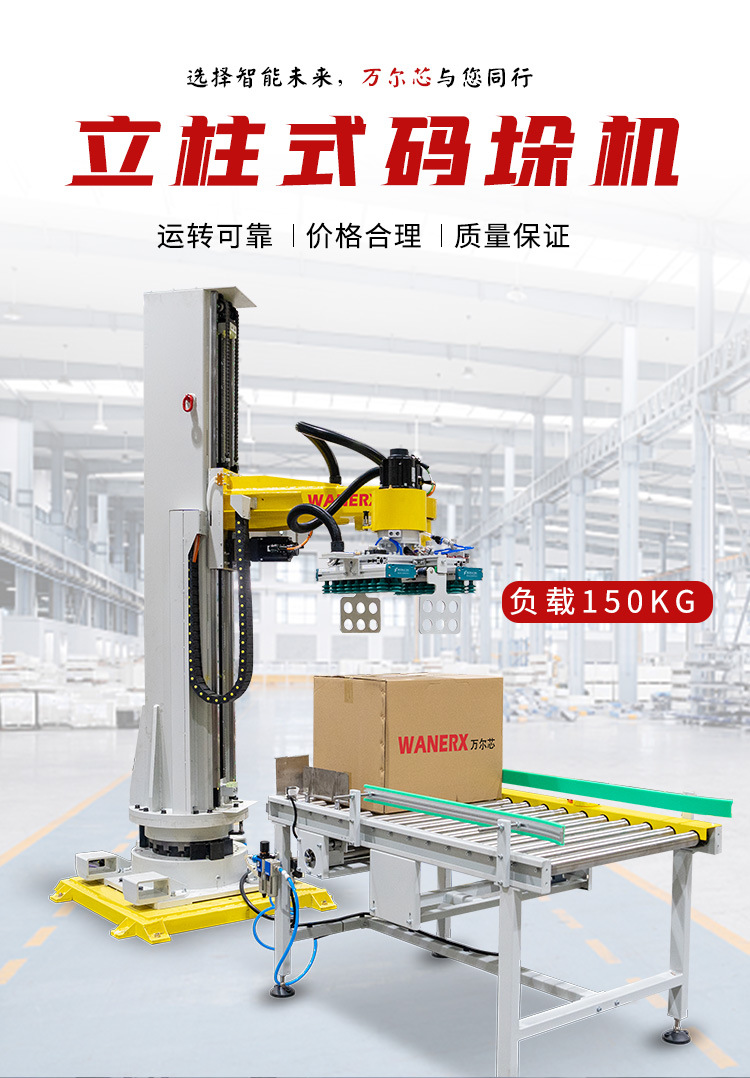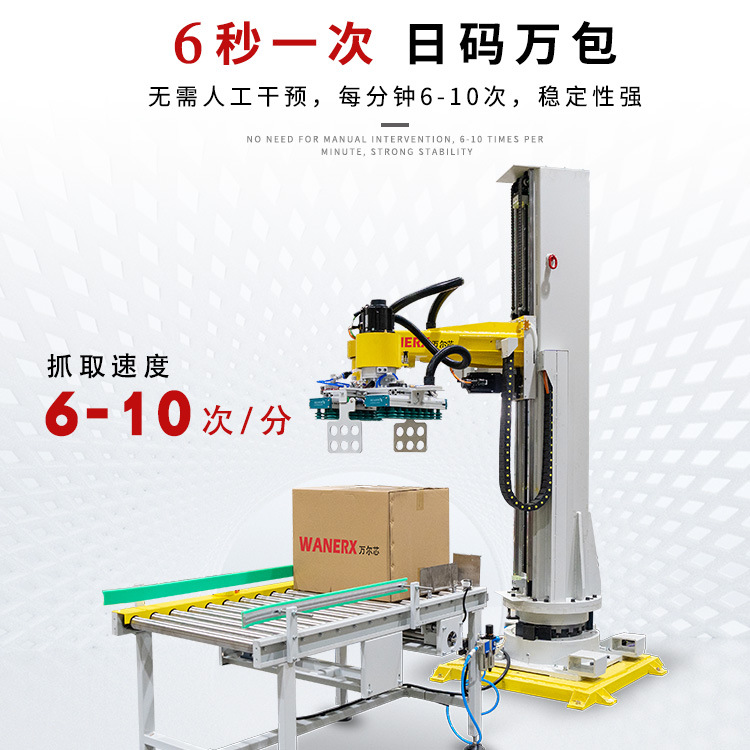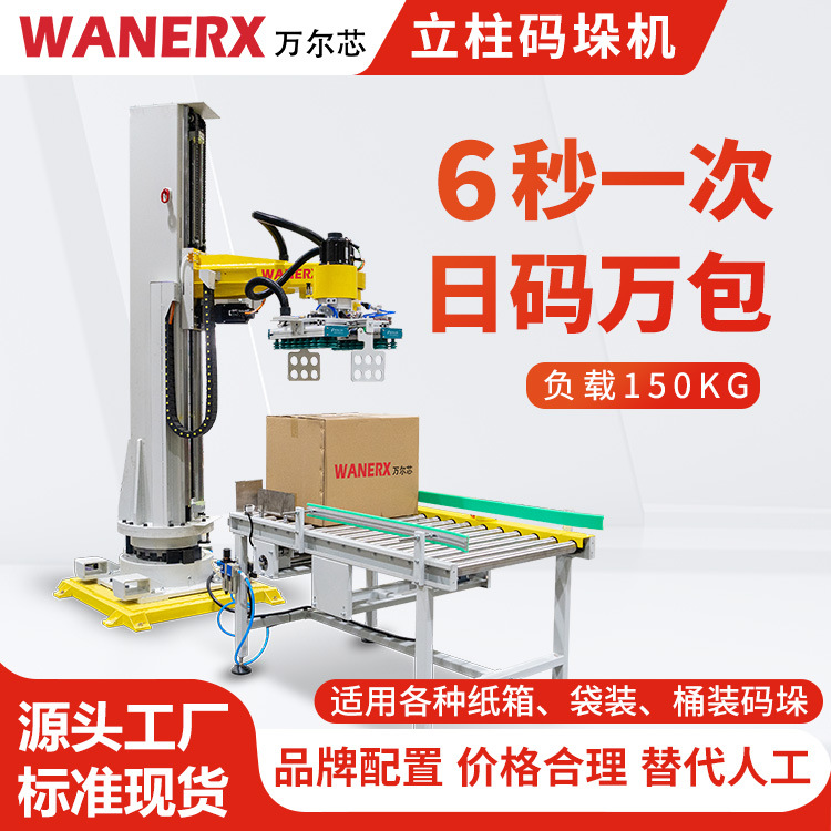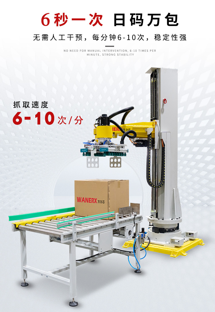 Автоматическая колонная паллетизирующая машина для тканых мешков с высокой нагрузкой 150 кг, предназначенная для упаковки и штабелирования картонных коробок с бытовой химикатами.