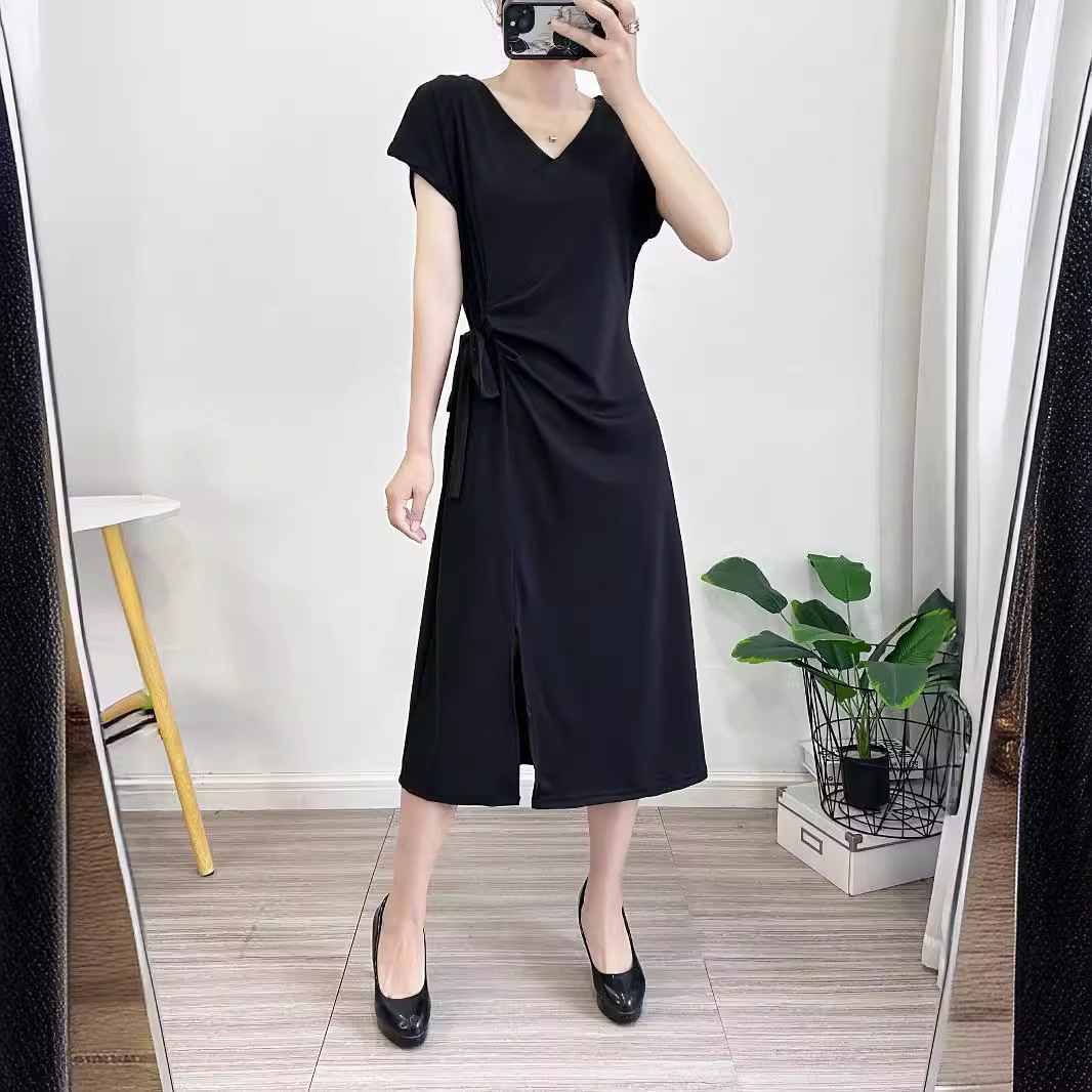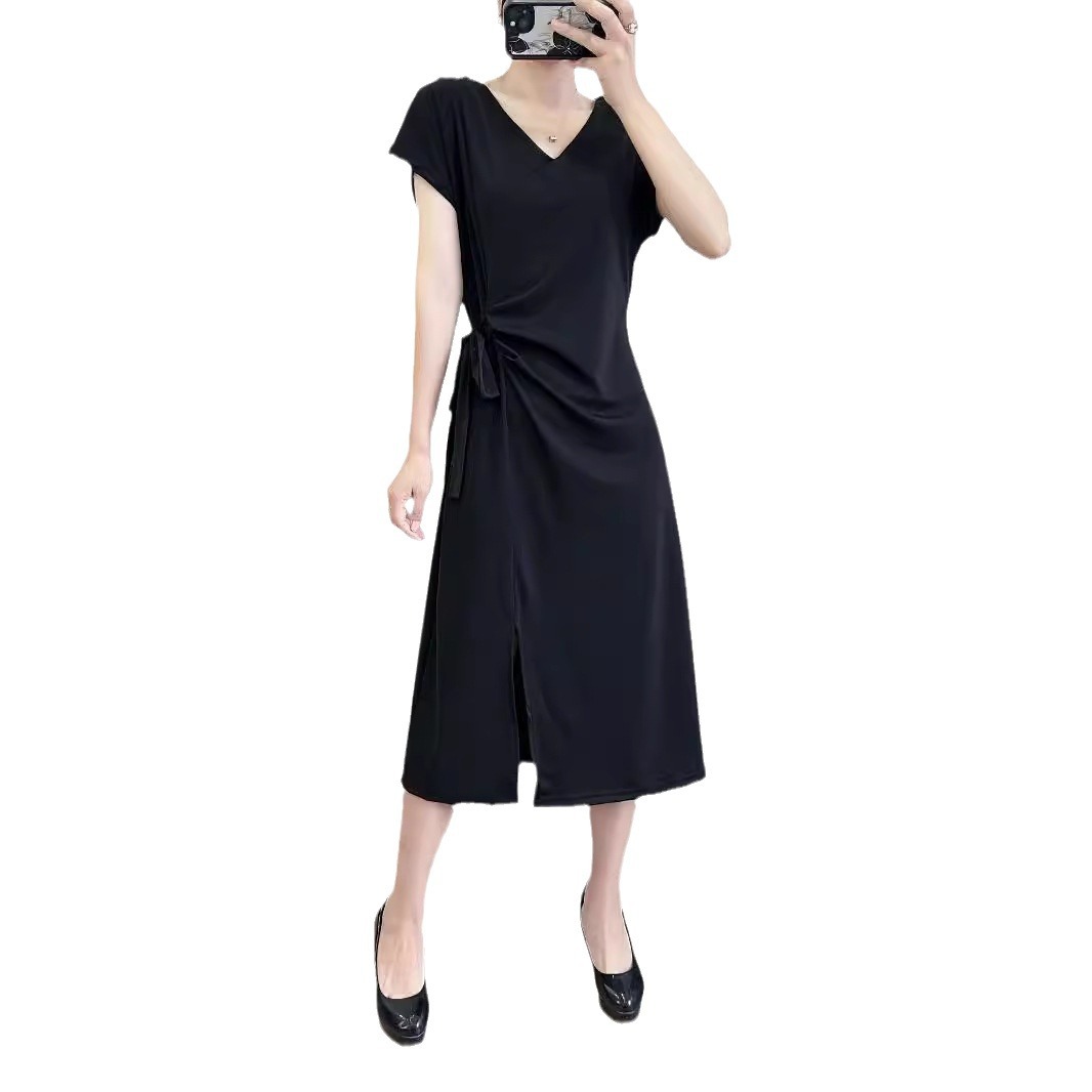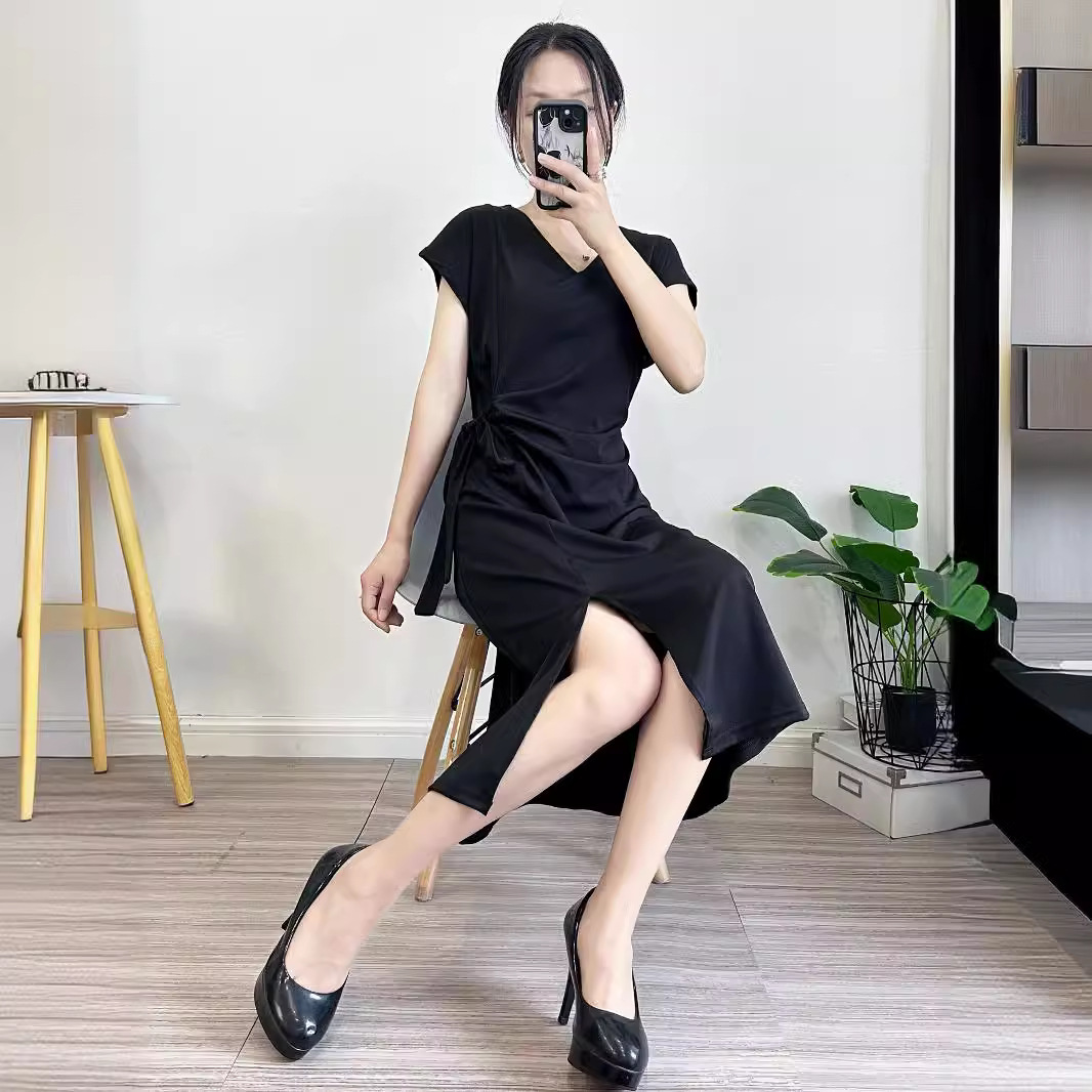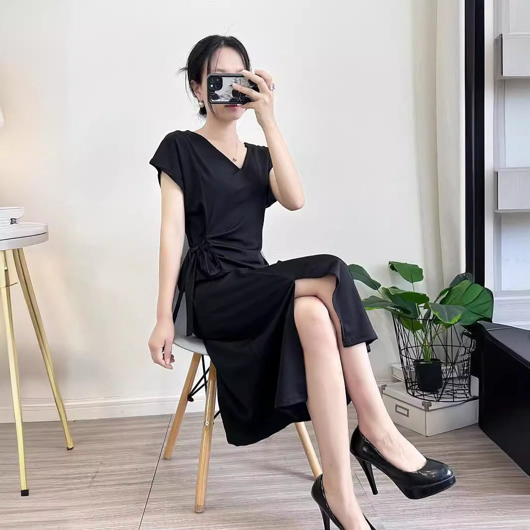 Летнее платье с коротким рукавом 2025 года, новое, в стиле Хепберн, с разрезом, маленькое черное платье, во французском стиле, элегантное, с V-образным вырезом, стройнящее фигуру.