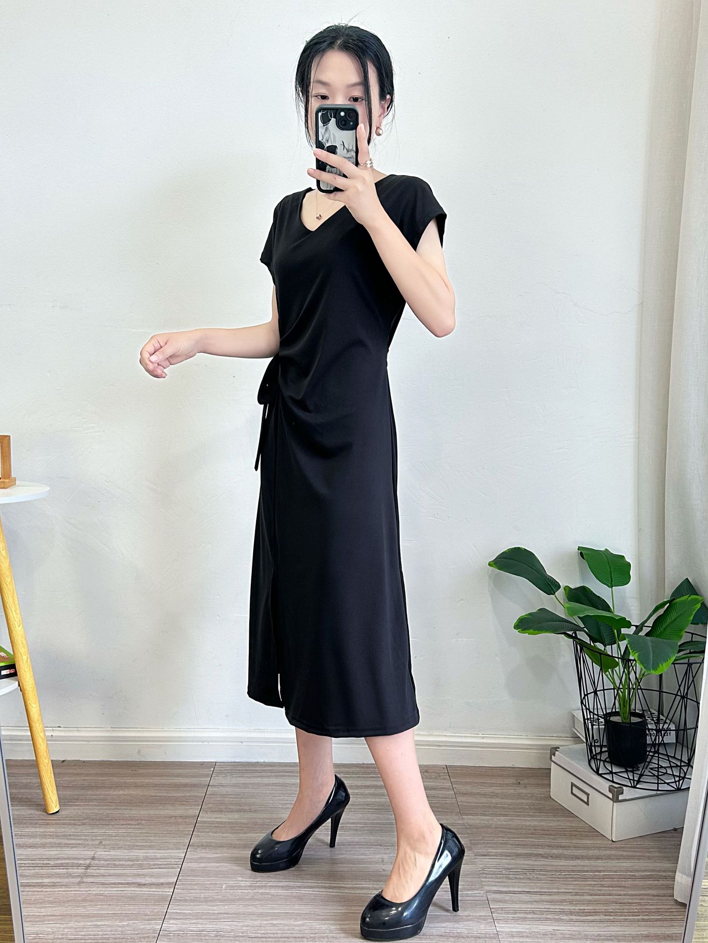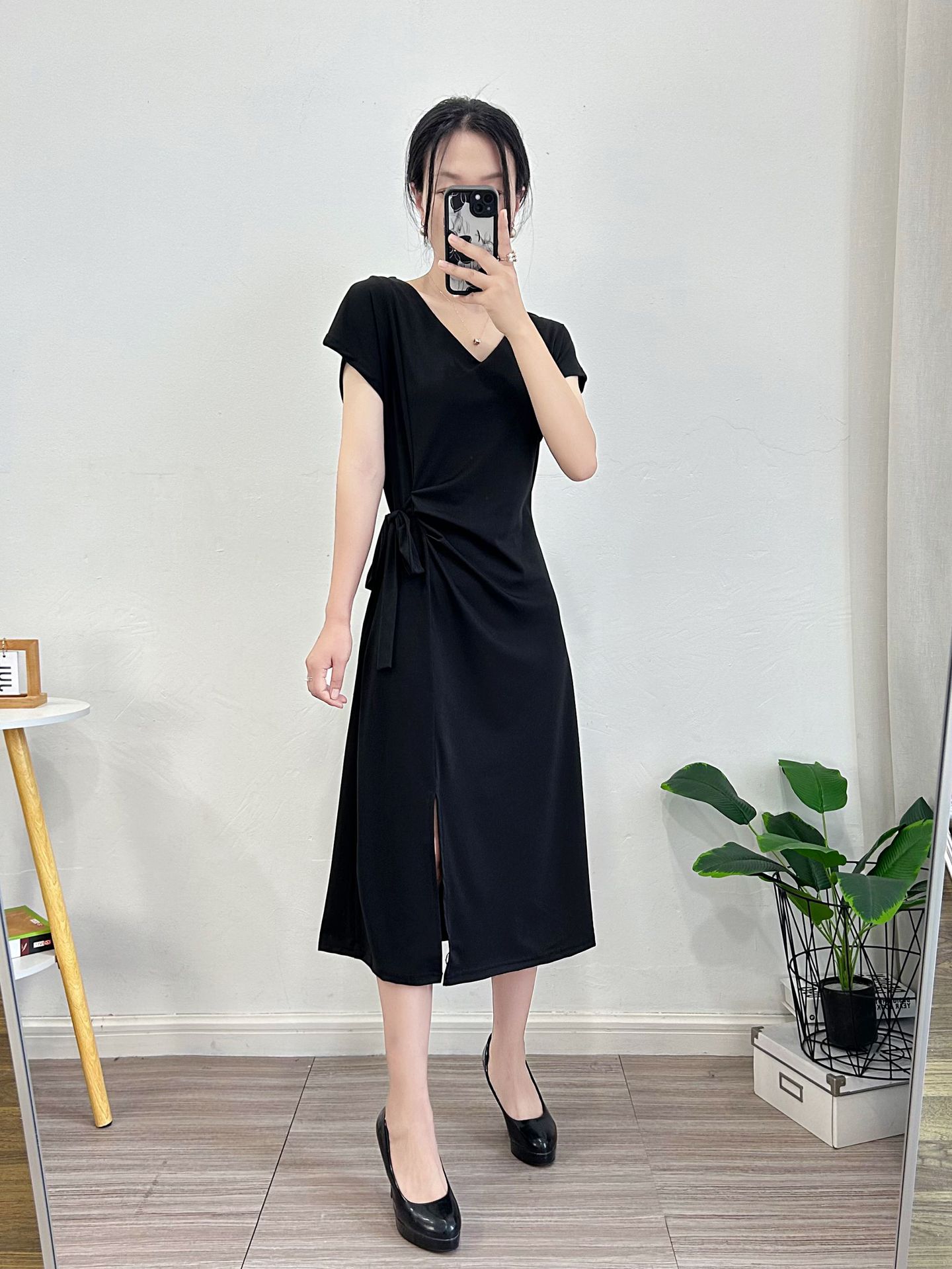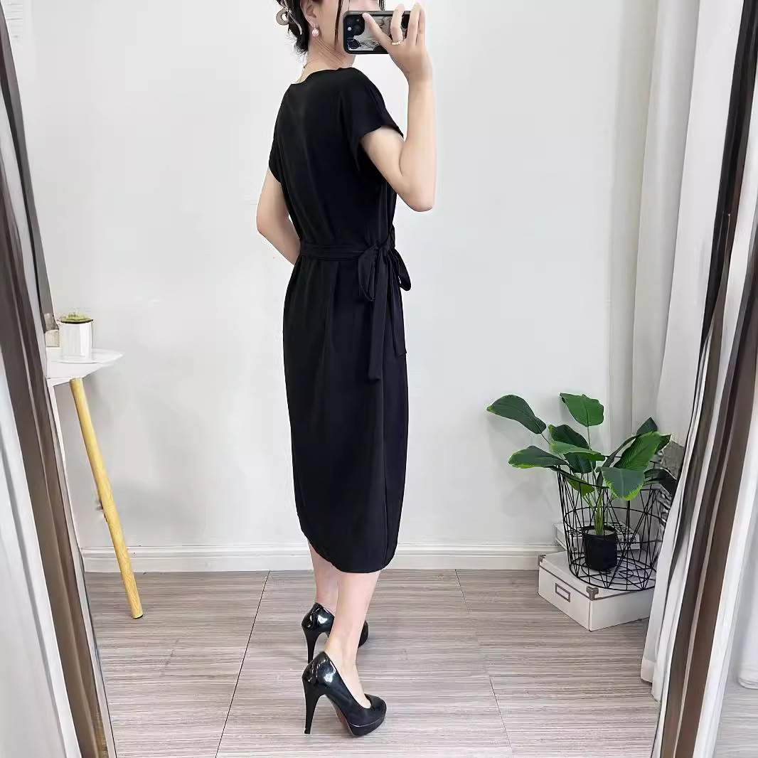Летнее платье с коротким рукавом 2025 года, новое, в стиле Хепберн, с разрезом, маленькое черное платье, во французском стиле, элегантное, с V-образным вырезом, стройнящее фигуру.