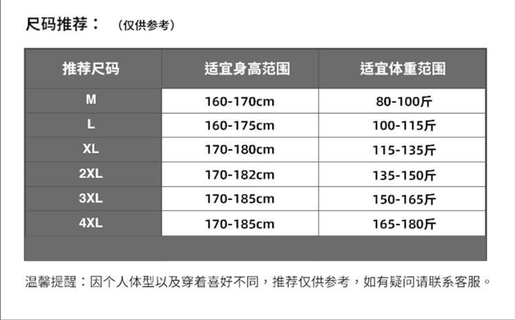 M рекомендует 80-100 кг; L Рекомендуется 100-115 кг; XL рекомендует 115-135 кг; 2XL рекомендует 135-150 кг; 3XL рекомендует 150-165 кг; 4XL рекомендует 165-180 кг