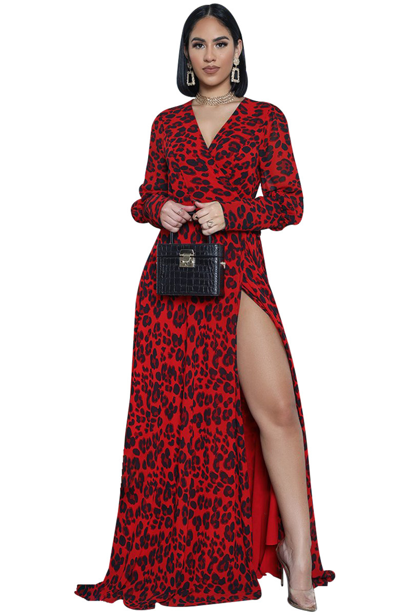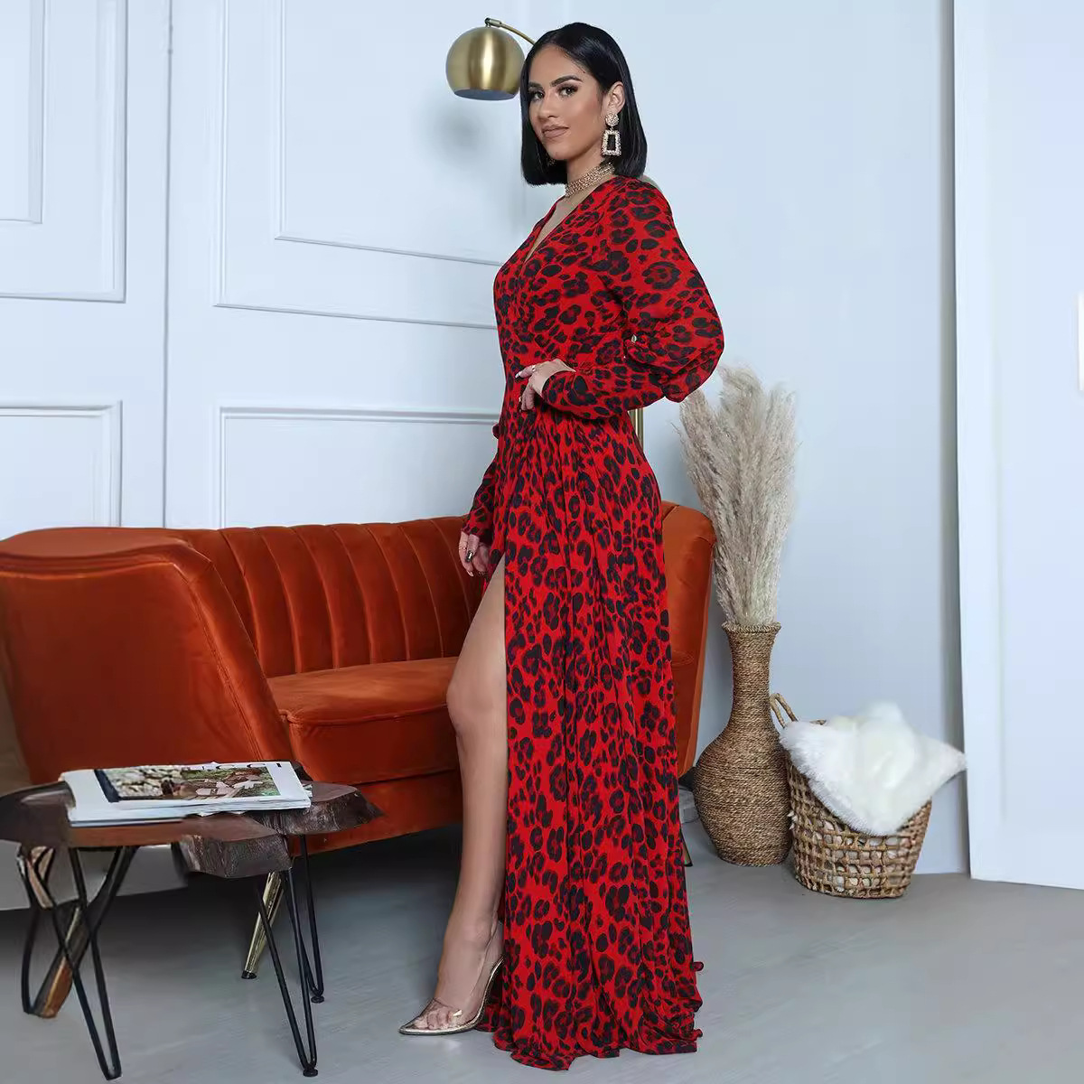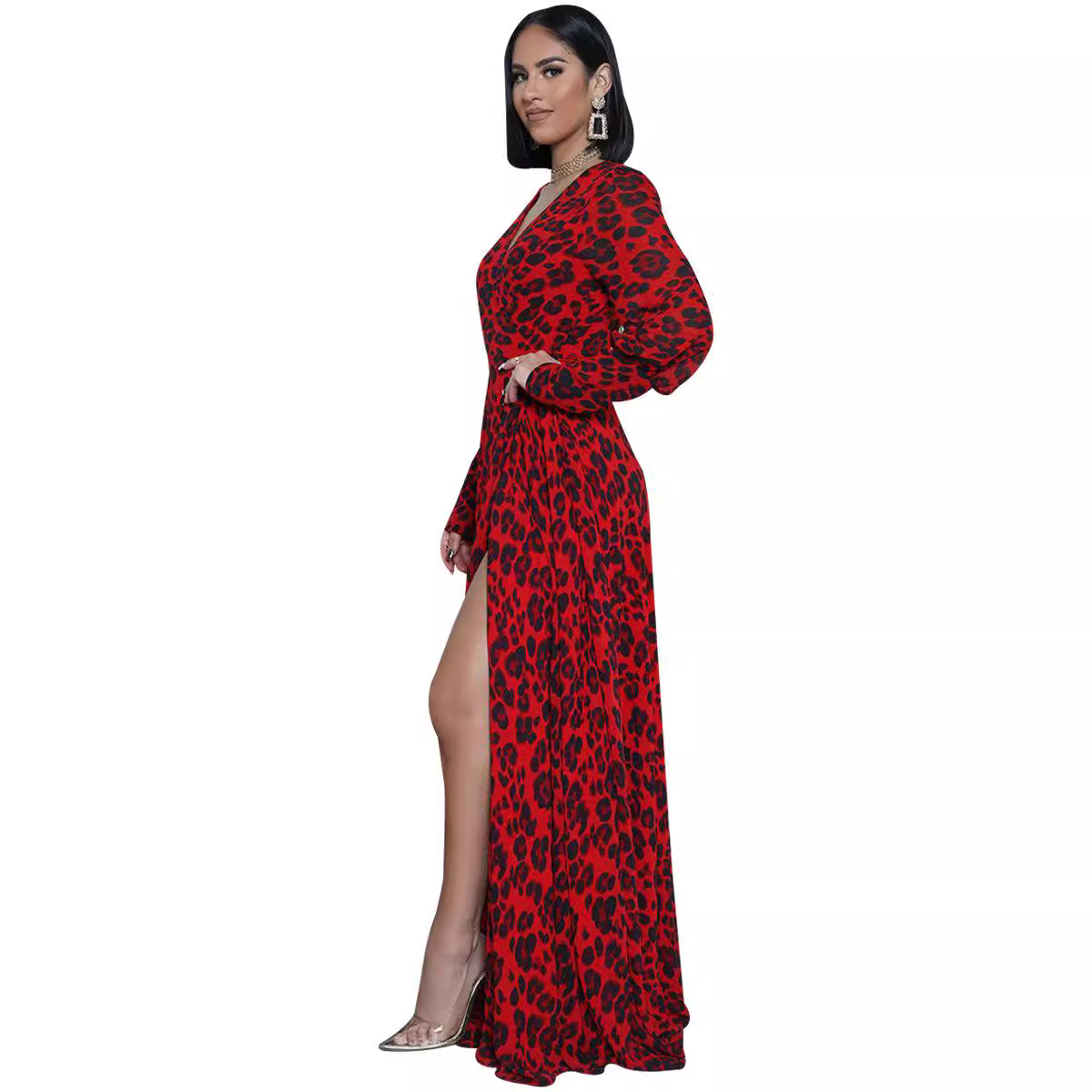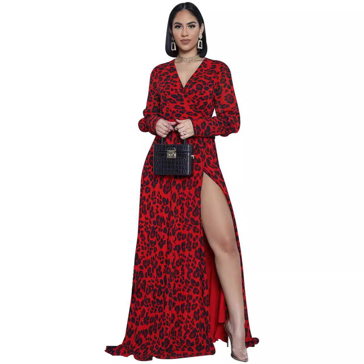 3205 Амазонка Горячая Юбка Осень с открытыми вилками длинное платье европейское и американское леопардовое темпераментное платье с длинными рукавами