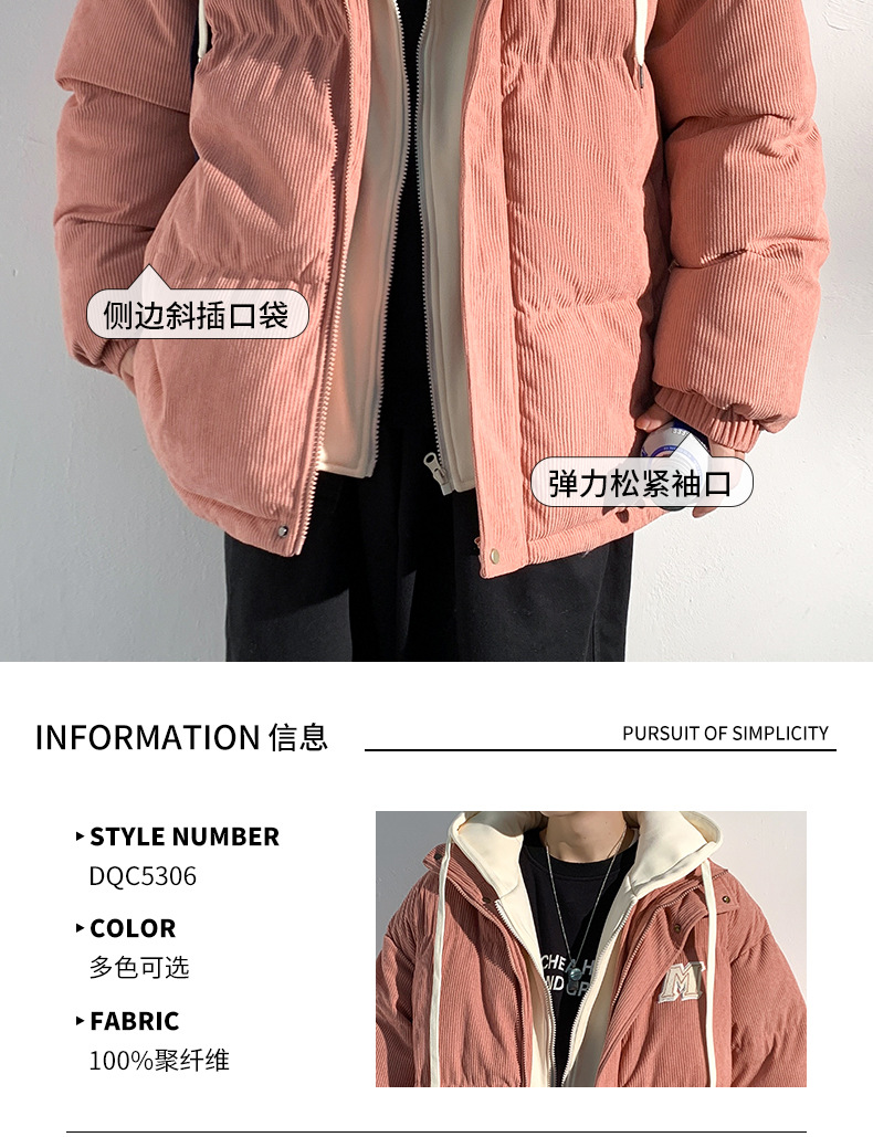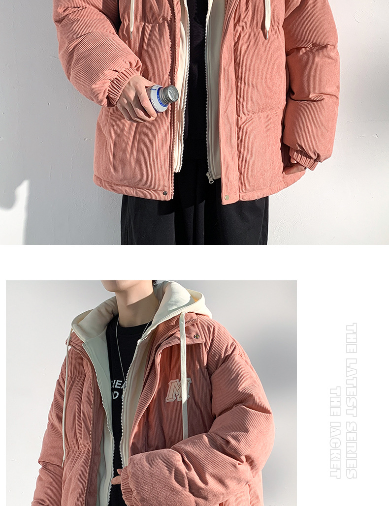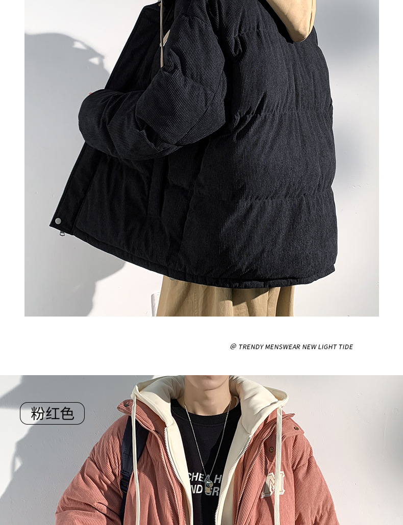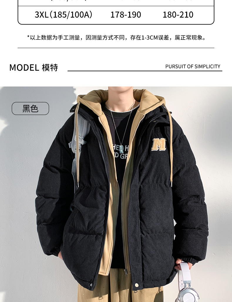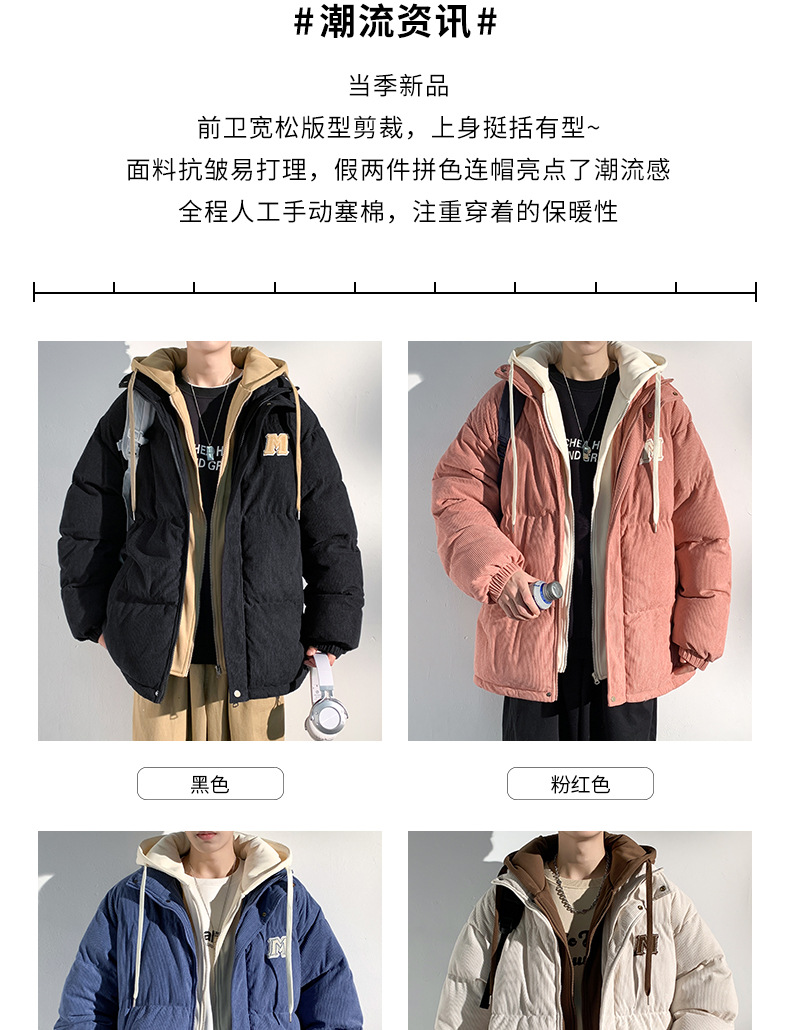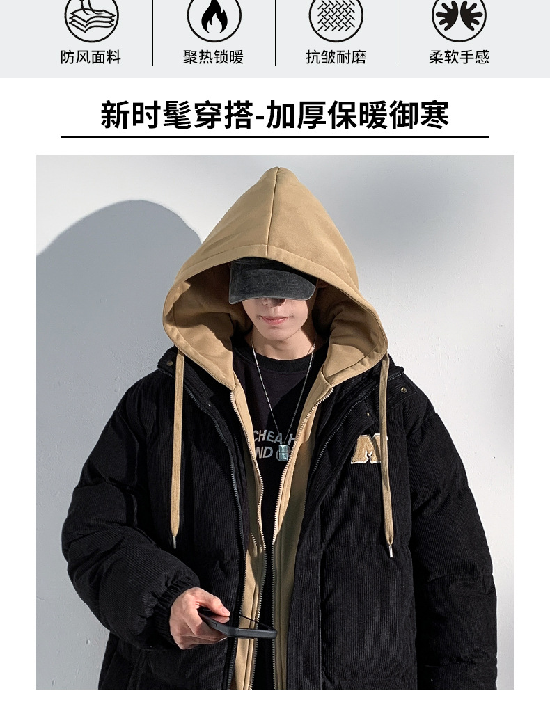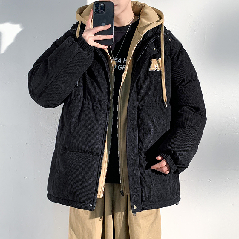 Новая зимняя вельветовая хлопчатобумажная куртка для мужчин в Гонконге свободный сплошной цвет с капюшоном поддельные две модные хлопчатобумажные куртки