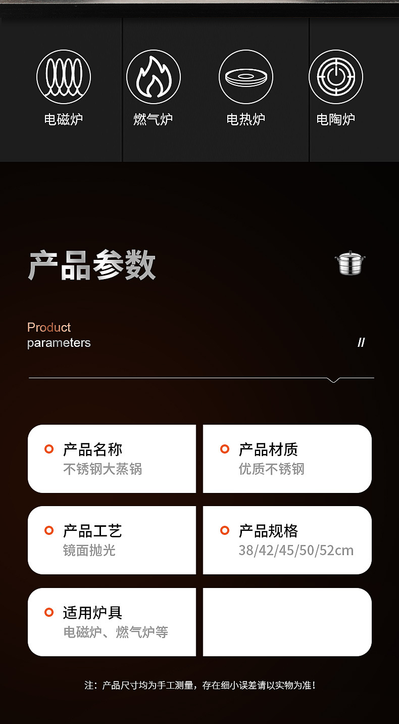 [Рекомендуется для дома] 36 см; [Рекомендуется для дома] 38 см; [Рекомендуемый семейный банкет] 40 см; [Рекомендуемый семейный банкет] 42 см; [Рекомендуемый семейный банкет/бизнес] 45 см; [Настоятельно рекомендуется для бизнеса] 50 см