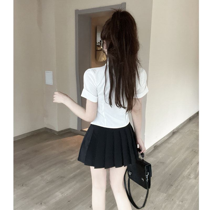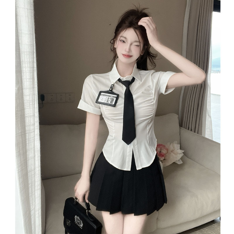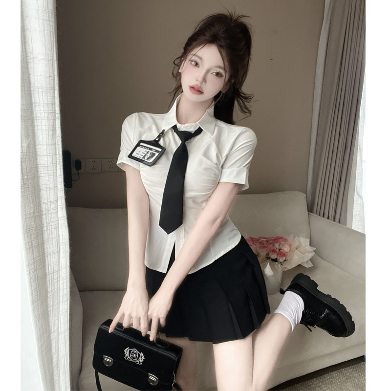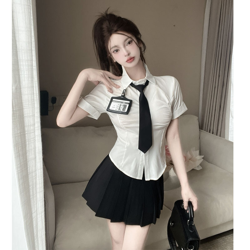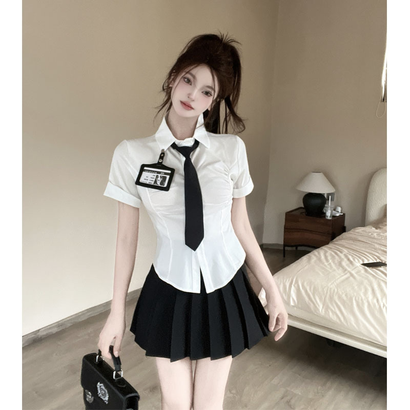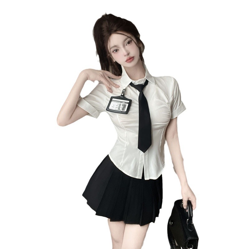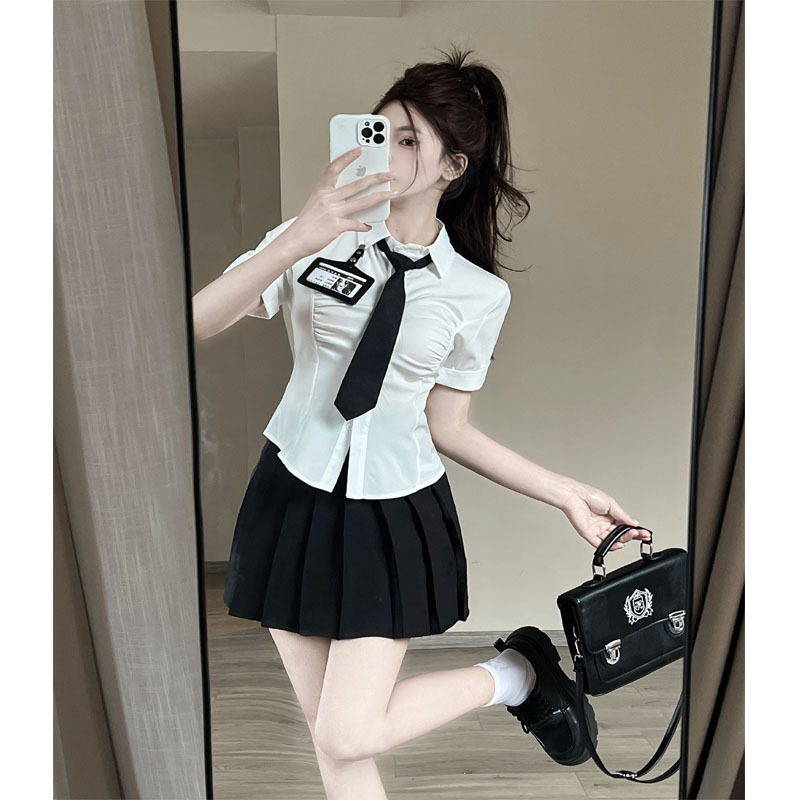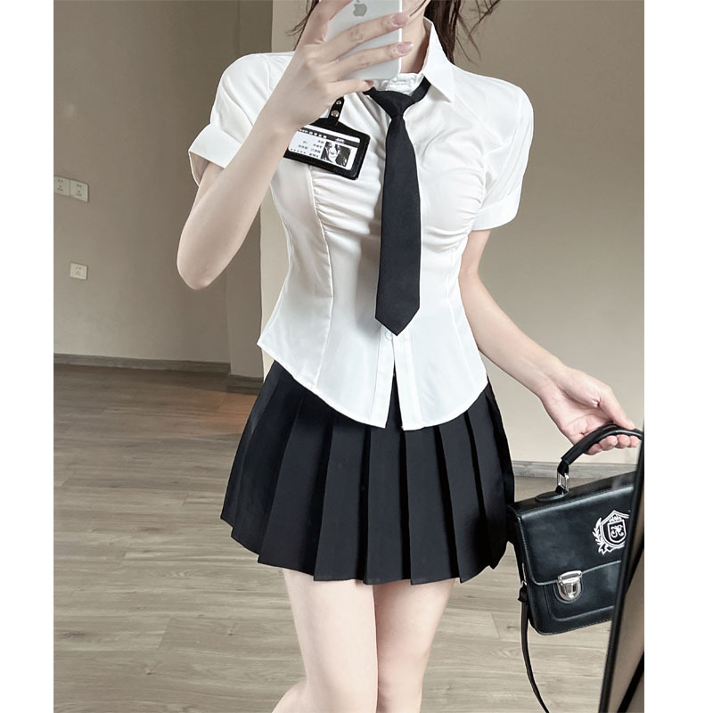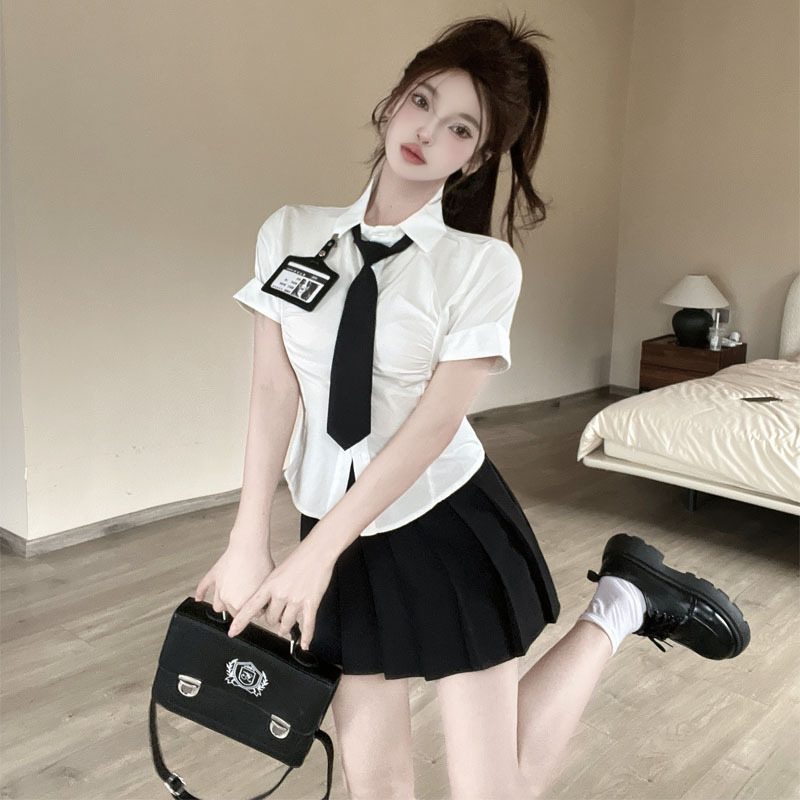 Белая рубашка галстук значок; Черная плиссированная юбка Белая рубашка с галстуком на груди