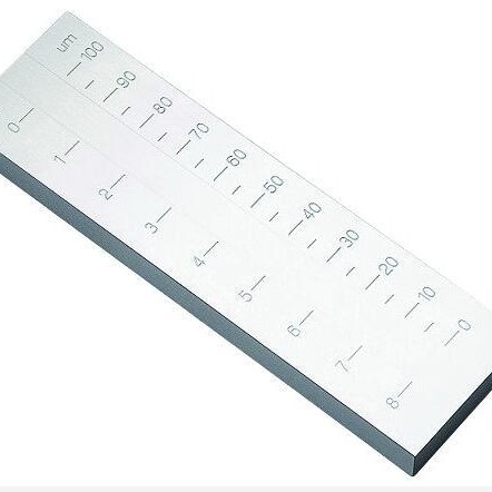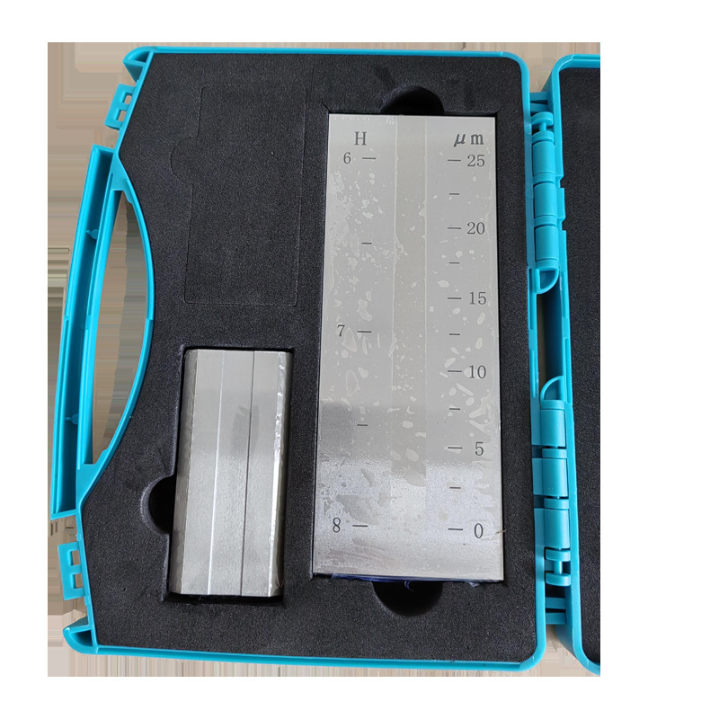 细度板是一个在表面有凹槽的平钢块,凹槽的深度由一端的小大变化至另一端的零值。在钢块上标注出一个或多个凹槽深度的标尺,以读出测量颗粒的大小。