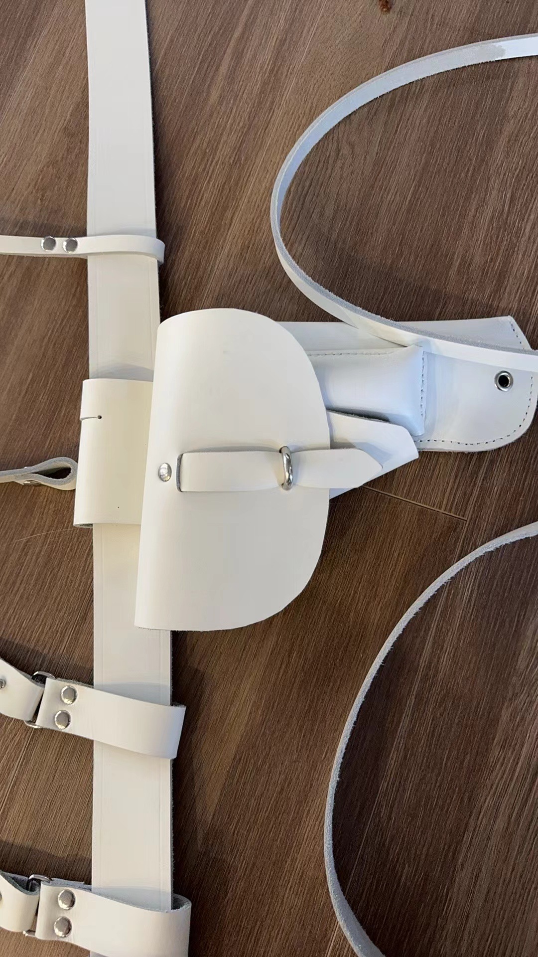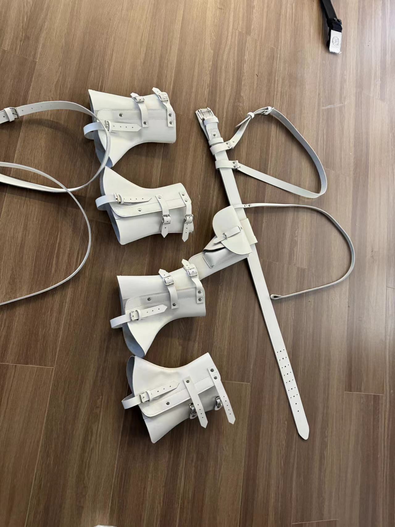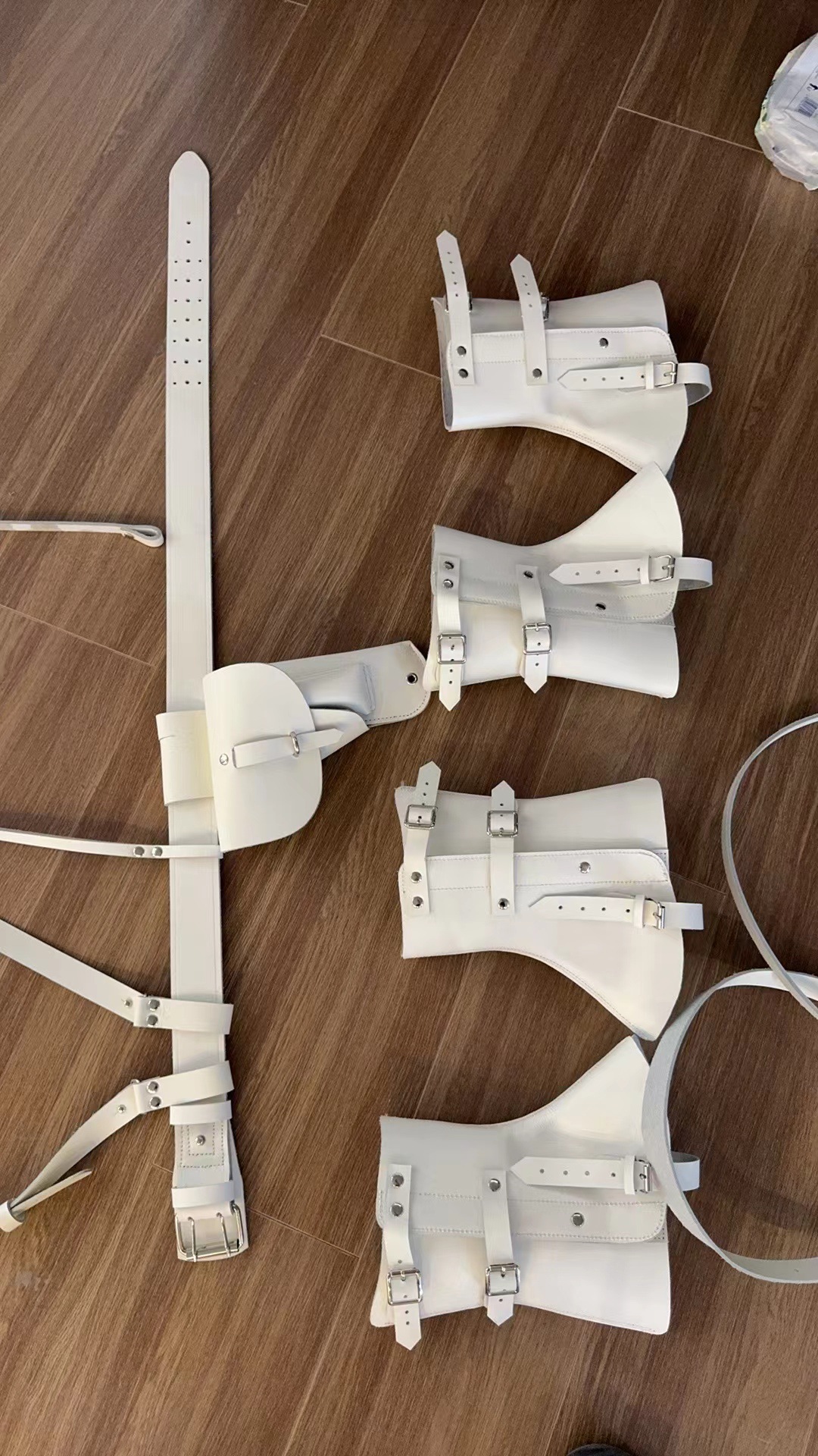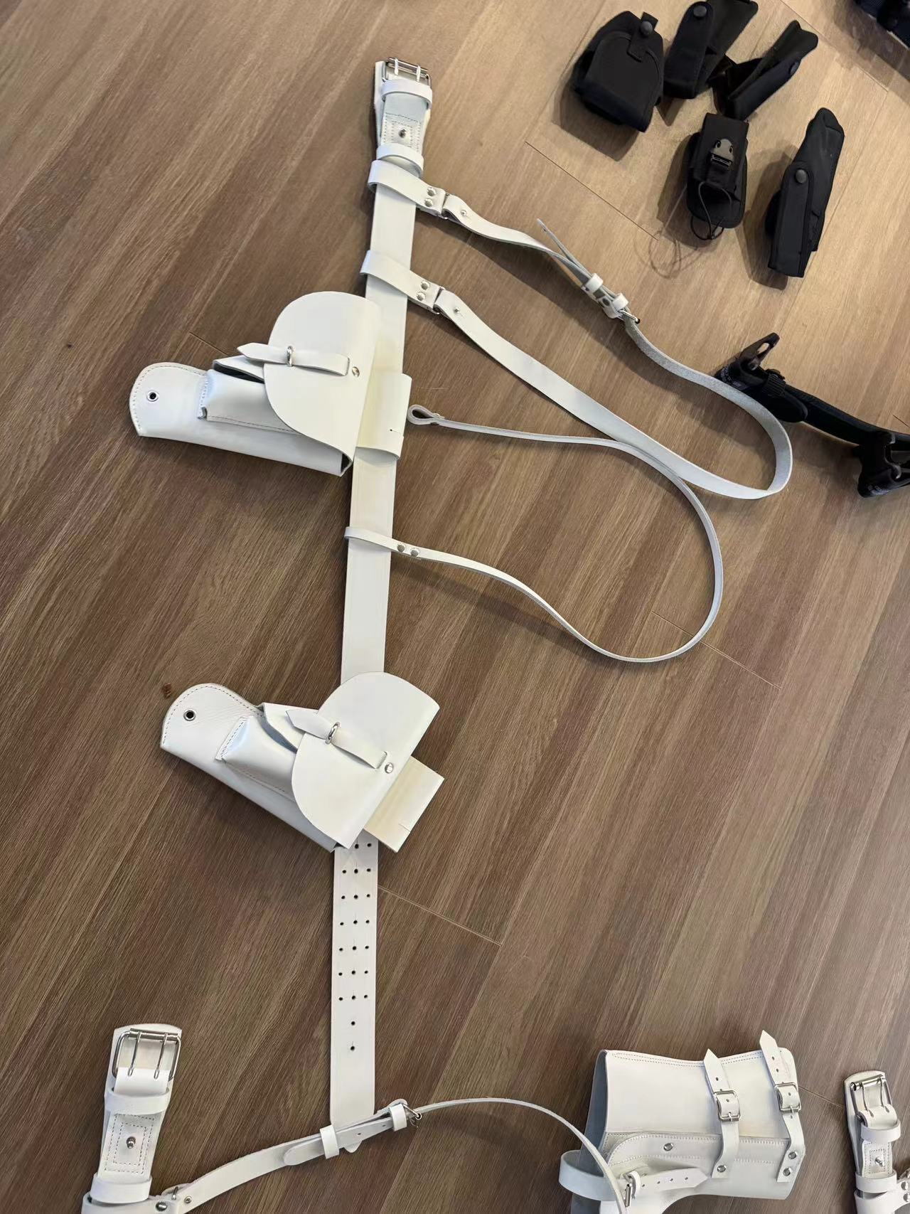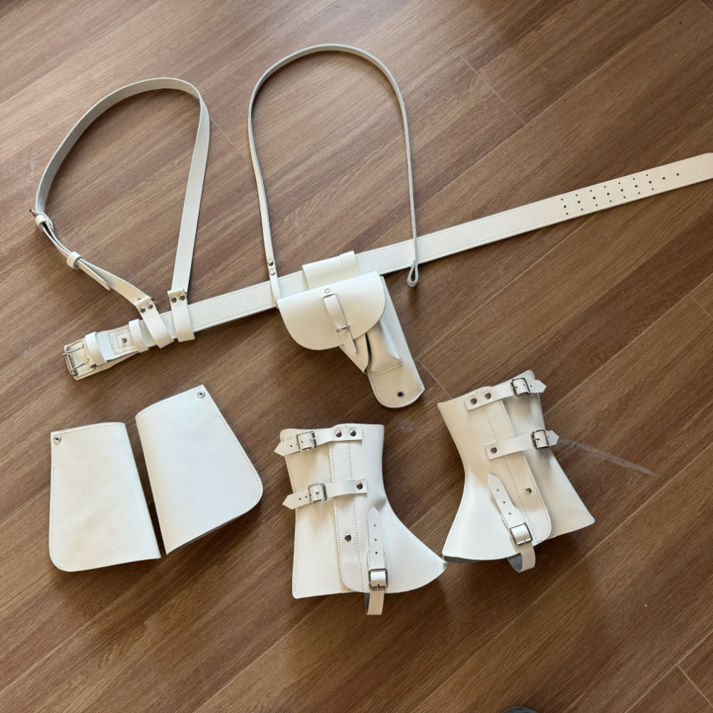 Белые кожаные нарукавники для левой и правой ноги, нарукавники для локтей, парадный пояс для церемоний, белая кожаная тренировочная кобура для пистолета.