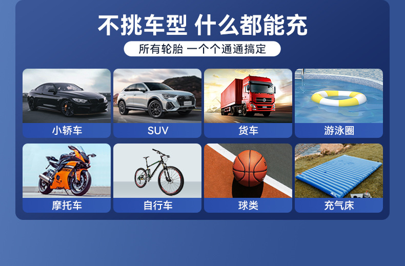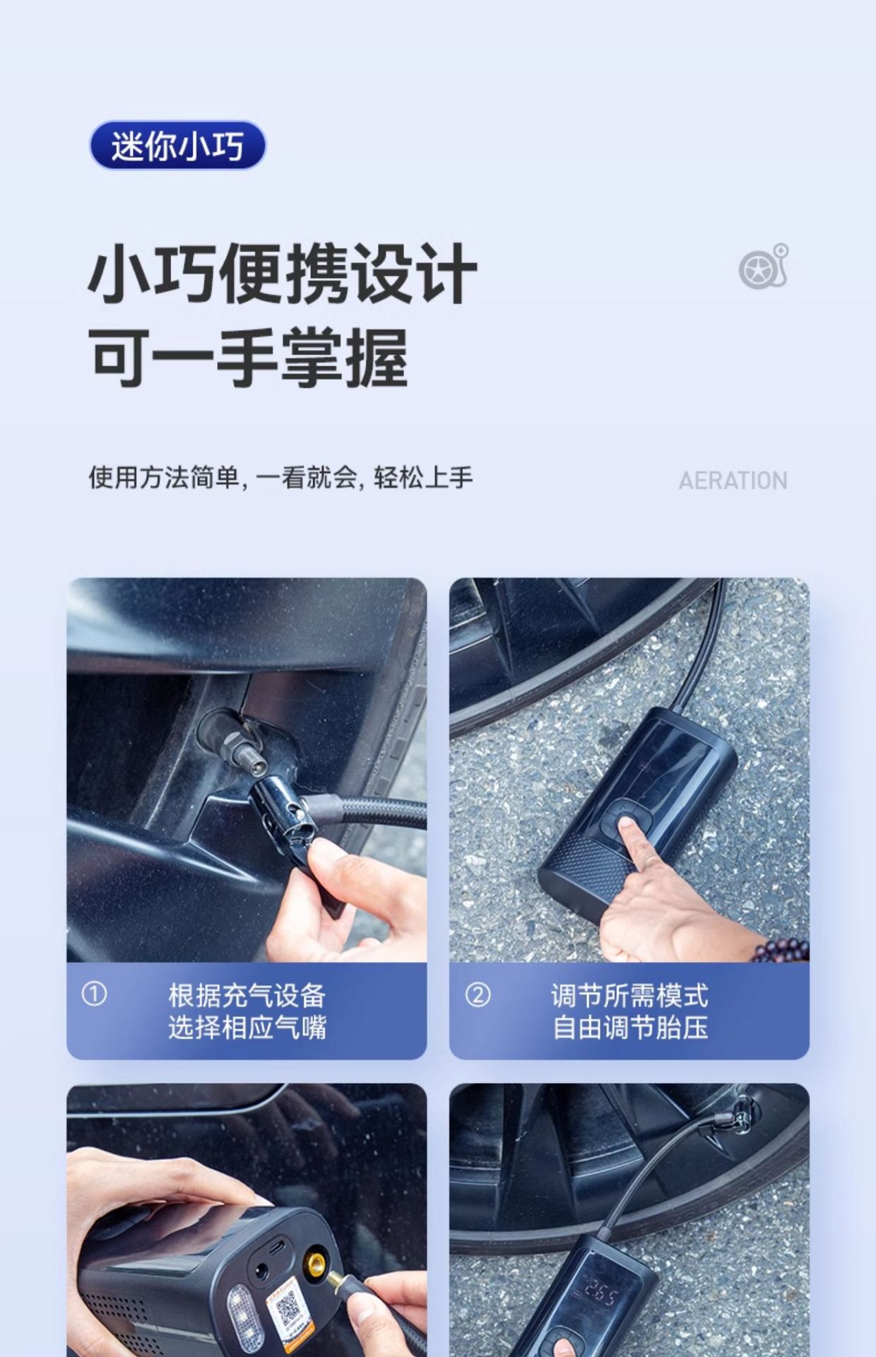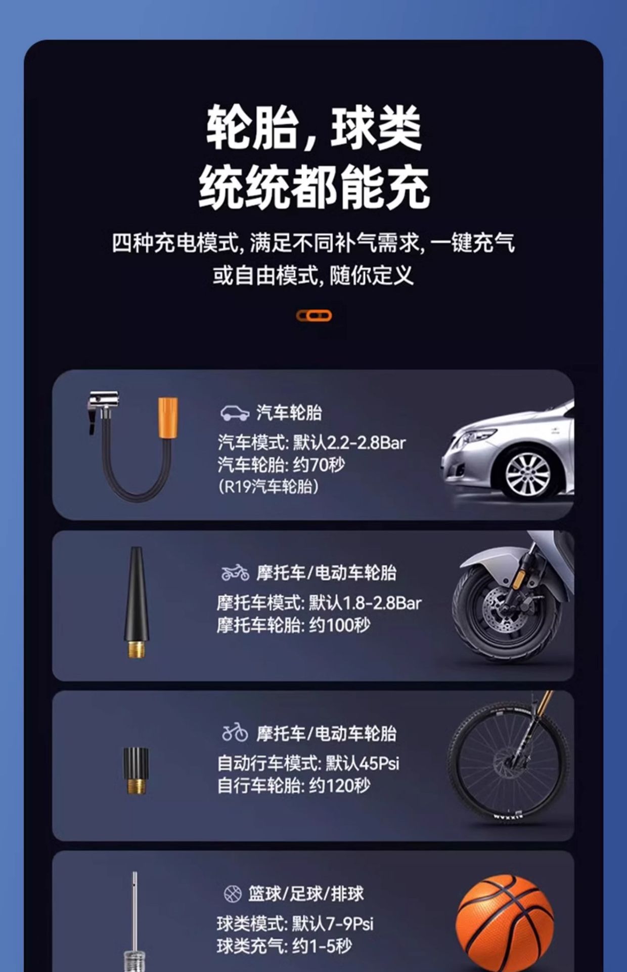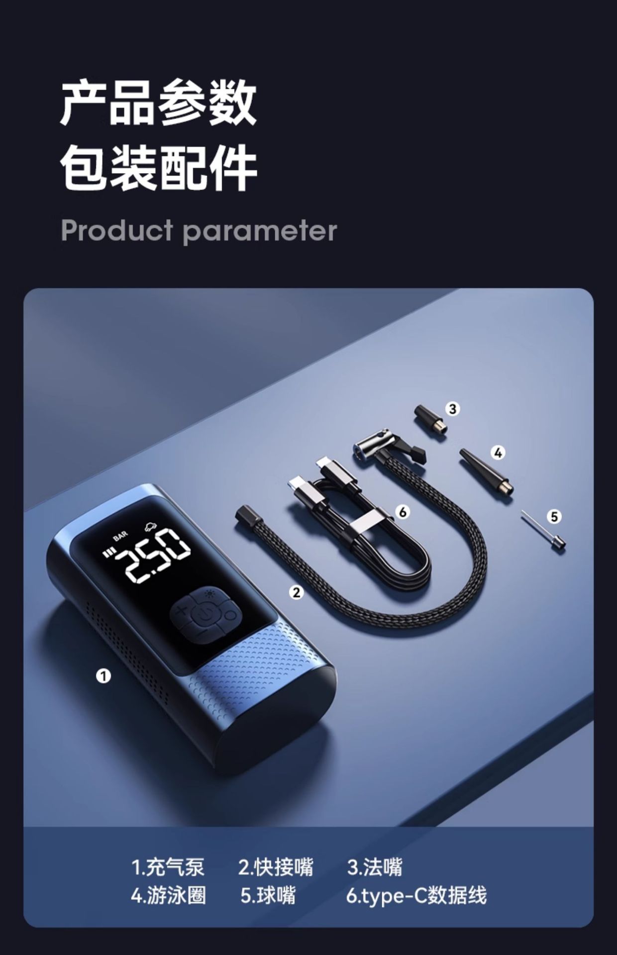 产品配件 充气管(20cm)1pcs,说明书1pcs,多功能气嘴套件1pcs,type-c充电线1pcs 包装方式 pe袋+邮购盒