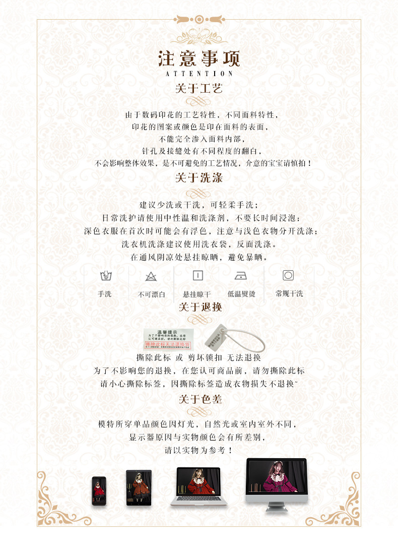 *洗涤说明:禁用肥皂 洗衣粉 等碱性洗涤用品