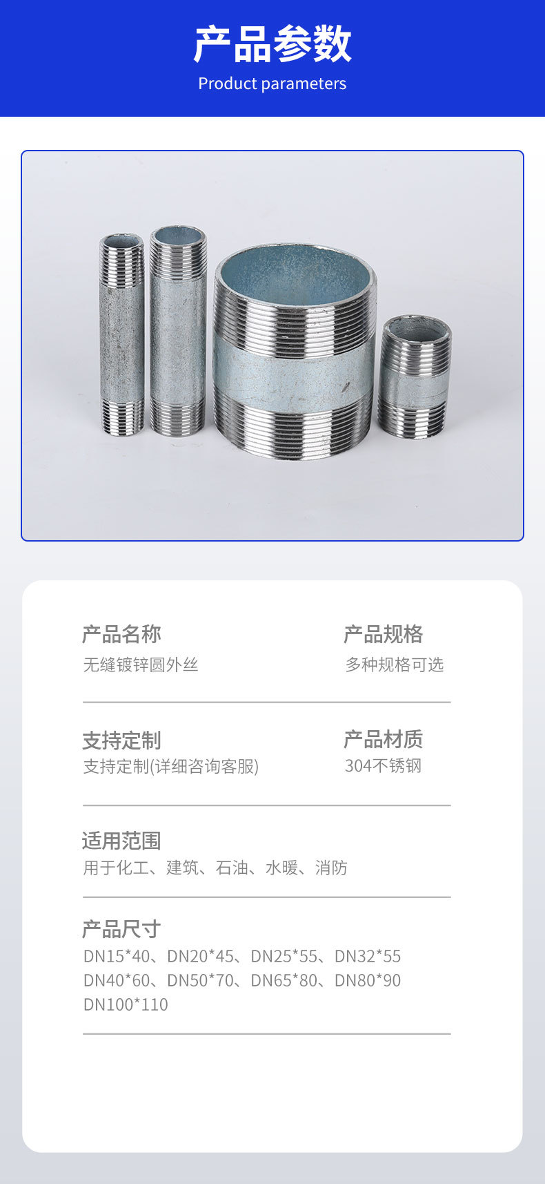 DN15*40; DN15*100; DN15*150; DN15*200; DN20*45; DN20*100; DN20*150; DN20*200; DN25*55; DN25*100; DN25*150; DN25*200; DN32*55; DN32*100; DN32*150; DN32*200; DN40*60; DN40*100; DN40*150; DN40*200; DN50*70; DN50*100; DN50*150; DN50*200; DN65*80; DN65*100; DN65*150; DN65*200; DN80*90; DN80*100; DN80*150; DN80*200; DN100*110; DN100*150; DN100*200