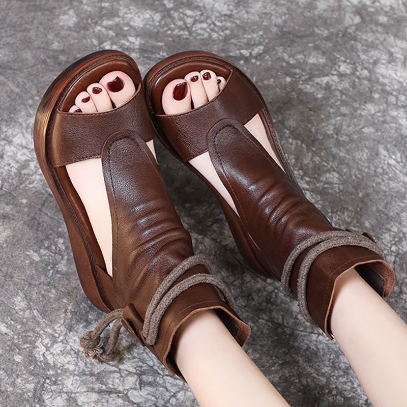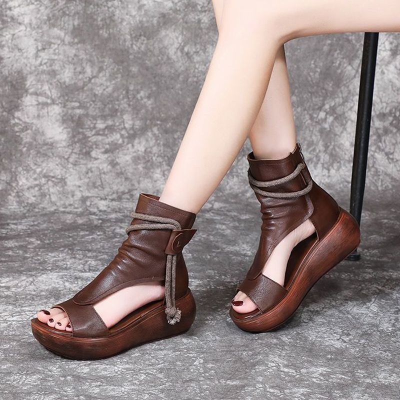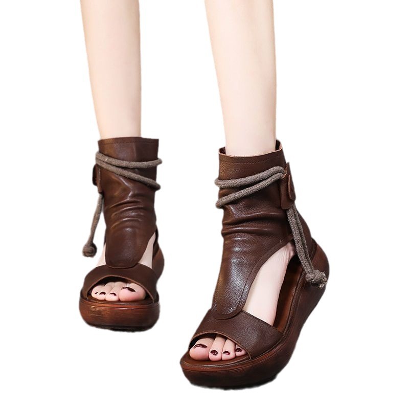 Сандалии с мягкой кожей и толстой подошвы женские мягкие подошвы с наклоном и ретро 2024 новый летний Рим высокий, чтобы увеличить национальный стиль