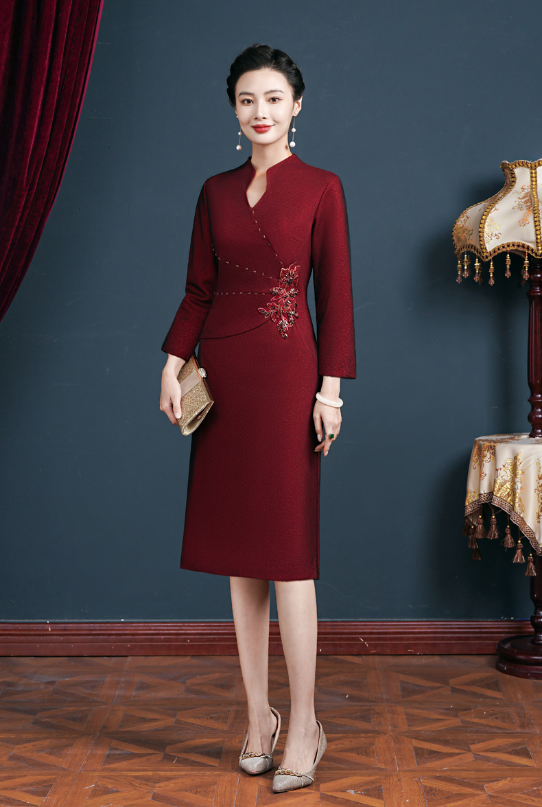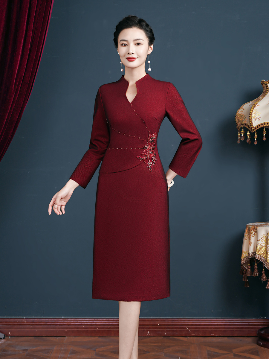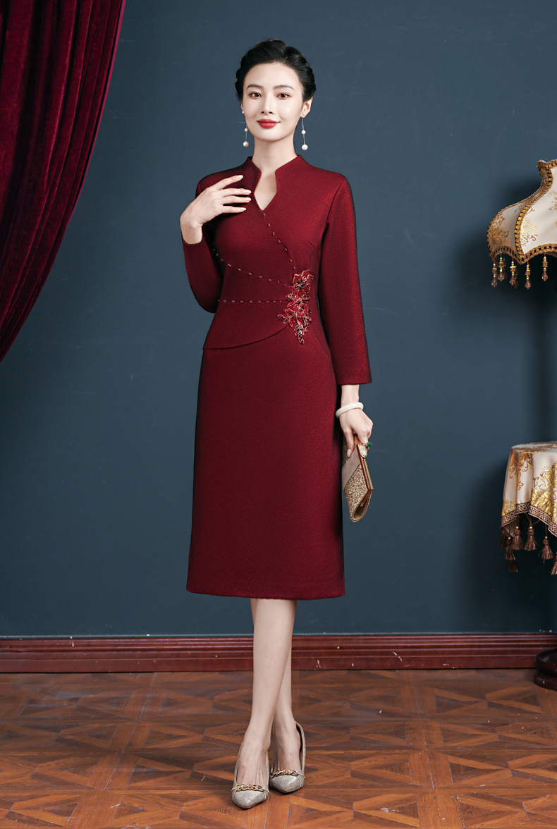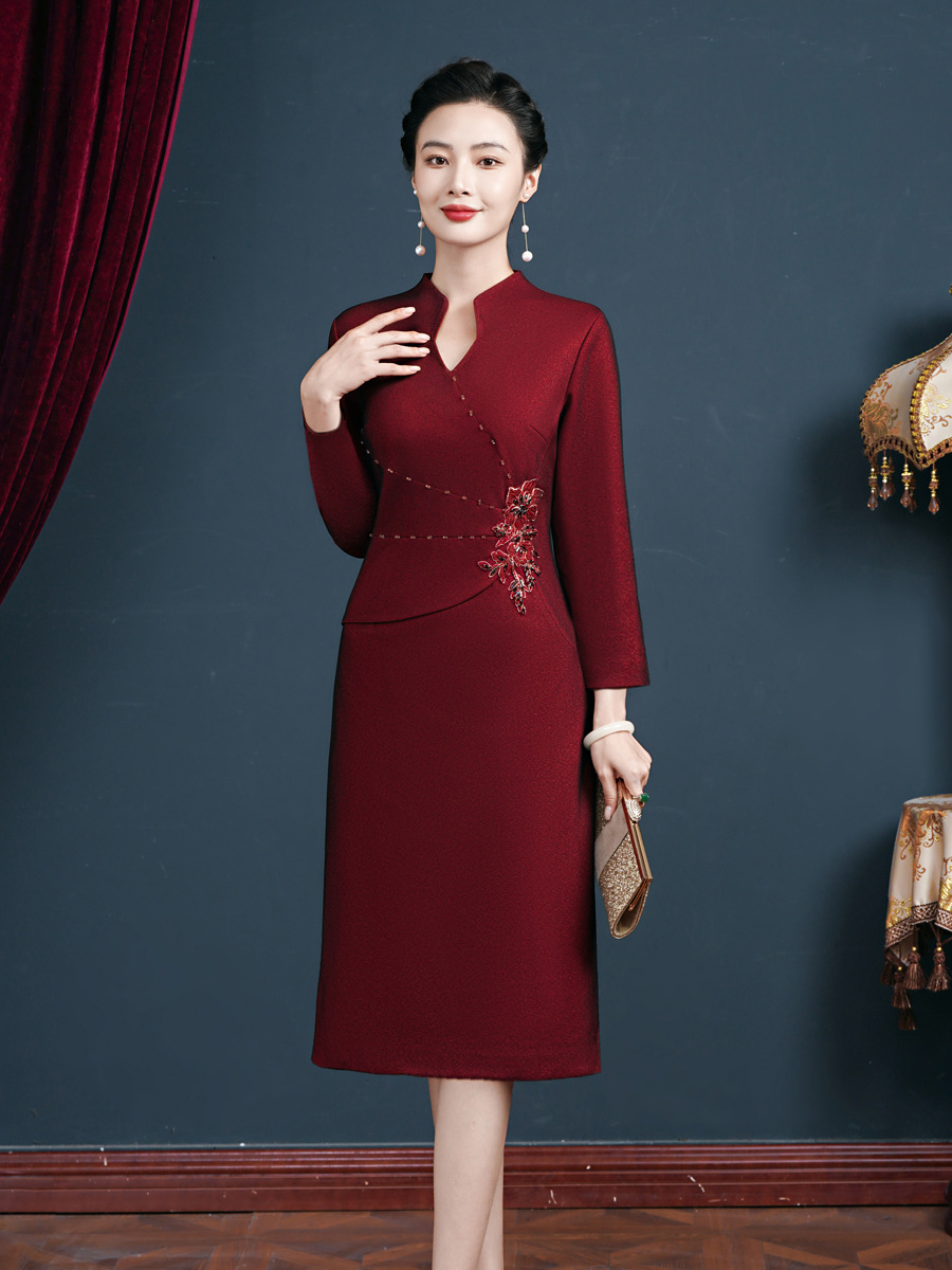 2024 новый осенний костюм мамы с талией и листьями винно-красного свадебного платья
