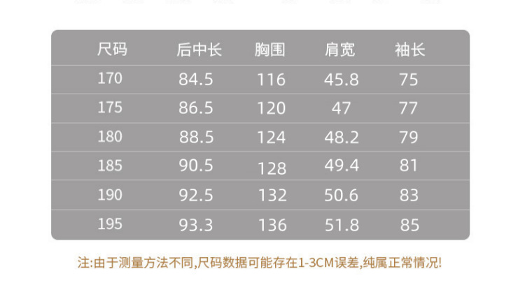 170/M; 175/L; 180/XL; 185/2XL; 190/3XL; 195/4XL