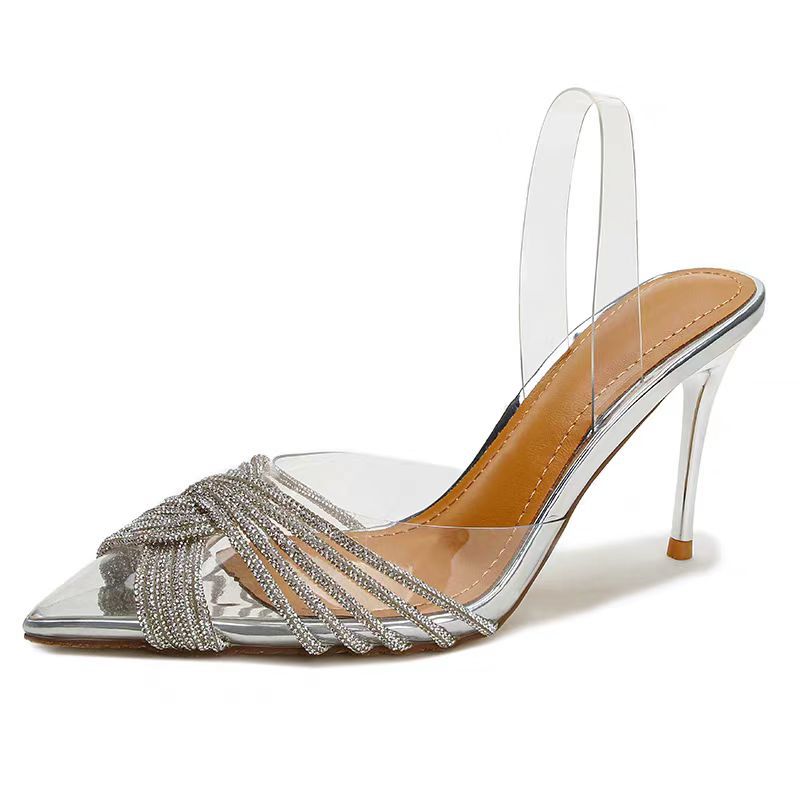 Однотонные босоножки на высоком каблуке с острым носком и прозрачными стразами, новинка лета 2024, популярная верхняя одежда, сексуальные женские сандалии-тапочки