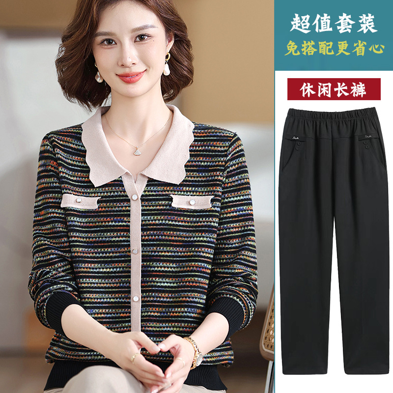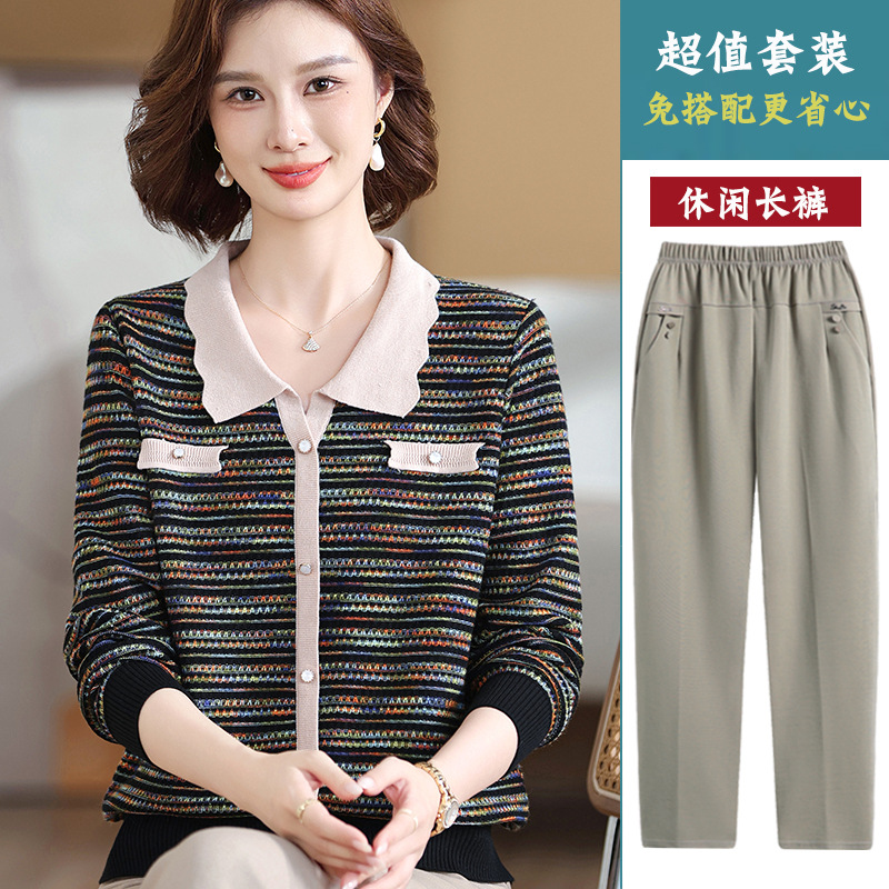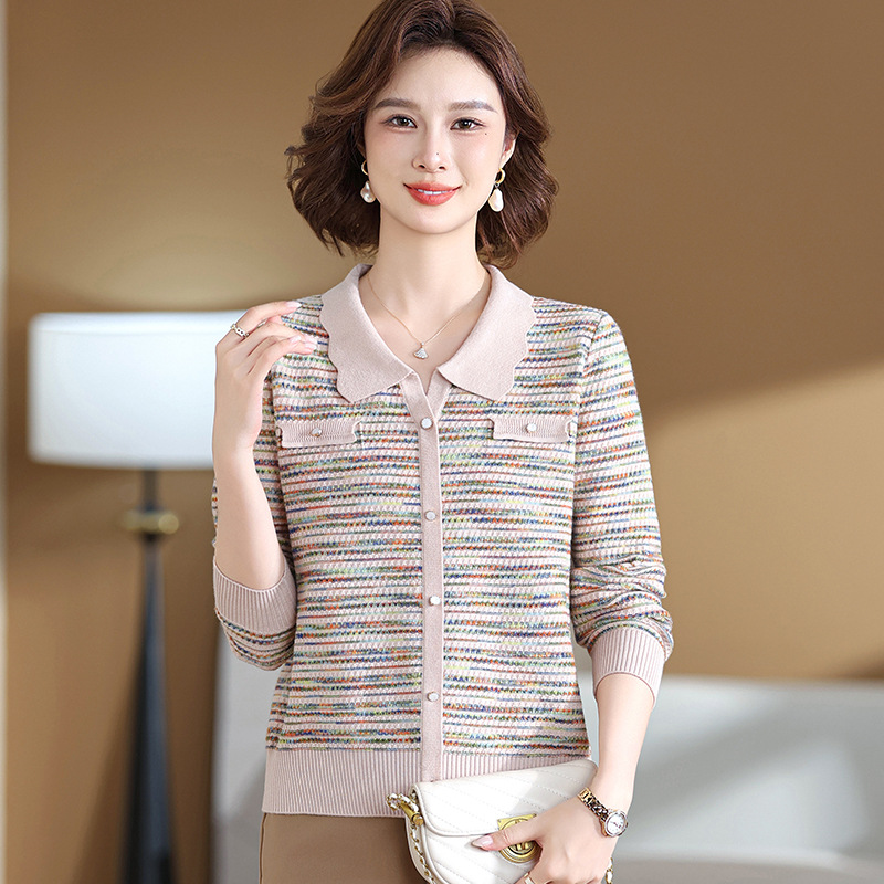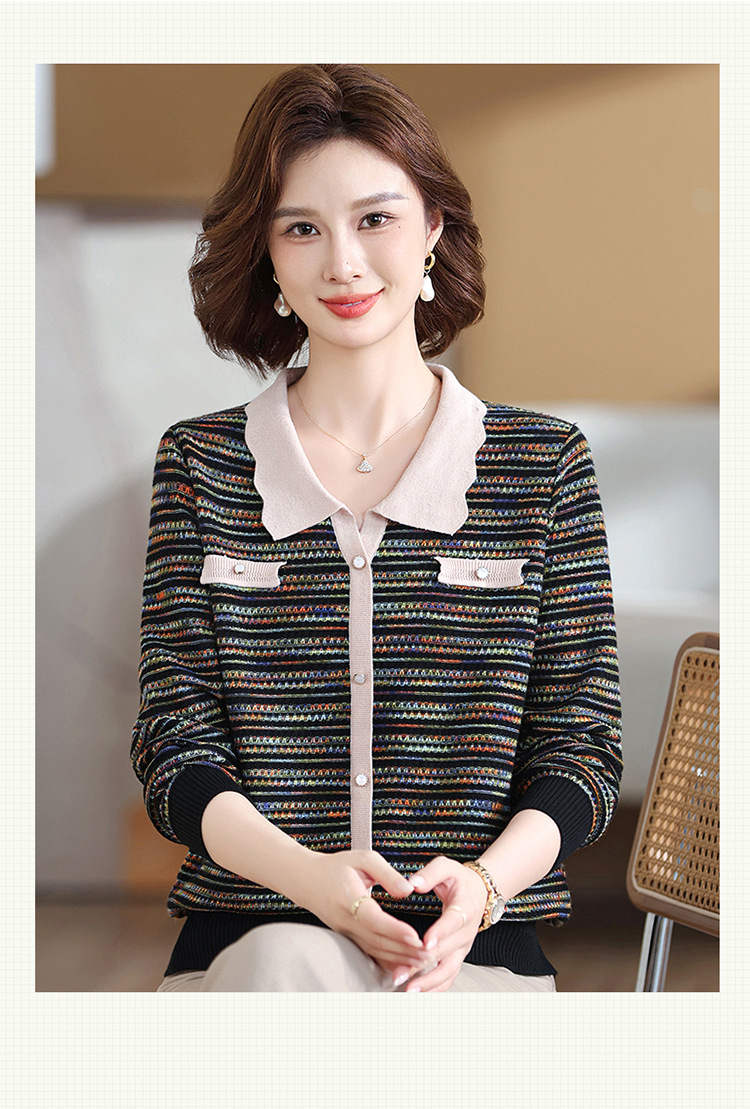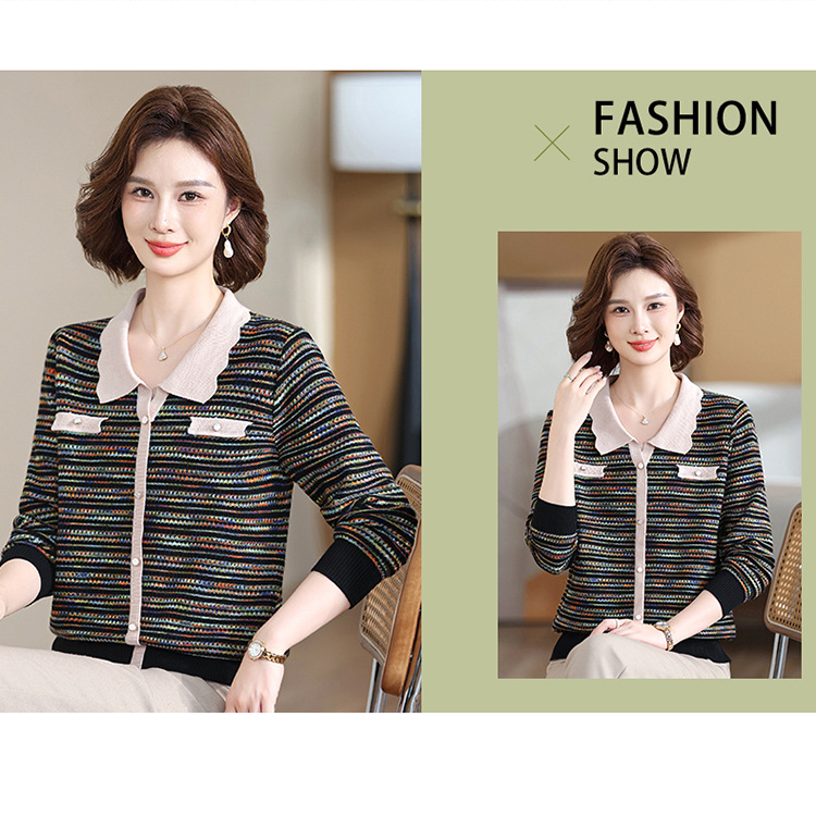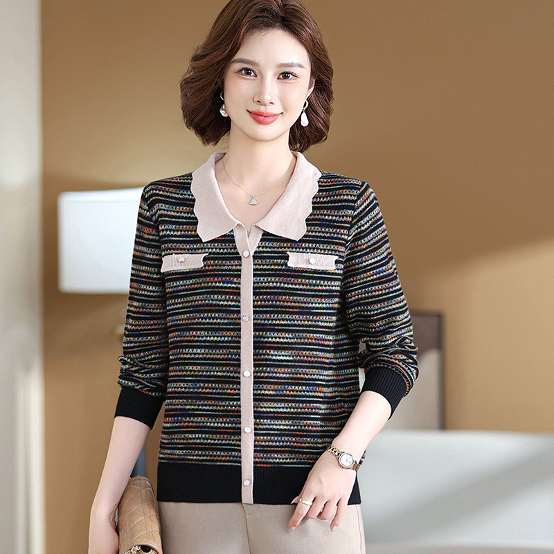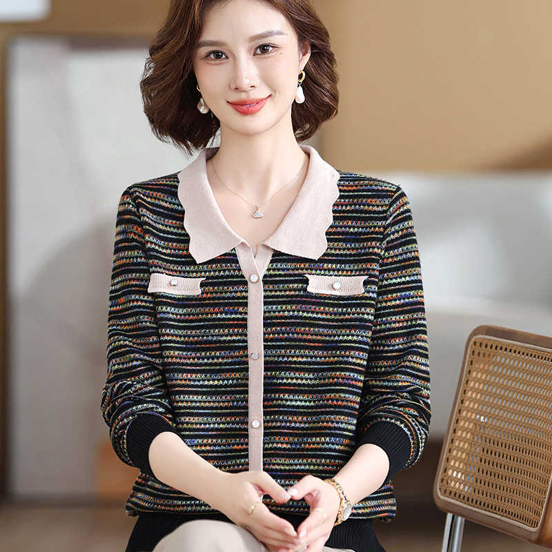 Темперамент мама новый осенний трикотажный отворот в полоску топ среднего возраста женская весенняя и осенняя футболка с длинными рукавами свитер